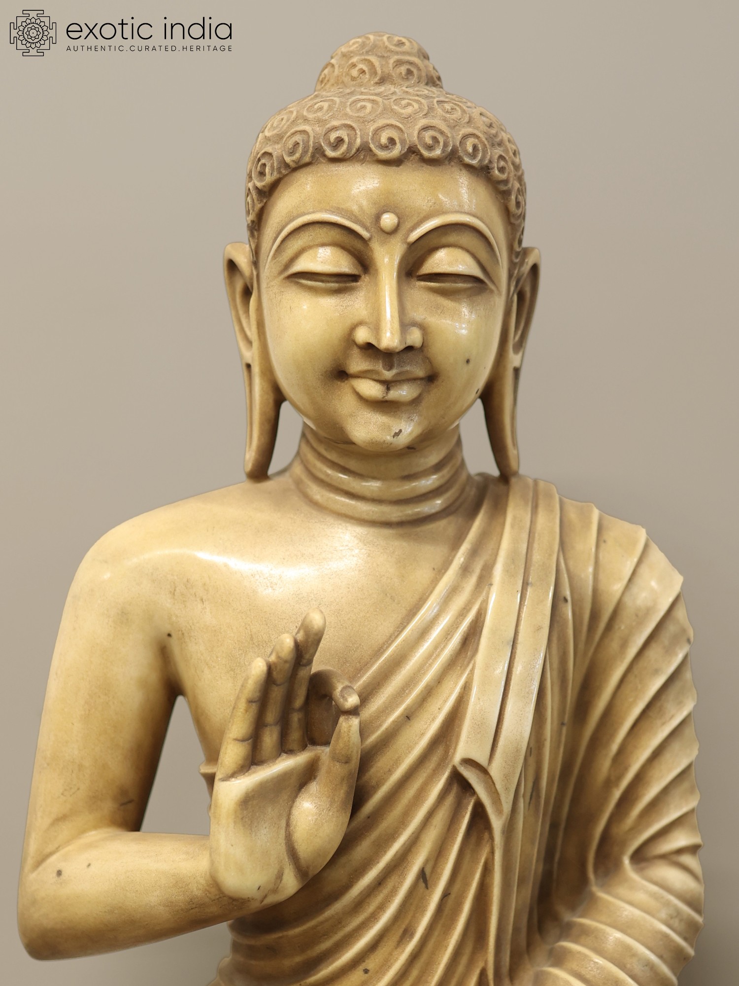 Carved from the finest marble, this sculpture is a testament to exceptional craftsmanship and artistic devotion. Each curve and fold of the monastic robes has been meticulously rendered, showcasing the sculptor's profound understanding of form and texture. The smooth, cool surface of the stone invites touch, while the subtle tonal variations enhance its lifelike presence, reflecting a tradition of Indian artistry passed down through generations.