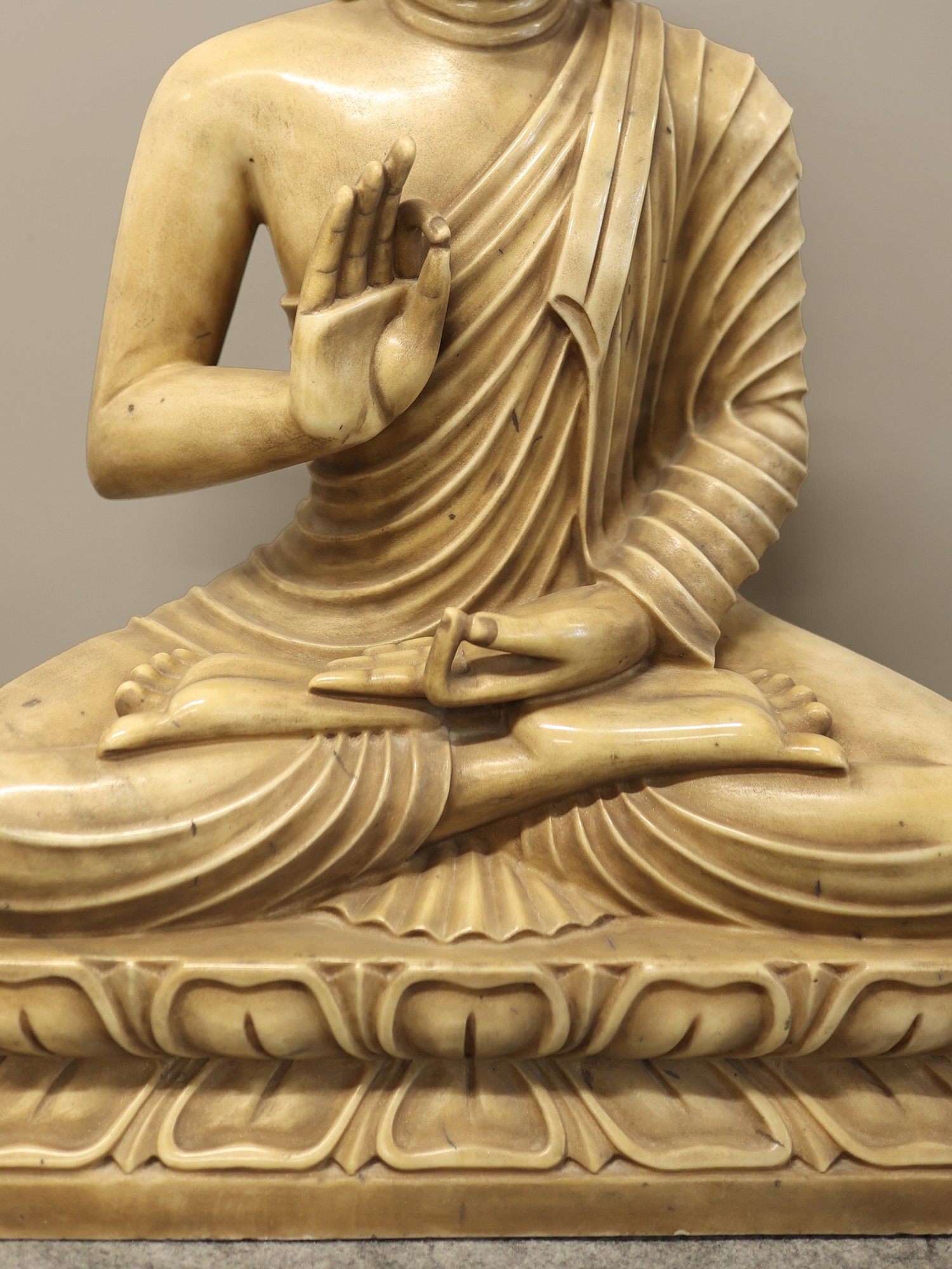 The gesture, known as the Vitarka Mudra, signifies the teaching or discussion of the Dharma, offering wisdom and dispelling doubt. You'll appreciate the serene expression, the gentle upward gaze, and the perfectly formed features that convey a sense of deep, compassionate awareness. Seated upon an ornate lotus pedestal, a symbol of purity and spiritual awakening, the figure commands attention with its dignified bearing and impressive 30-inch height, balanced by a substantial presence with a 20-inch width and 10-inch depth.