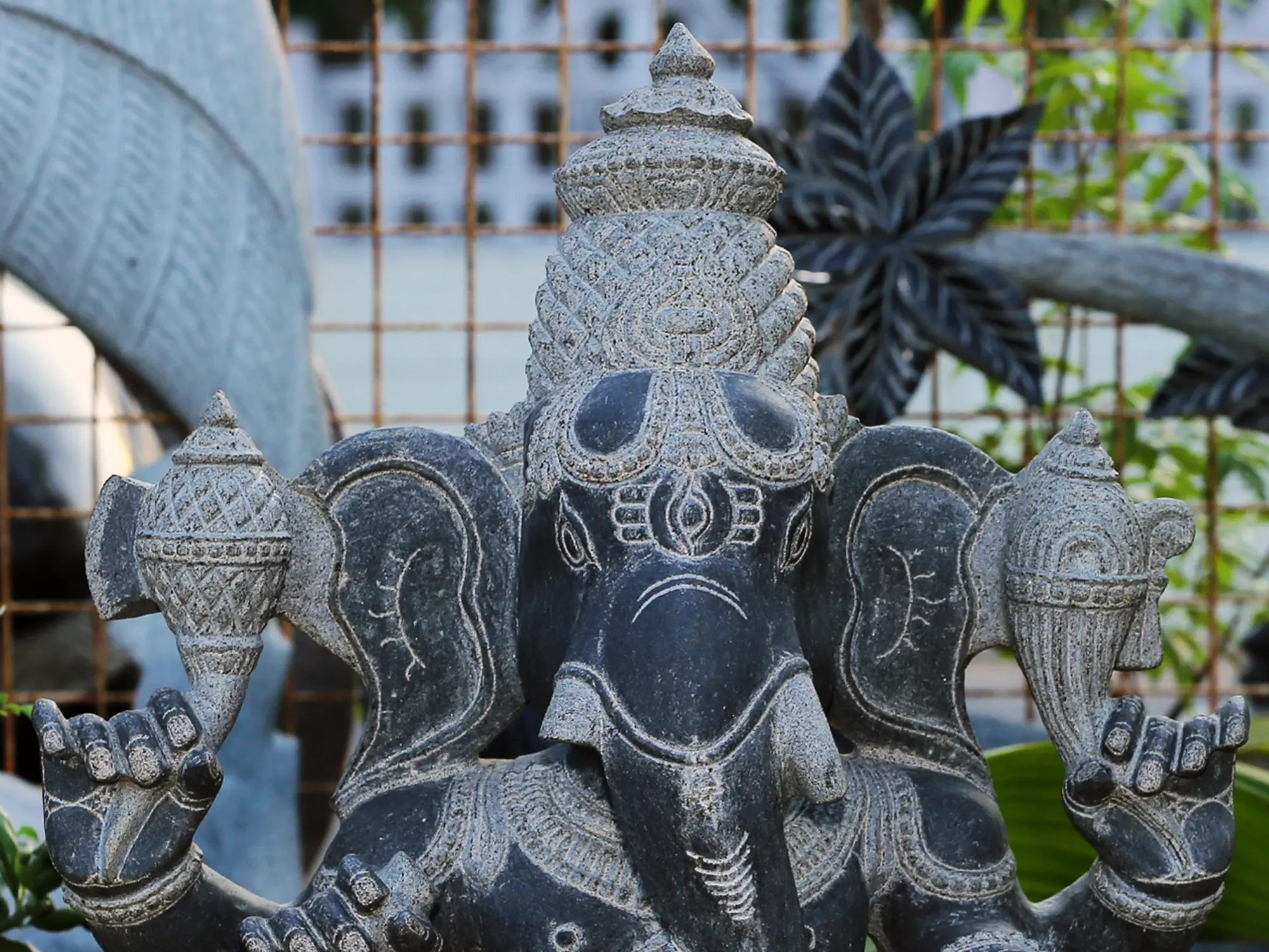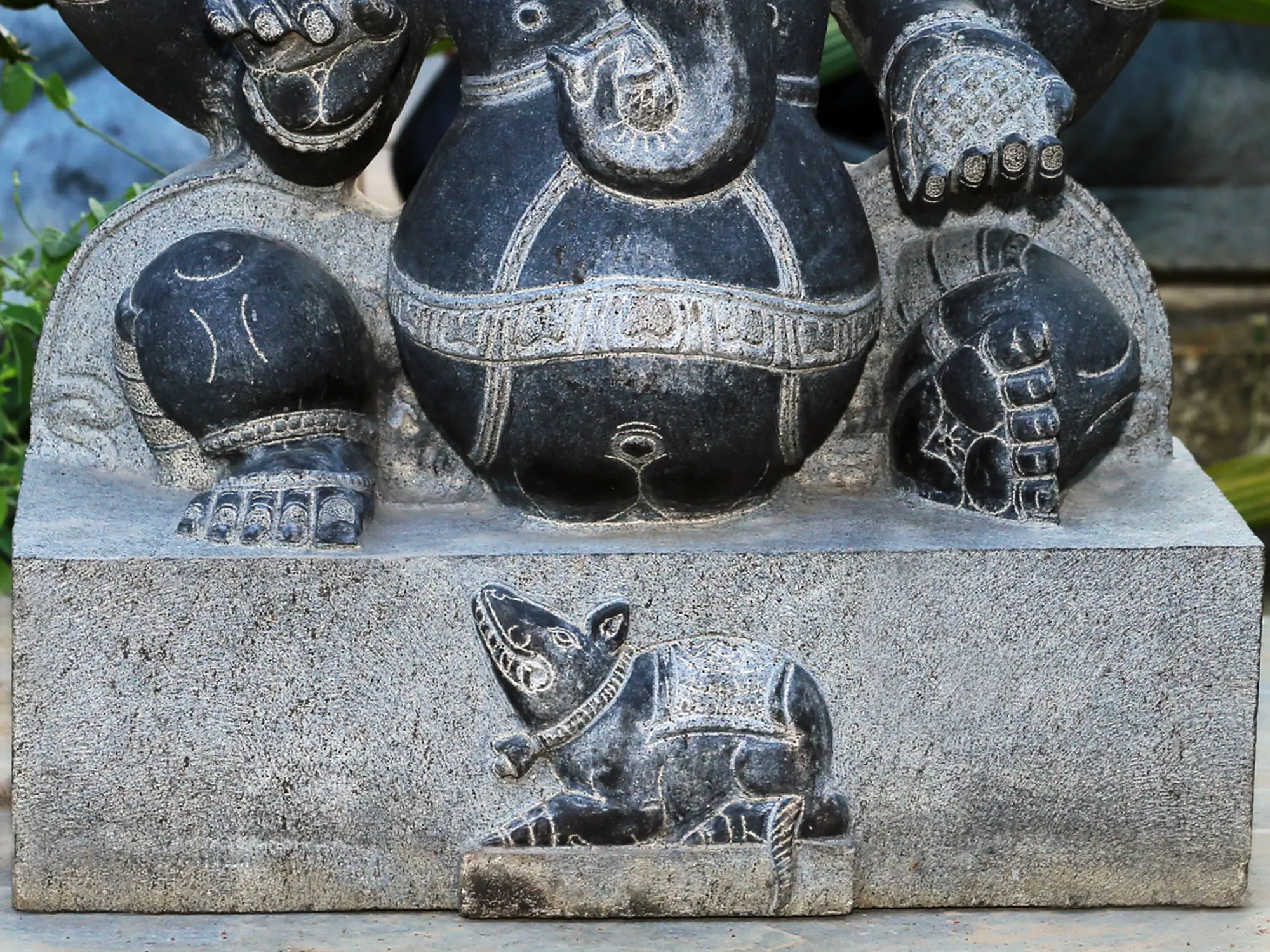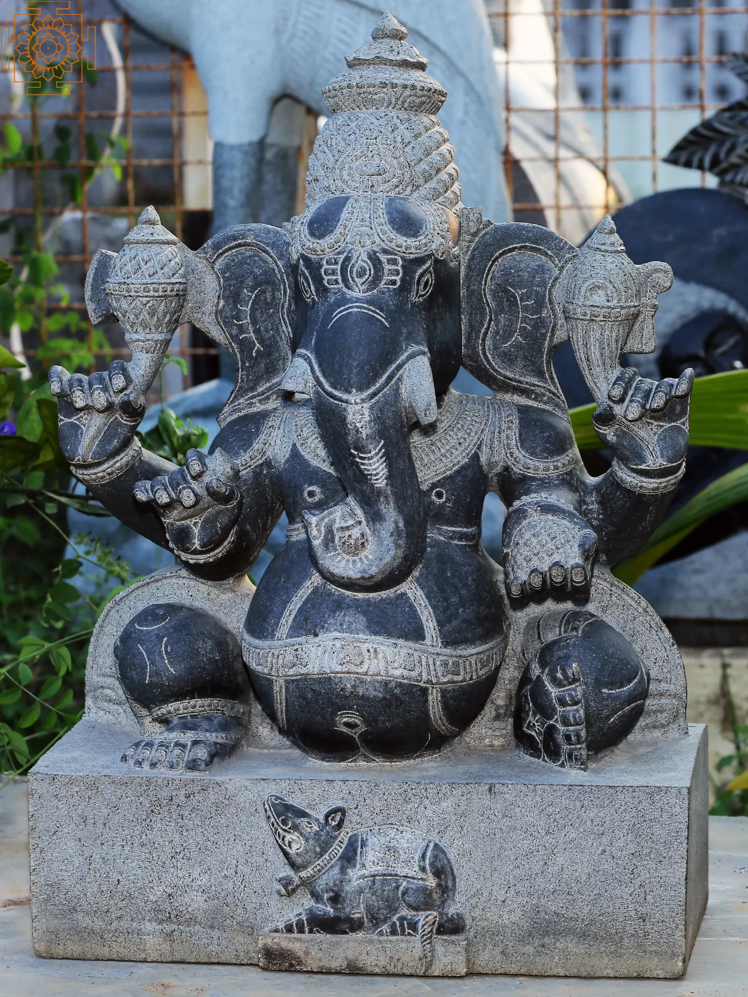 The 30" sitting Chaturbhuja Lord Ganesha statue is a magnificent representation of the beloved Hindu deity. Crafted with meticulous craftsmanship, the statue showcases Lord Ganesha in a seated position, adorned with intricate jewelry and garments. With four arms, each holding symbolic objects such as a lotus flower and an axe, Ganesha exudes power and grace. This statue holds immense significance in Hindu culture, symbolizing wisdom, prosperity, and the removal of obstacles. It serves as a divine presence, inspiring devotees to seek Ganesha's blessings and embark on their endeavors with confidence and divine guidance.