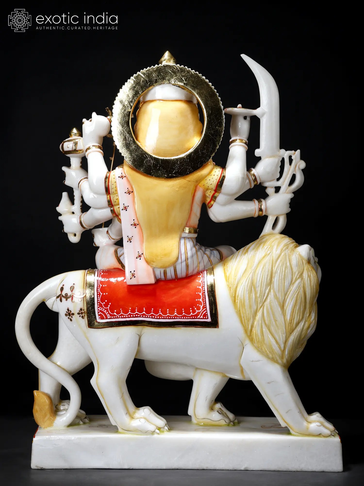 The goddess Adi Shakti, also known as Durga amongst the Hindu Shakta followers, in all her divine glory, can not be experienced and visualized by just everyone. It takes a devout and pure mind to comprehend her form, a task which is perfectly done by the maker of this exquisite marble sculpture of Maa Durga- the great mother of us all. Instead of her vigorous, attacking posture, Devi Durga sits tranquil, on the back of her mount lion, who himself has given up the viciousness he displays on the battlefield, and appears quite calm for a wild beast.