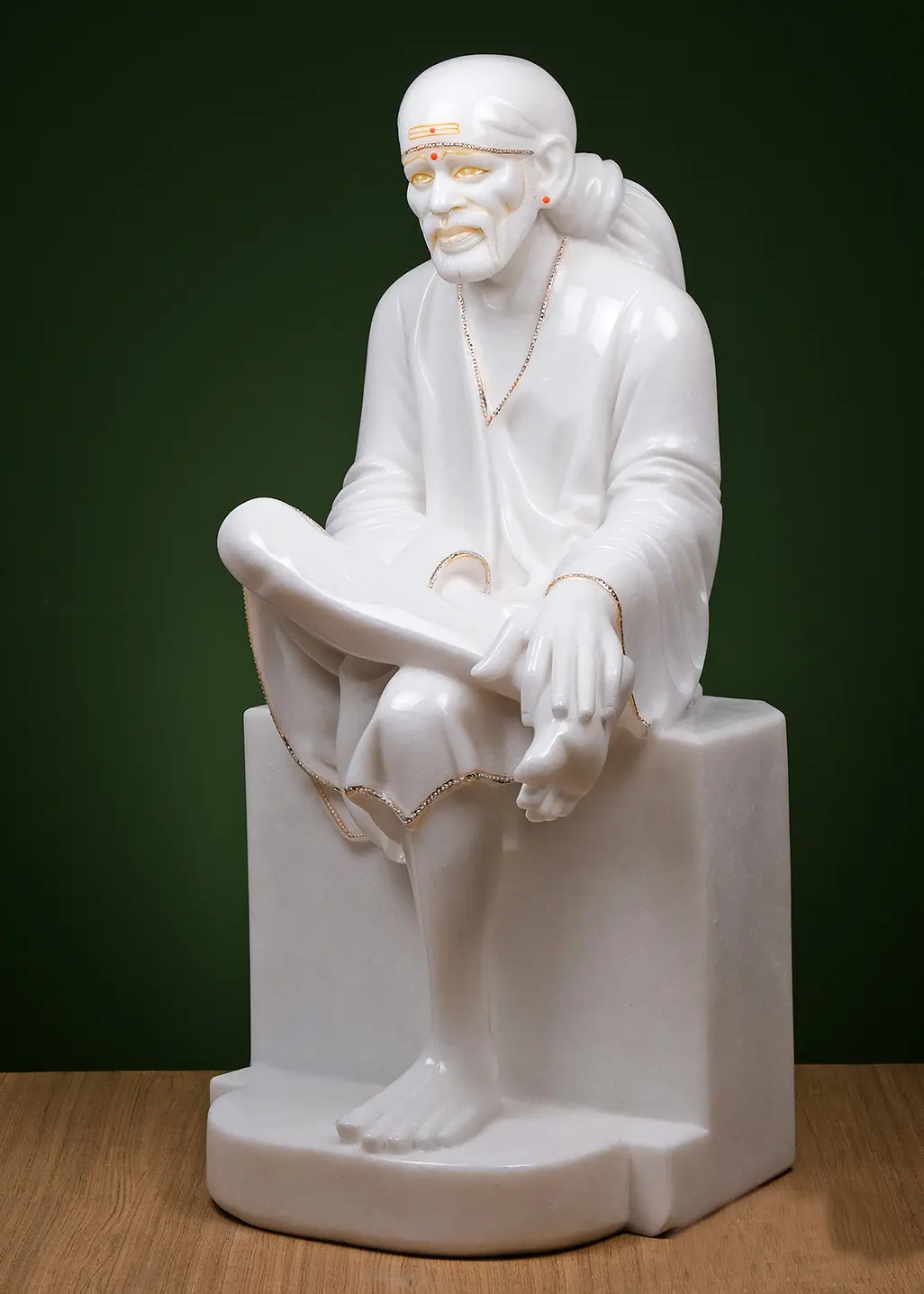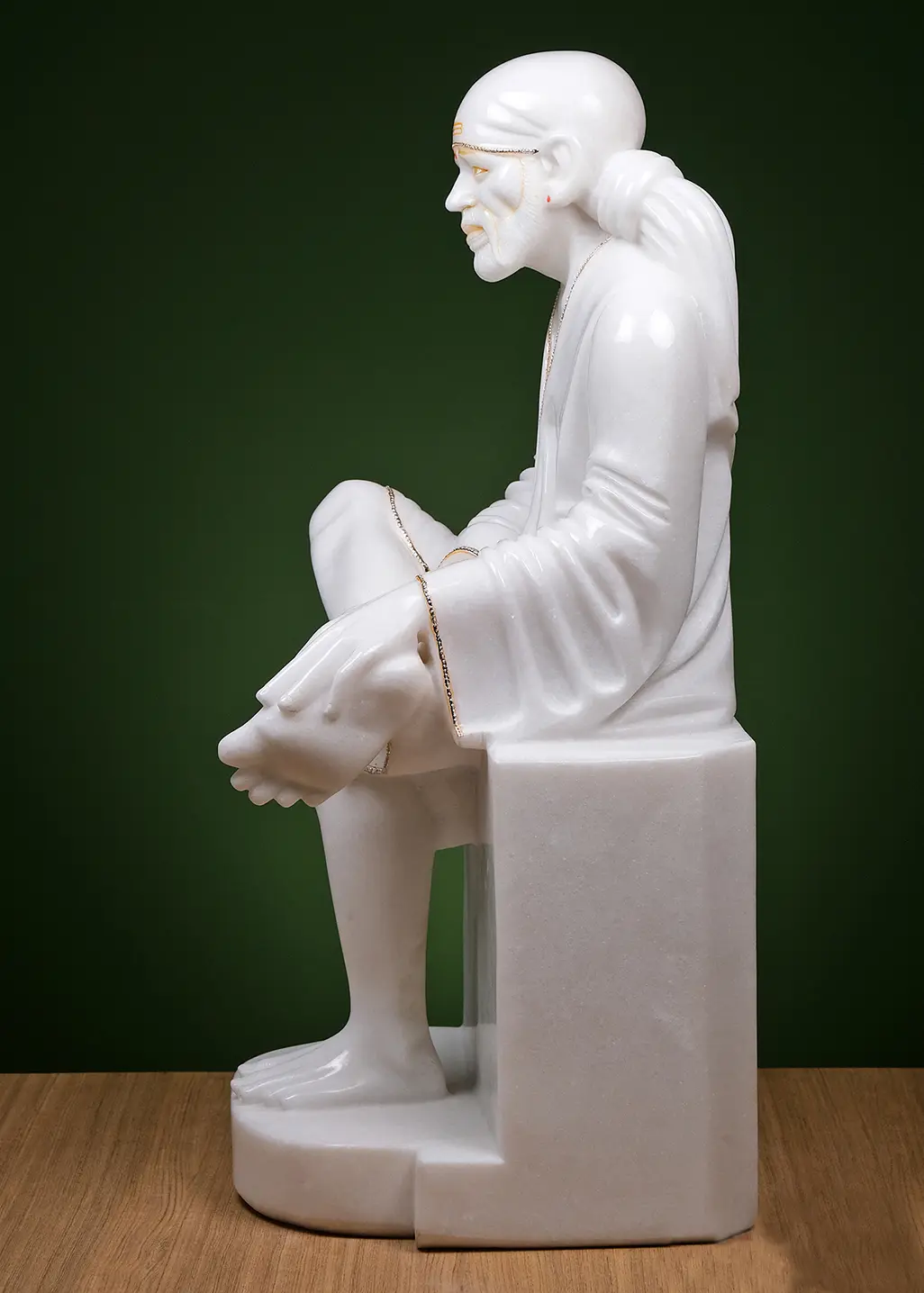 The choice of white marble for this statue is significant. Marble, with its natural luminescence and smooth texture, has been the medium of choice for sculpting deities and revered figures throughout history, often associated with celestial beauty and divine grace. This particular piece showcases the inherent beauty of the stone, enhanced by the artisan’s skillful hands. The flowing robes, meticulously detailed, give the impression of Sai Baba in contemplation, emanating a sense of calm and deep spiritual understanding. The subtle gold accents adorning the garment's edges and the delicate chain around his neck add a touch of regal splendor without detracting from the overall simplicity and purity of the form. The posture, with one leg crossed over the other, signifies a relaxed yet alert state of being, inviting devotees to approach with confidence and peace. This sculpture is more than just an idol; it is a conduit for divine connection, a focal point for prayer, and a beautiful piece of art that enriches any space with its spiritual and aesthetic appeal.
