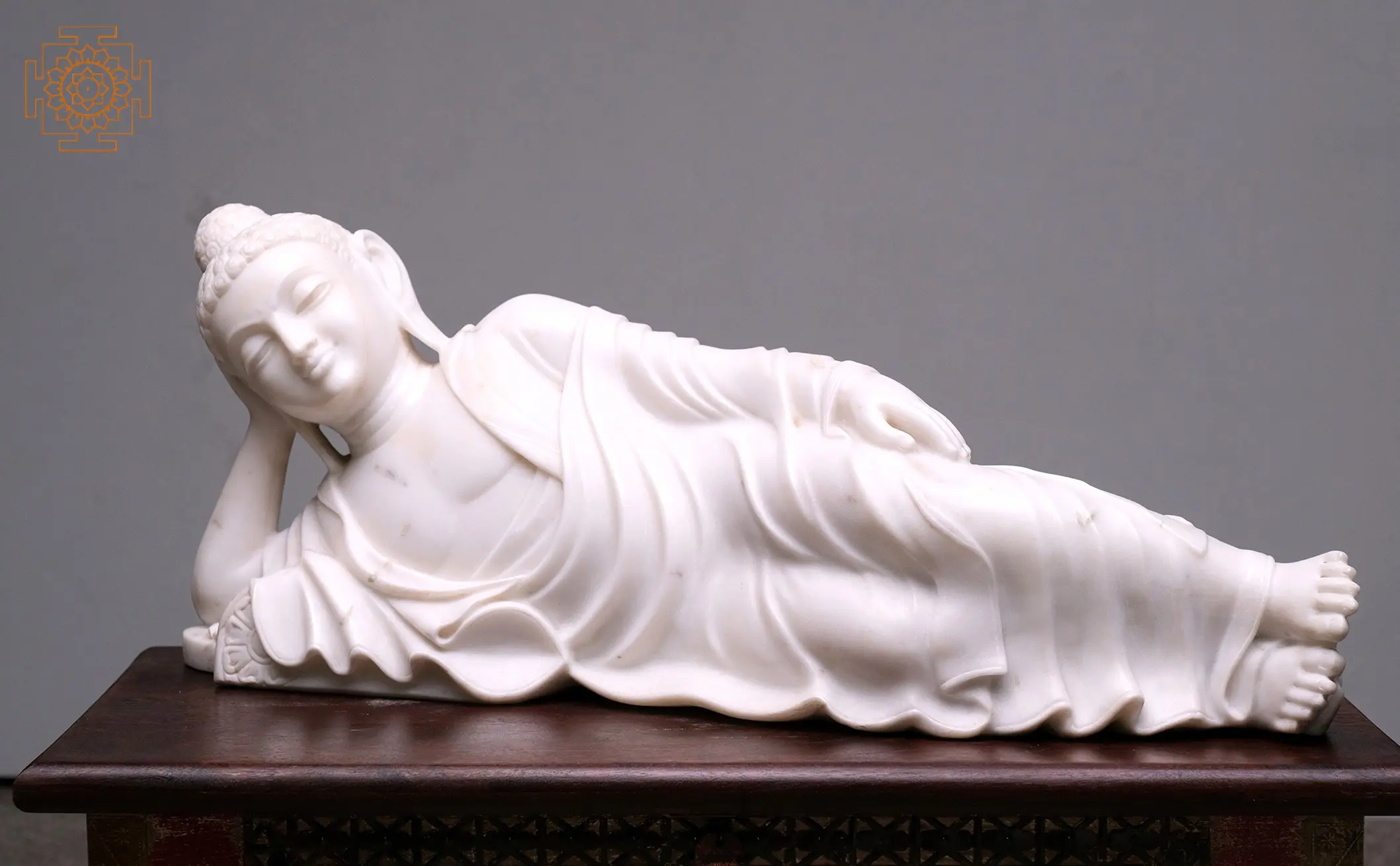This magnificent sculpture is a testament to the enduring tradition of stone carving, a craft deeply embedded in many ancient cultures. The choice of white marble evokes purity and divinity, reminiscent of sacred sites and revered idols found across Asia. The subtle yet impactful carving technique used here highlights the natural beauty of the stone, allowing the form of the Buddha to emerge with a lifelike grace. In Buddhist art, the reclining Buddha is a universally recognized symbol of peace and wisdom. Placing this sculpture in your home or meditation space can create an atmosphere conducive to spiritual growth and the cultivation of positive energy. It is more than just a decorative item; it is a tangible connection to a rich spiritual heritage and a timeless symbol of enlightenment.
