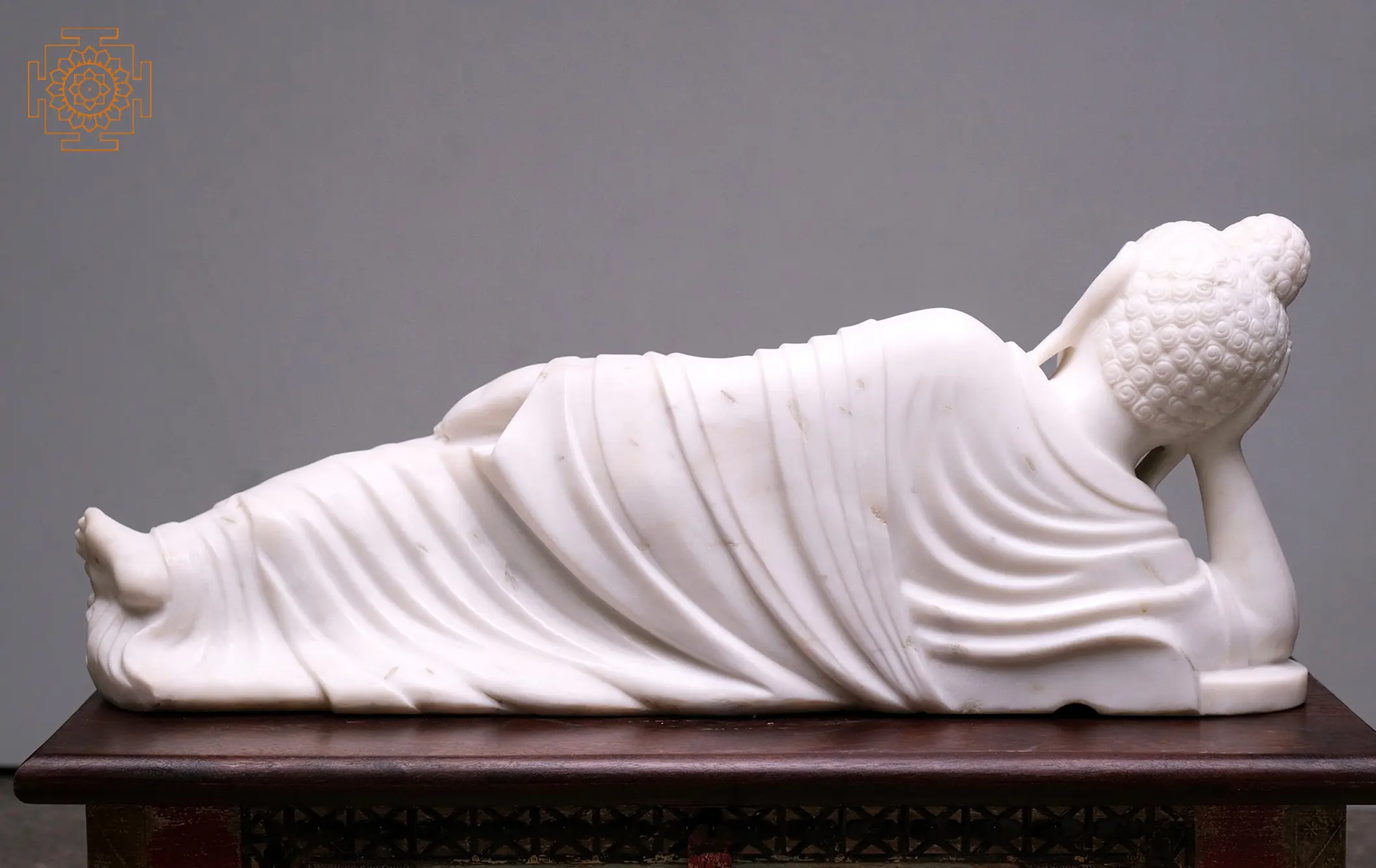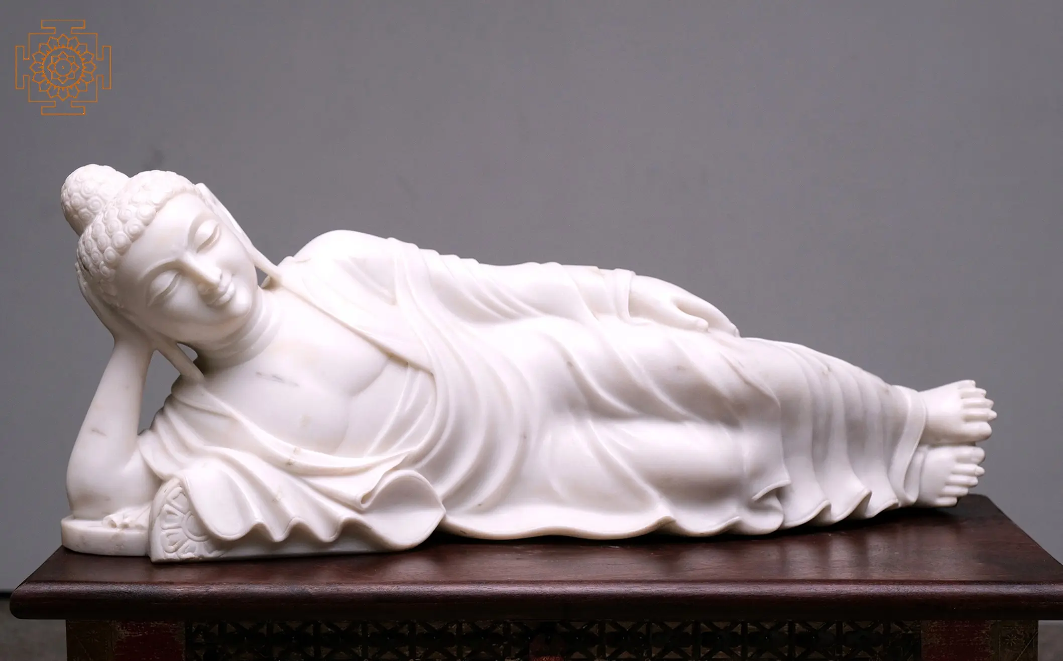 Experience a profound sense of peace and tranquility with this exquisite hand-carved sculpture of the reclining Buddha. Crafted from pristine white marble, this piece captures the serene countenance and graceful repose of the enlightened one. The smooth, cool surface of the marble lends an ethereal quality to the sculpture, inviting contemplation and calm. Each detail, from the gentle curve of the Buddha's smile to the delicate folds of his robes, has been meticulously rendered by skilled artisans, ensuring a masterpiece that resonates with spiritual depth.