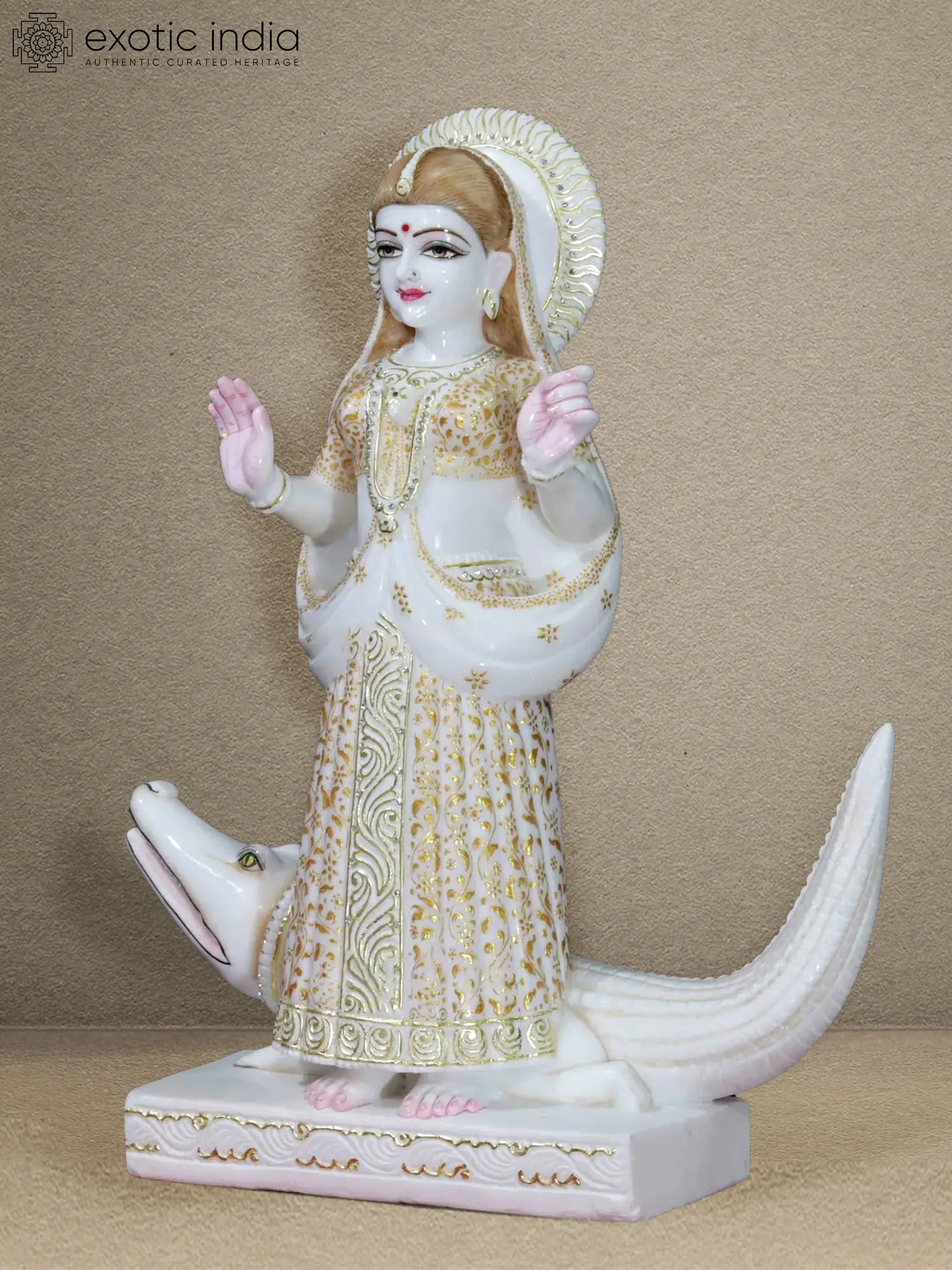 15" Khodiyar Mata With Angry Crocodile | White Makrana Marble Statue