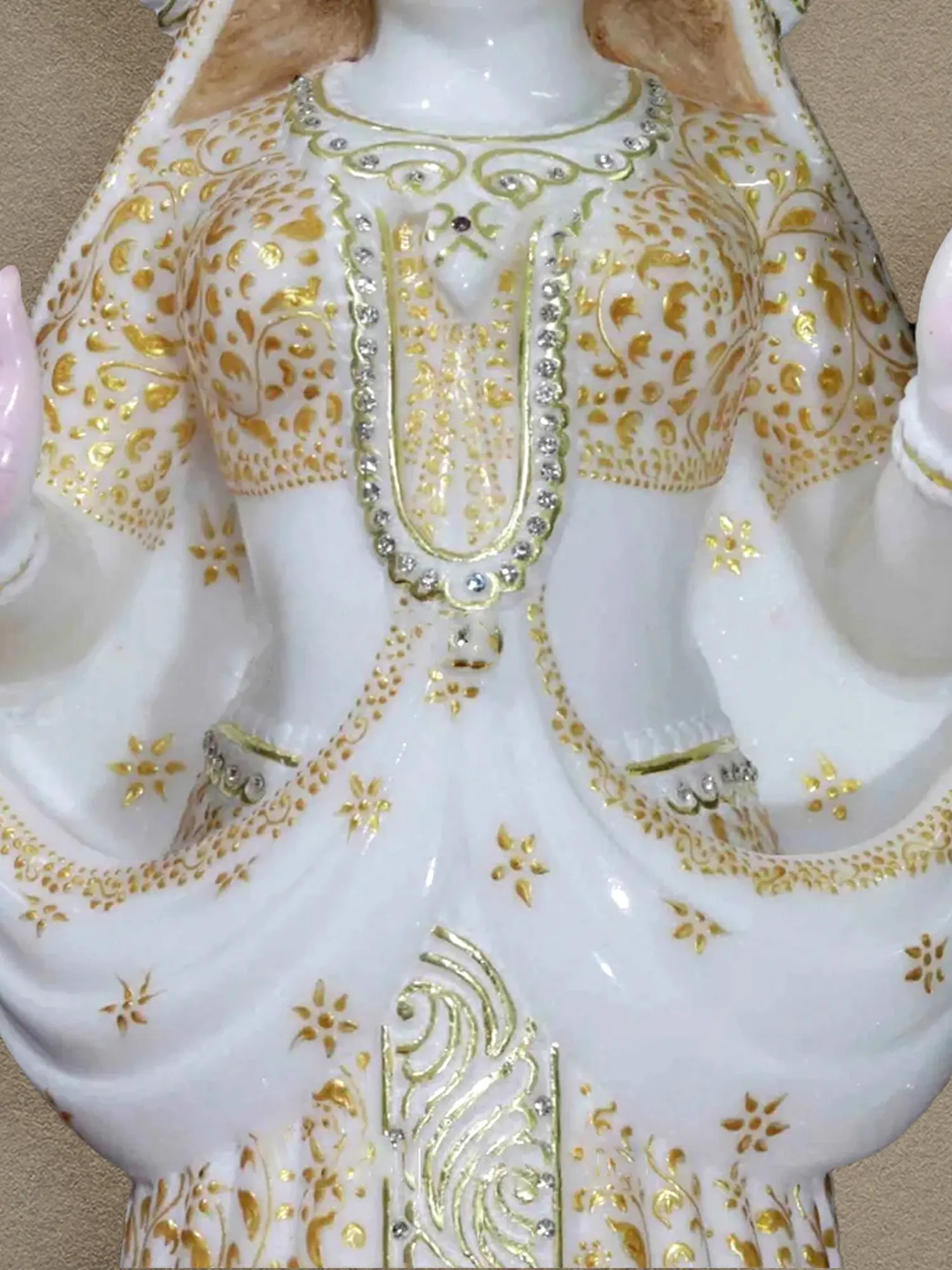 The choice of Makrana marble, sourced from the ancient quarries of Rajasthan, imbues the sculpture with a timeless quality. This marble has been used for centuries in the creation of magnificent temples and mausoleums, including the iconic Taj Mahal, signifying its association with enduring beauty and sacredness. The pure white hue of the marble is believed to represent purity, spirituality, and peace, making it an ideal medium for representing a benevolent deity. The subtle pink blush on the goddess's feet and hands adds a touch of delicate realism, while the subtle golden accents on her clothing and the halo create a shimmering effect, hinting at her celestial radiance. Placing this Khodiyar Maa idol in your home or sacred space is an invitation to invoke her protective blessings, seek her guidance, and welcome an atmosphere of peace and prosperity. It serves as a constant reminder of inner strength, the power of devotion, and the enduring grace of the divine feminine. This masterpiece is not just a decorative piece but a conduit for spiritual connection and a beautiful expression of faith, crafted to inspire and uplift for generations to come.