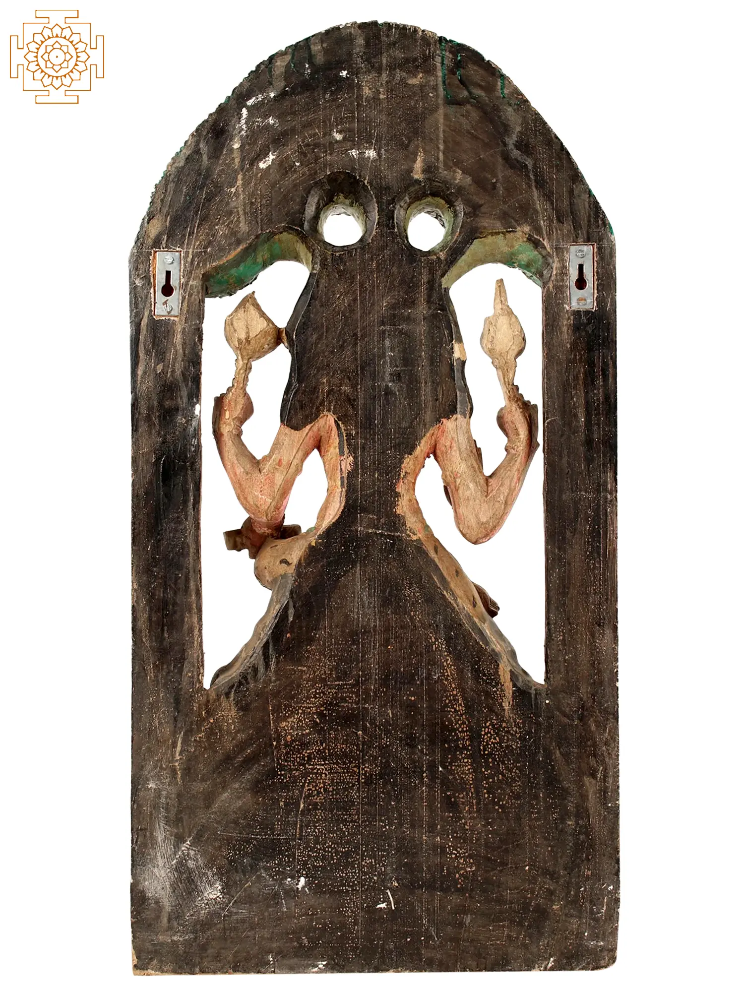 This exquisite wooden wall panel captures the serene and profound essence of Dakshinamurthy, a form of Lord Shiva that embodies the divine guru, the ultimate teacher of knowledge and wisdom. Carved with meticulous detail, this piece radiates a timeless aura, making it a captivating centerpiece for any sacred or meditative space. The figure of Shiva, seated in a meditative posture atop a rocky eminence, is presented with four arms, each holding symbolic objects that represent his divine attributes. The intricate carving of the arched backdrop, adorned with floral motifs and stylized leaves, evokes the natural setting where Dakshinamurthy is often depicted imparting knowledge under a banyan tree. The aged patina and subtle coloring enhance the depth and texture of the wood, imbuing the panel with a sense of antiquity and spiritual gravitas. The craftsmanship speaks of generations of dedication to the art of wood carving, a tradition deeply rooted in the cultural heritage of India.