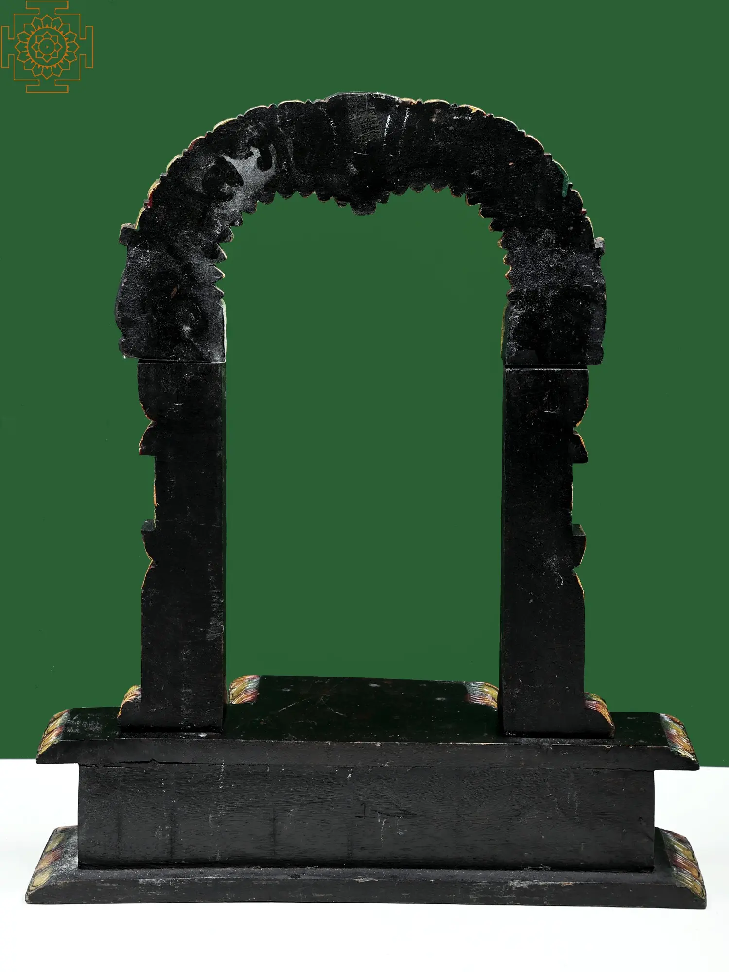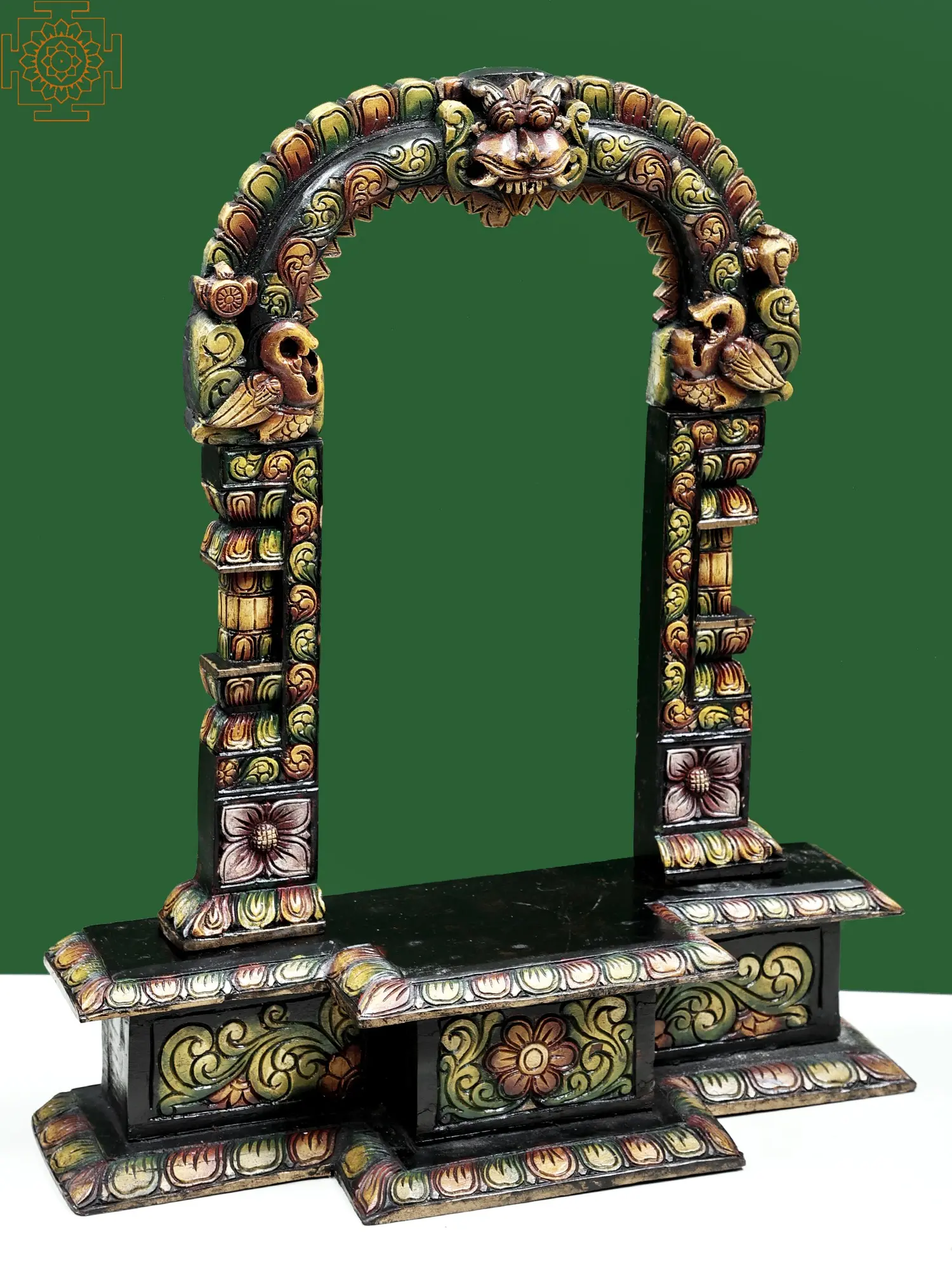 The Wooden Kirtimukha Prabhavali is a masterpiece of craftsmanship, skillfully handmade with precision and dedication. The Parbhavali resembles the Thammampatti style of wood carving and painting. This exquisite creation features an intricately carved Kirtimukha Prabhavali design, showcasing cultural richness and artistic finesse. Crafted from wood, it has a commanding presence, making it a striking wall hanging or decorative accent. The detailed craftsmanship reflects the artisan's expertise, capturing the essence of tradition and spirituality. As a handmade work of art, it not only serves as a visual delight but also stands as a testament to the timeless beauty, cultural heritage, and meticulous skill involved in its creation.