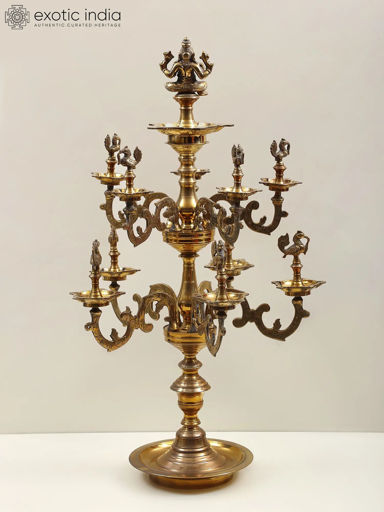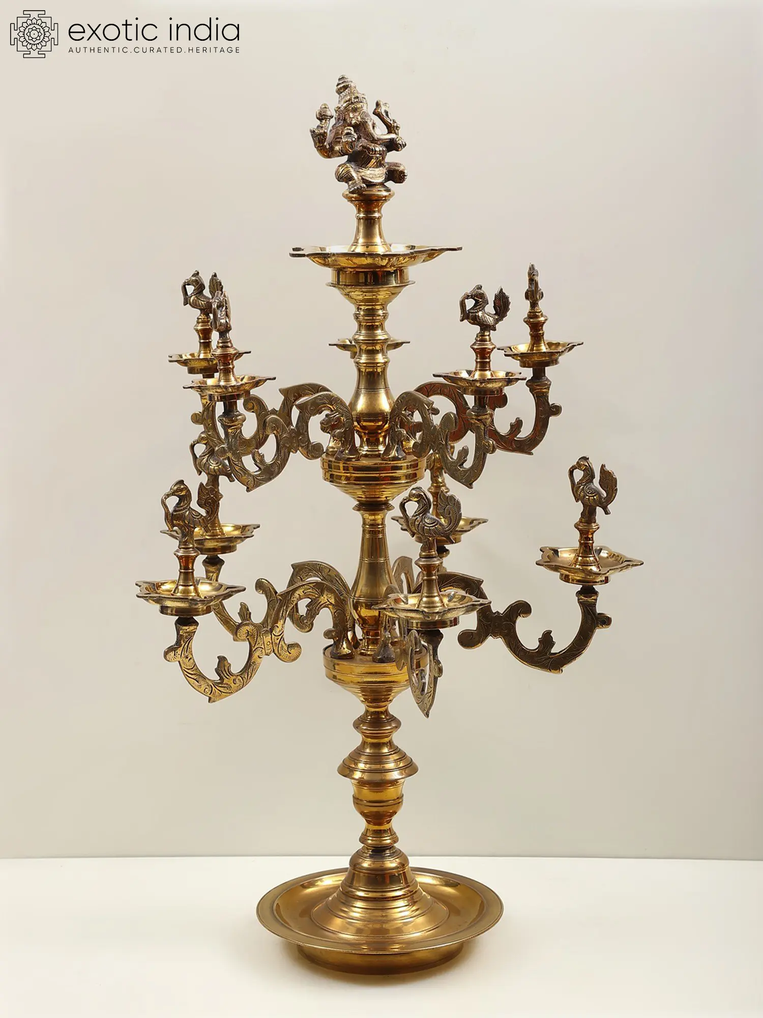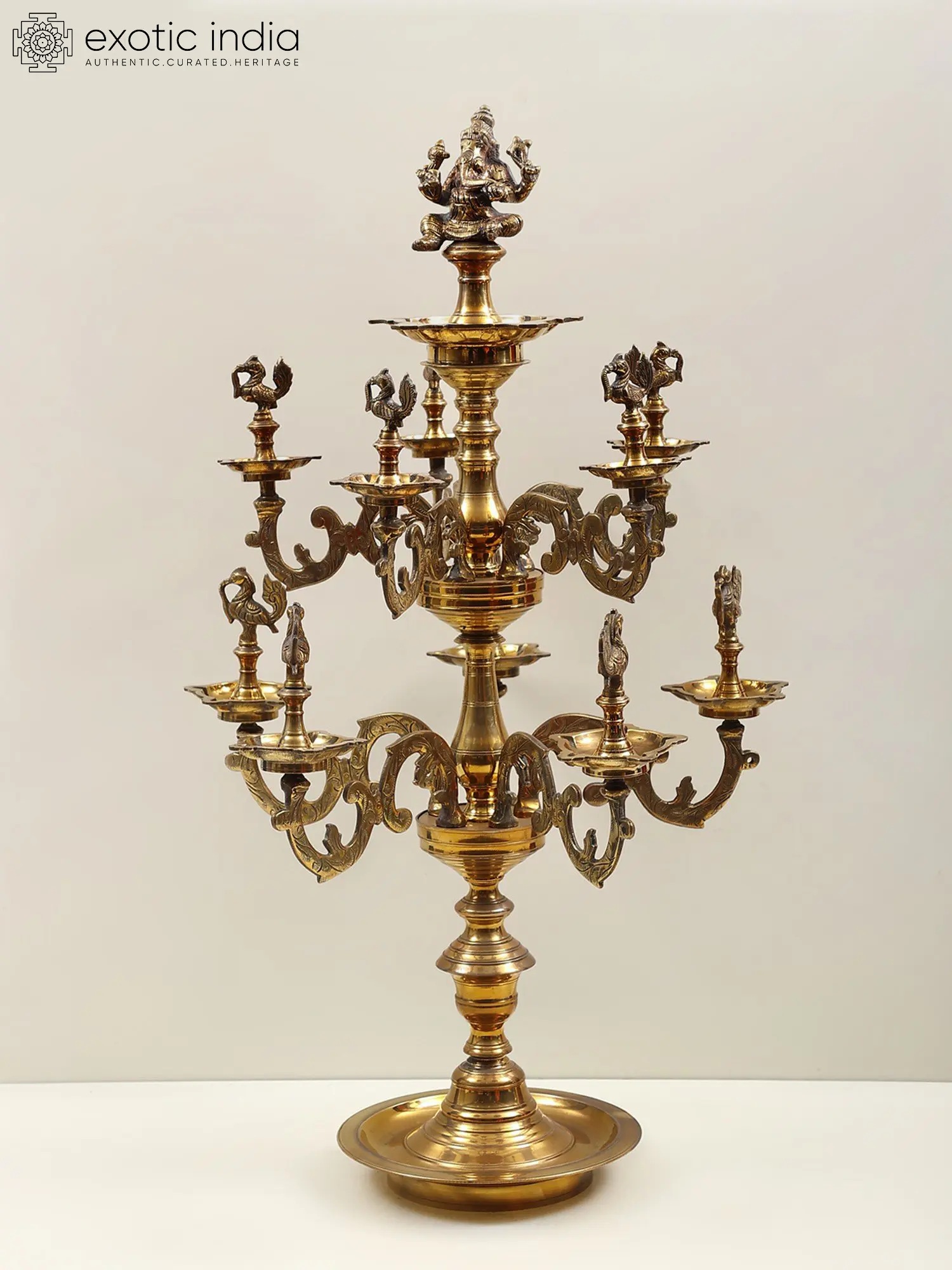 Branching oil lamps, also known as Ashtothira Deepams, are often made of brass or bronze. They get their name from the 108 wicks that hang from the branching metal handles of the lamps. These lamps may have fewer wicks, yet they are still known as Asthothira Deepam. The 108 candles pay homage to the divine number 108, which is related to the 108 Mukhya Shivaganas and the 108 edges of Lord Vishnu's sacred discus, Sudarshan Chakra. The spiritualism of this brass lamp has been accentuated in this lamp with the help of the sacred images of peacocks and Lord Ganesha. The picture of Lord Ganesha on the lamp's crown offers warmth to the lamp with Shubh or auspiciousness.