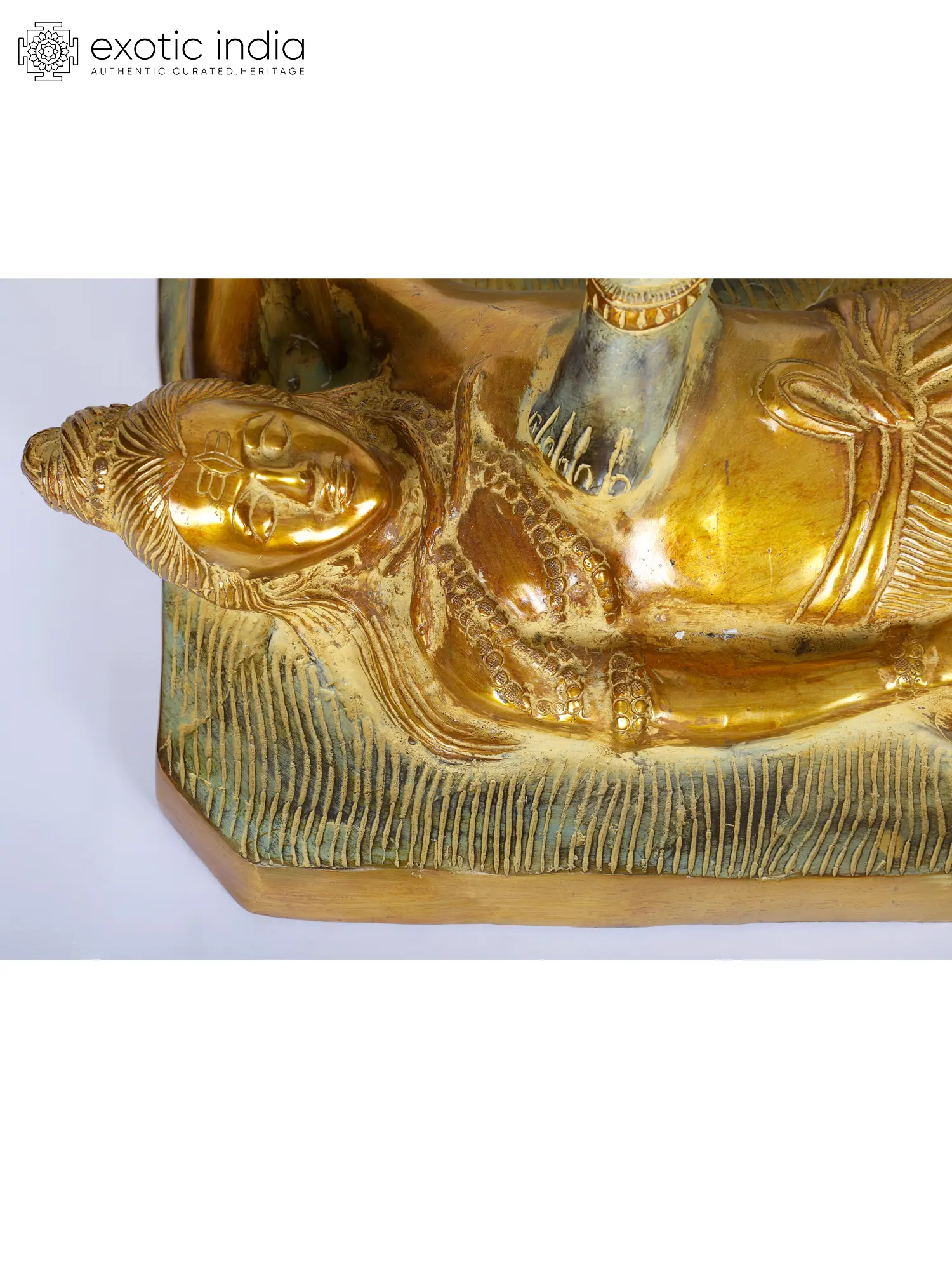 This Large Goddess Kali Standing on Lord Shiva statue is made of brass. It depicts Goddess Kali in the Chaturbhuj form. Chaturbhuj Kali is a fierce manifestation of Goddess Kali and is depicted with potent symbolism in Hindu iconography. With two hands holding an axe and Trishul (trident), she signifies the destruction of ignorance and evil forces. In her third hand, she holds a severed head, symbolizing the triumph over ego and negativity.