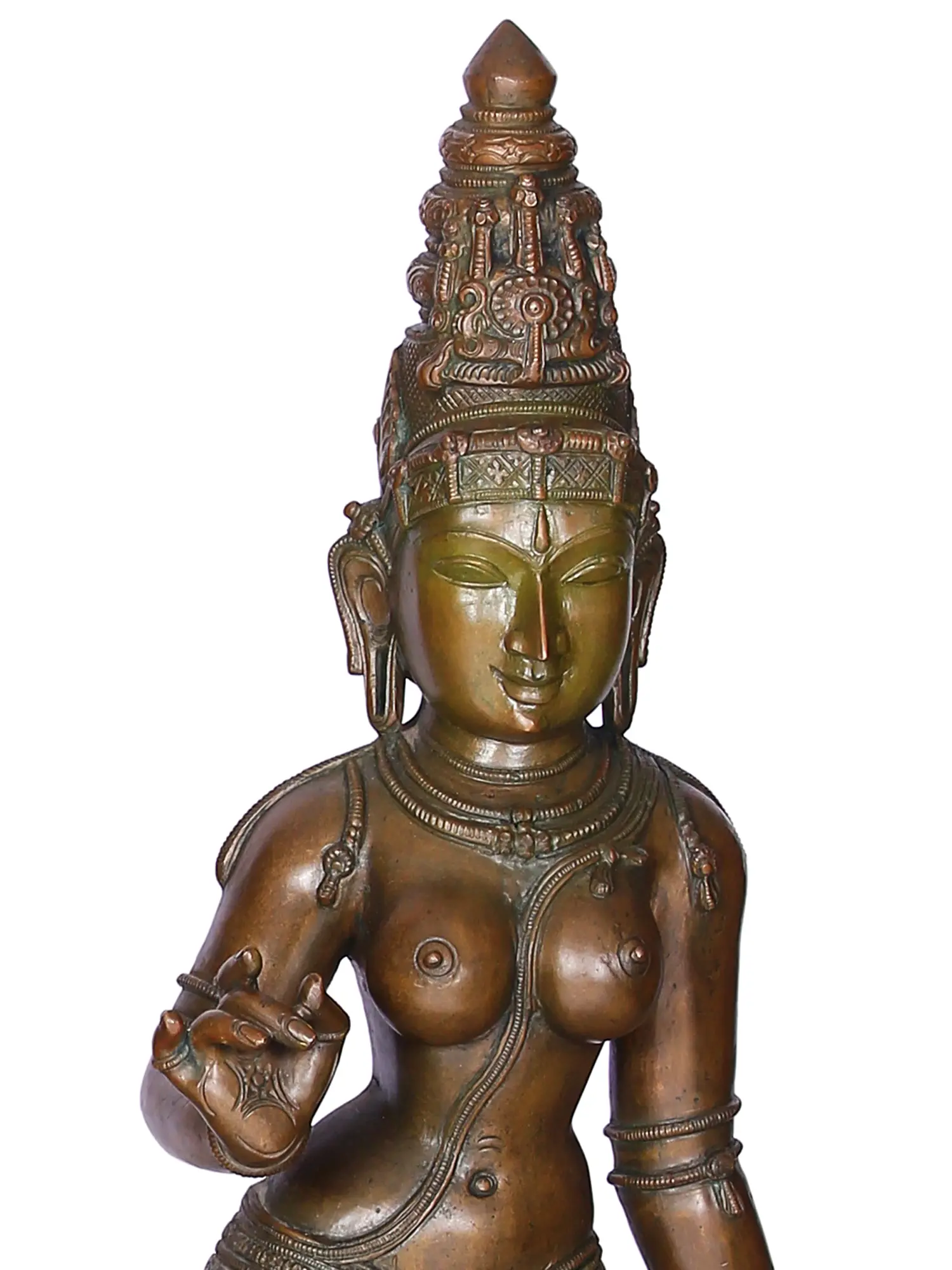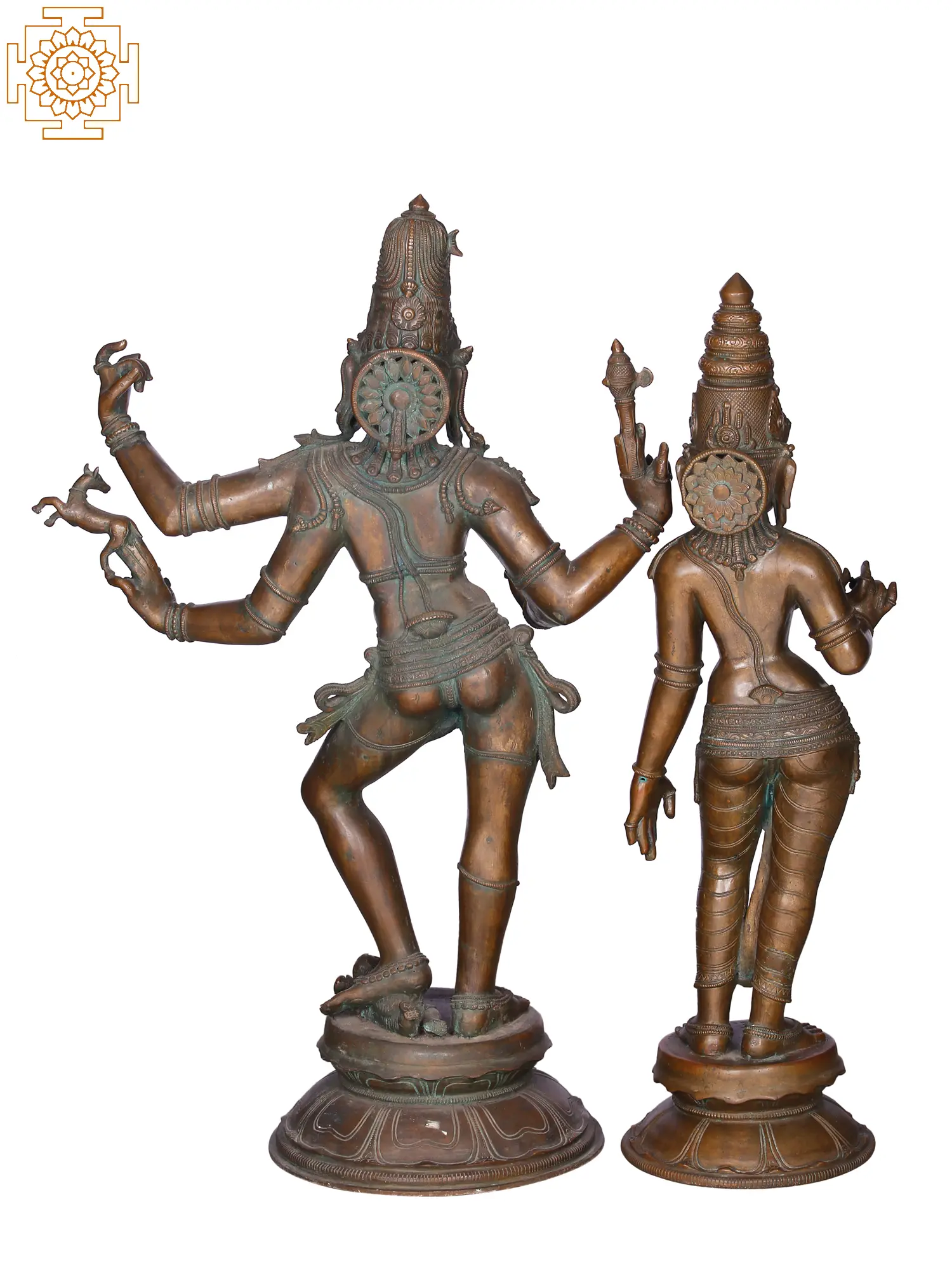 The similarities of form and style are in keeping with traditional South Indian workmanship. Elongated, perfectly toned musculature. Densely engraved crowns that taper high over the deities’ heads. Upturned lotus plinths (beneath Shiva’s left foot is the miserable Apasmara). The warm metallic colour is characteristic of the panchaloha variety of bronze found in Swamimalai.