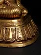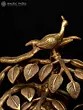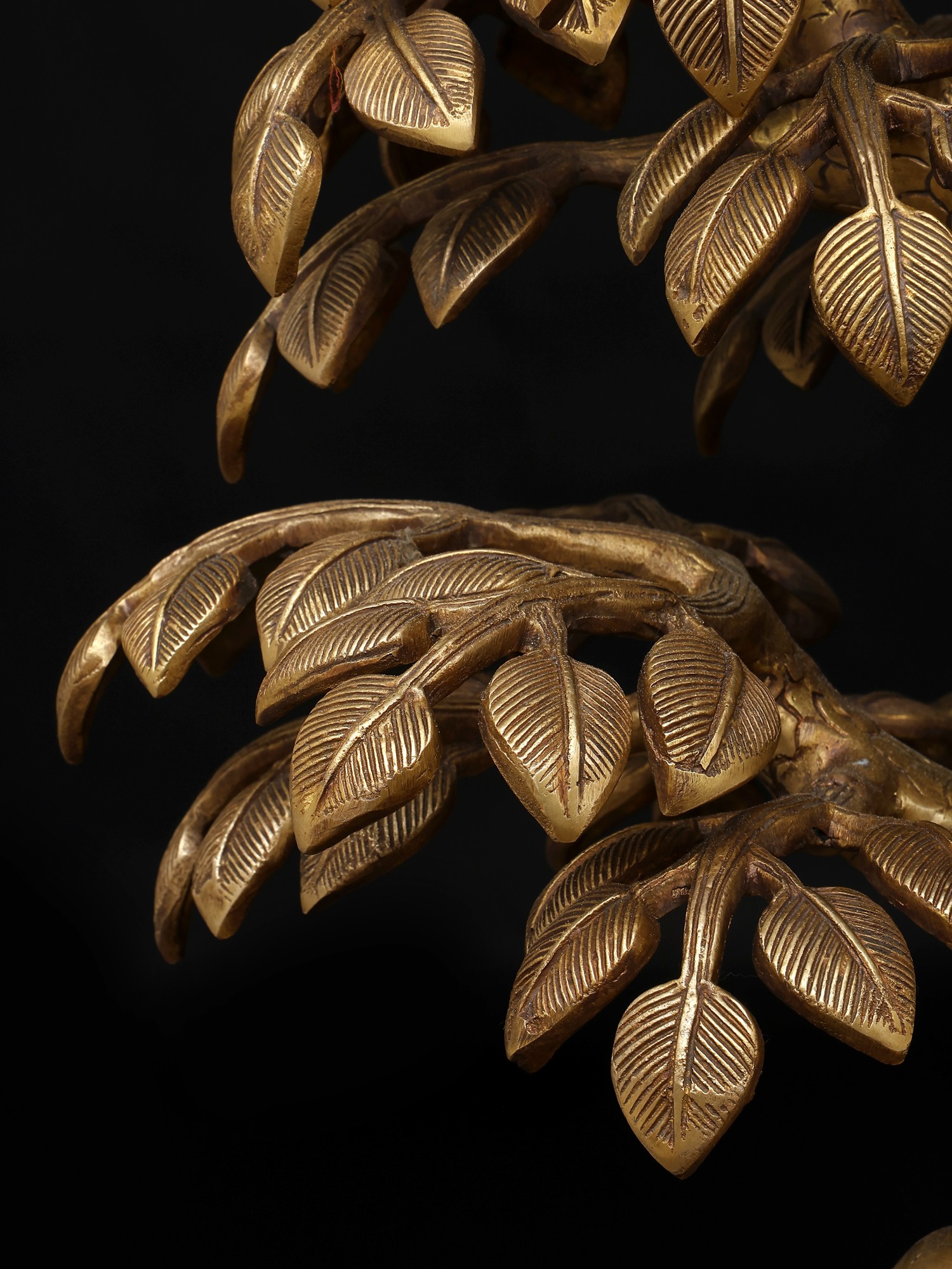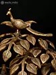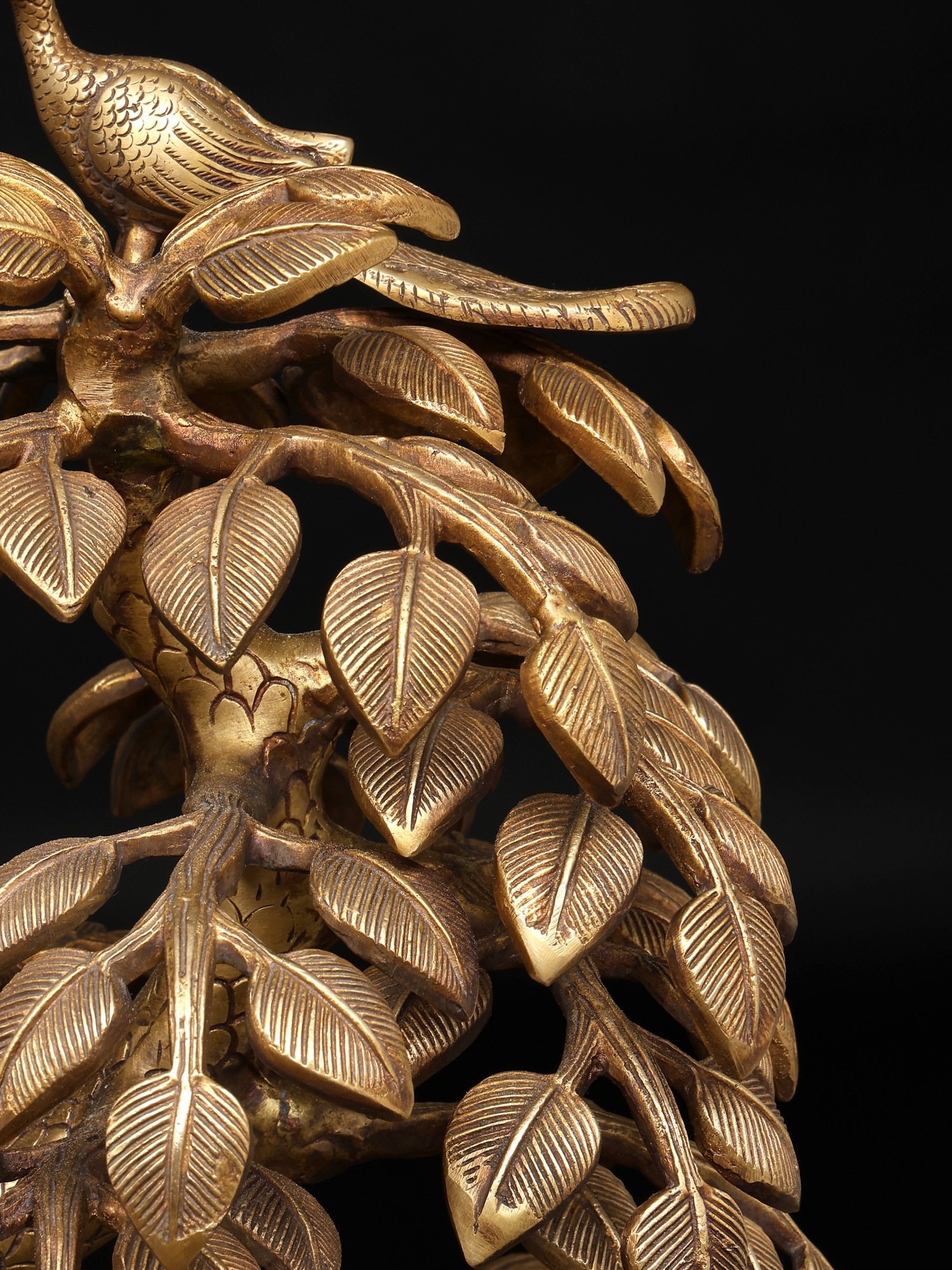Here, seated on an auspicious lotus base with inverted petals, the would-be Buddha sits poised on the verge of enlightenment. He wears a monastic robe covering only one shoulder. The folds of the drape are realistically and symmetrically delineated and the garment is bordered with decorative vegetative motifs complementing the majestic tree of life shielding Buddha with its high, blooming branches, lushly populated with densely packed leaves. At the apex can be seen two mating peacocks, symbolizing the union of wisdom and compassion which ultimately leads to Nirvana.