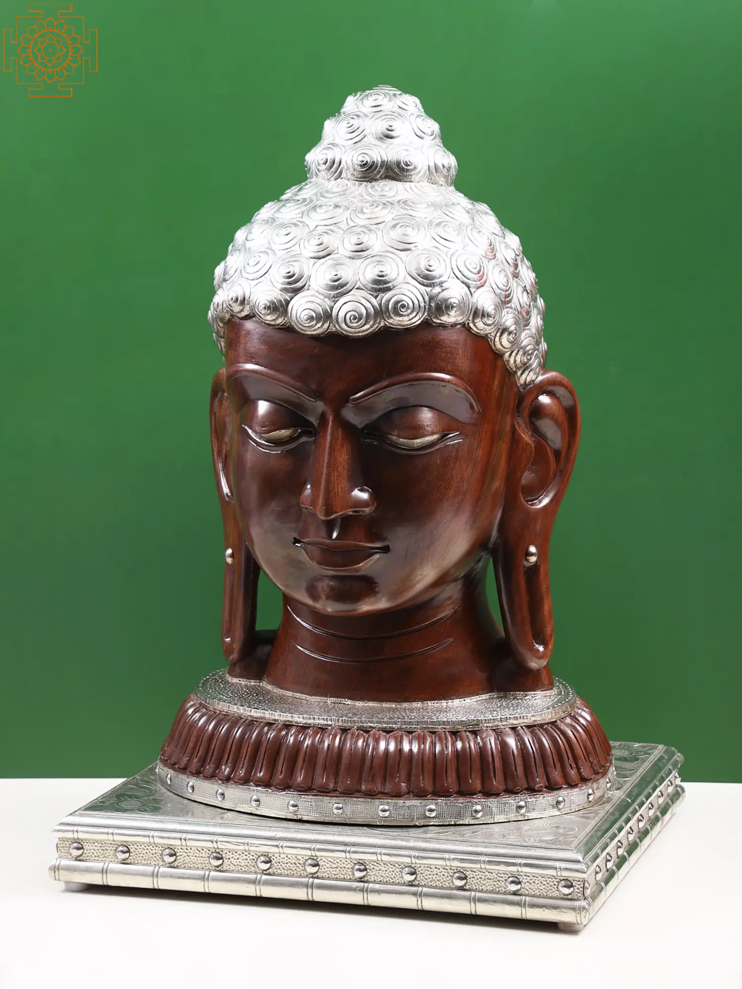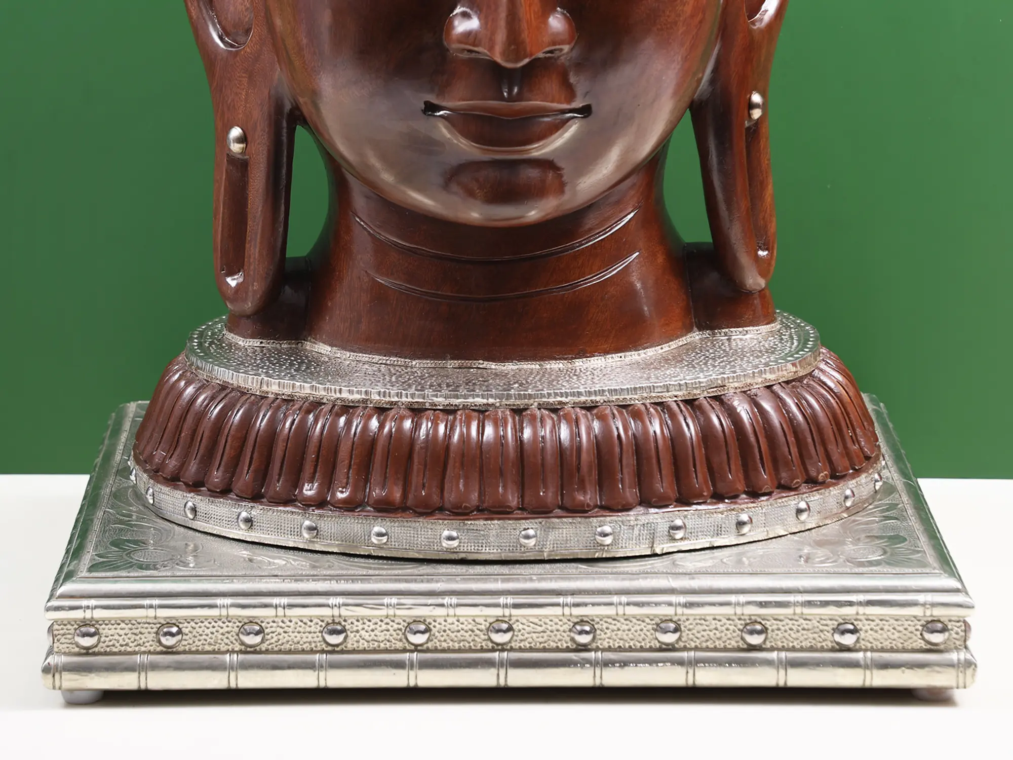 This lacquered wood statue of Buddha's head is remarkable in the animation it carries. Lotus eyes in a meditative mood, fine nose, full lips, and drooping earlobes complete the distinctive features of Buddha. The use of silver cladding on the coils of Buddha's head and on the lotus platform of this woodwork adds a stunning richness to its aesthetics.