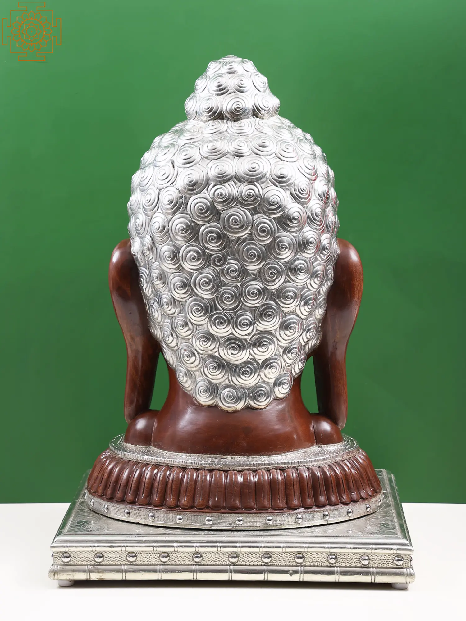 A hint of silver in the half-opened eyes of Buddha seems to highlight the blazing rays of supreme energy, which his enlightened mind holds. As if emerging from the lotus at the base of this composition, as a fragrant presence, the Buddha in this wooden statue invites the onlooker to take the journey to one's interiors, guided by his eternal light.
