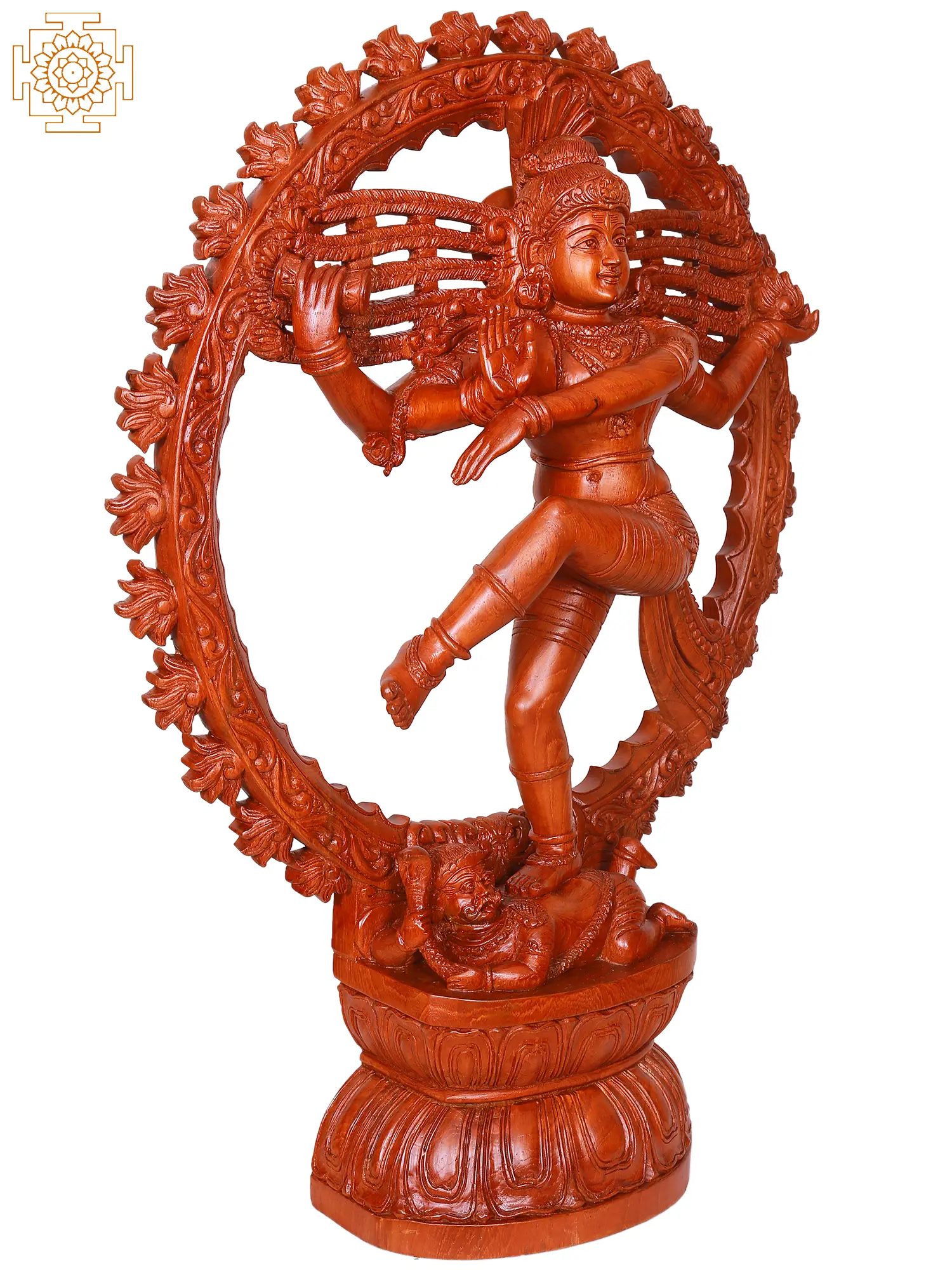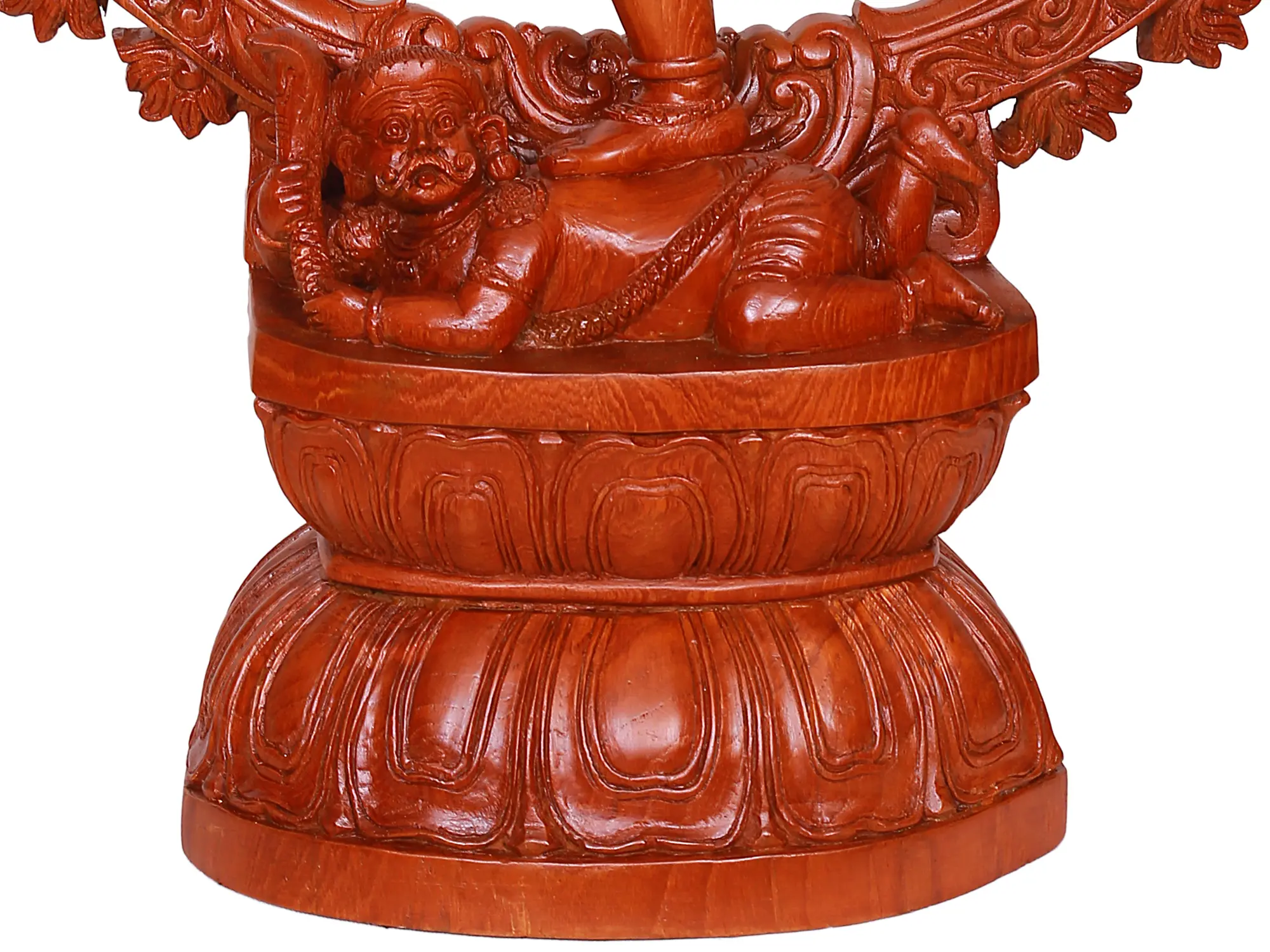 The sculpture’s aesthetic appeal is enhanced by the natural warmth and rich tones of the teak wood, which results in a captivating visual experience. The presence of Kirtimukha, a legendary being that represents protection and good fortune, gives the artwork a supernatural feel.