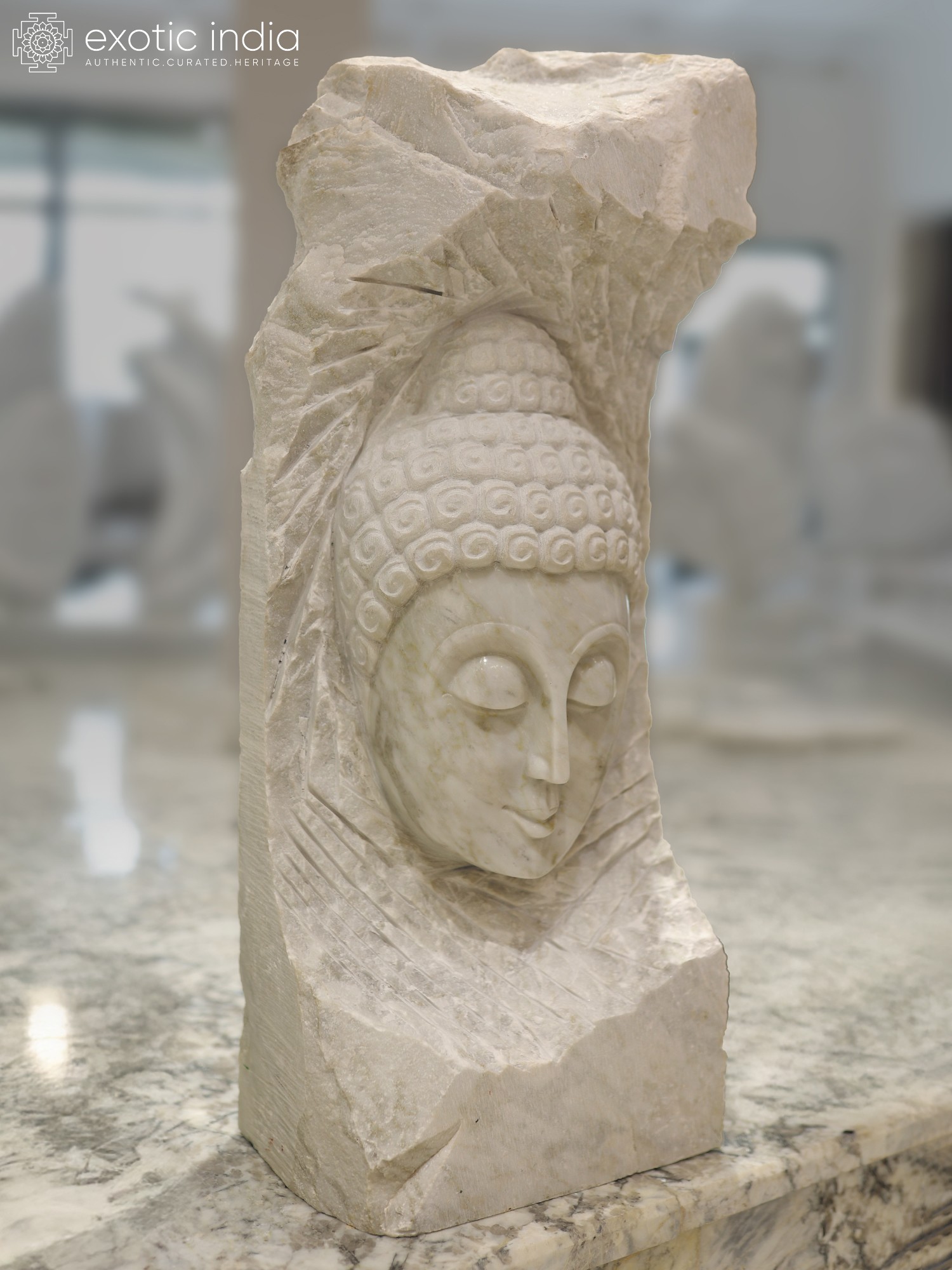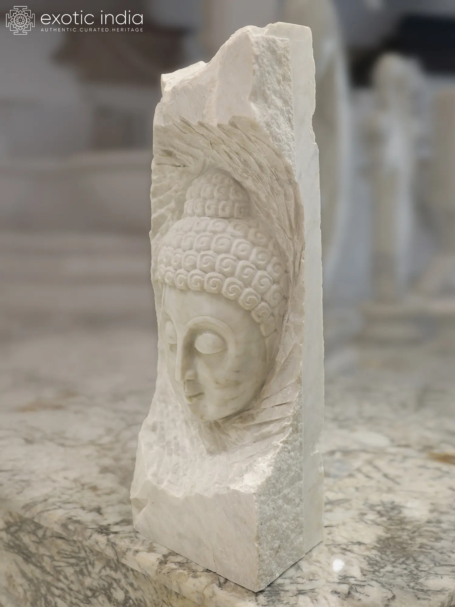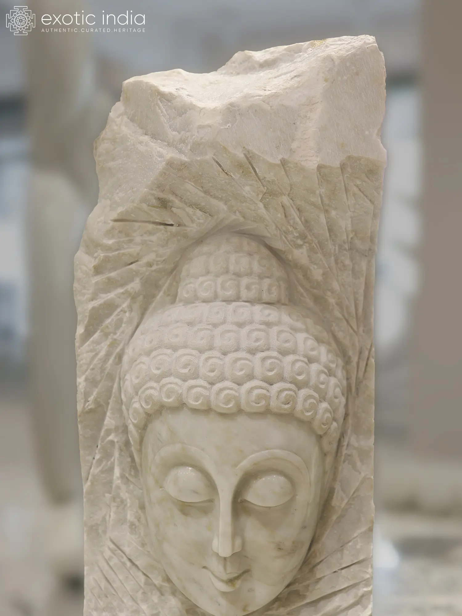 This striking sculpture captures the profound essence of Lord Buddha's countenance in a contemporary artistic style, rendered in the pure, natural elegance of white marble. Standing at a commanding height, this piece is not merely a decorative object but a gateway to contemplation and inner peace. The artist has masterfully carved the delicate features of Buddha's face, imbuing it with a gentle, knowing expression that speaks of enlightenment and compassion. The serene gaze, the subtle curve of the lips, and the intricate detailing of the ushnisha (cranial protuberance) are all testament to the sculptor's skill and deep understanding of Buddhist iconography.