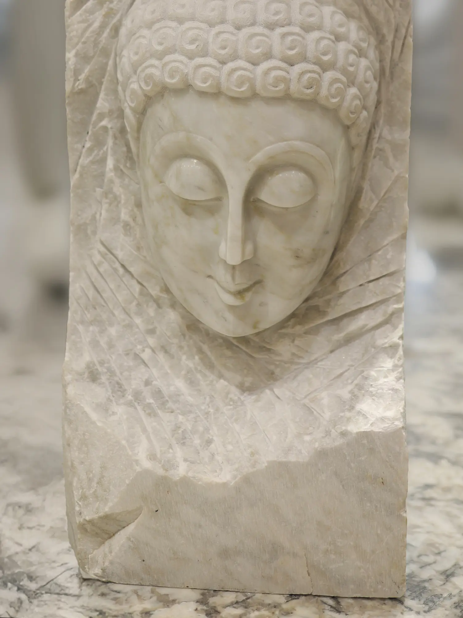 This piece transcends traditional representations, offering a modern artistic interpretation that resonates with today's aesthetic sensibilities. The raw, uncarved portions of the marble block serve as a deliberate contrast to the meticulously carved face, highlighting the transformative power of art and the journey from the material to the spiritual. This juxtaposition evokes the Buddhist concept of "emptiness" (sunyata), suggesting that true essence lies beyond outward form. The layered, textured effect around the face hints at the cosmic energies or the protective embrace of nature that surrounded the Buddha during his enlightenment, reminiscent of the stories of the Bodhi tree.