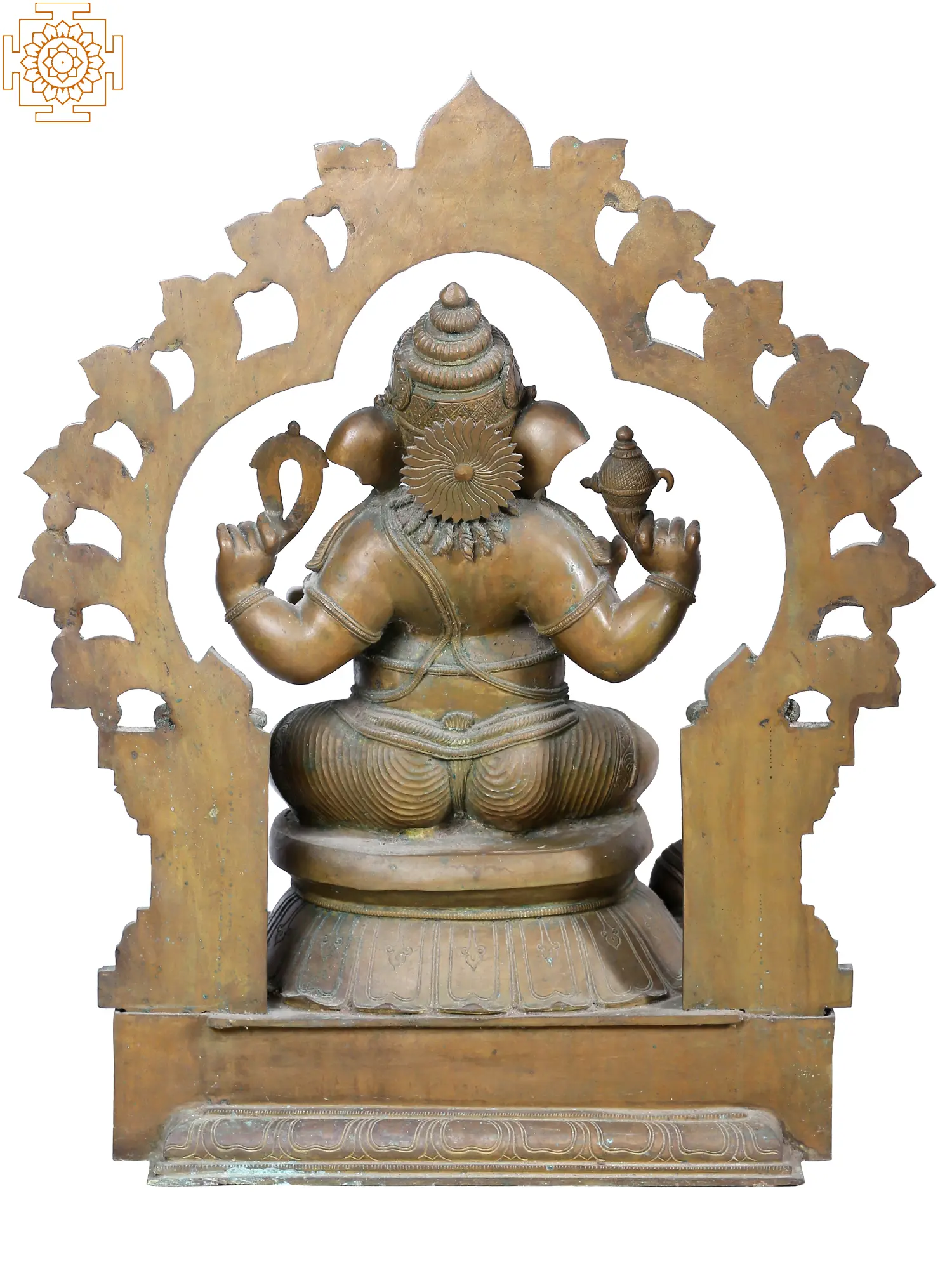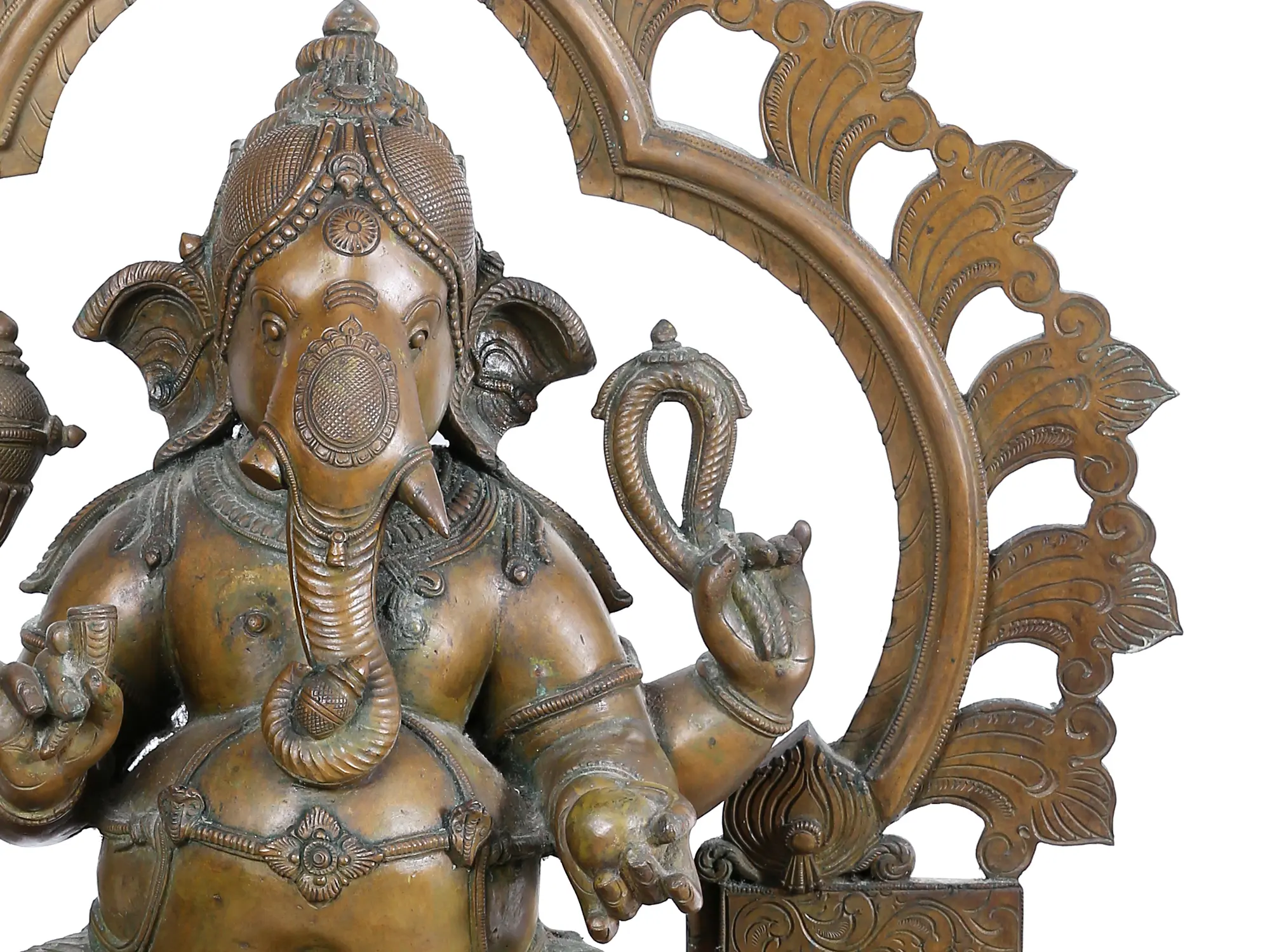On a plinth of floral vines and blossoms, Lord Ganesha in a Lalitasana over his cushioned disc. The Elephant headed deity is the initiator of all rituals that call upon the sacred pantheon. Ganesha, who holds the abundance of universe in his belly, appears in his Chaturbhuja form here - holding an Ankusha, Pasa, Broken tusk, and Pomegranate, coiling his trunk around his favorite Modaka. Wearing his Mukuta, the jewels of chains, tika, bracelets armbands, and anklets adorn the Mahakaya - who is centered in the radiance of Pranbhavali in this beautiful Panchaloha creation.