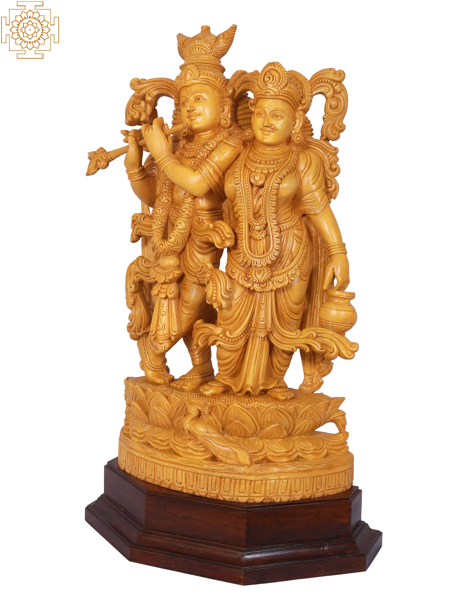 Radha, the beloved of Krishna, stands beside him, her gaze filled with adoration. Her posture speaks of deep devotion and spiritual connection, a perfect complement to Krishna’s divine presence. In her hand, she holds a pot, perhaps symbolizing the nectars of love and devotion she offers to her Lord. The intricate carvings adorning their garments and ornaments showcase the skill of the artisan, bringing to life the divine couple with breathtaking detail. The entire composition rests upon a beautifully carved lotus, a symbol of purity and spiritual awakening, further enhanced by a rich, dark wooden base that provides a grounding contrast to the light wood of the statue.