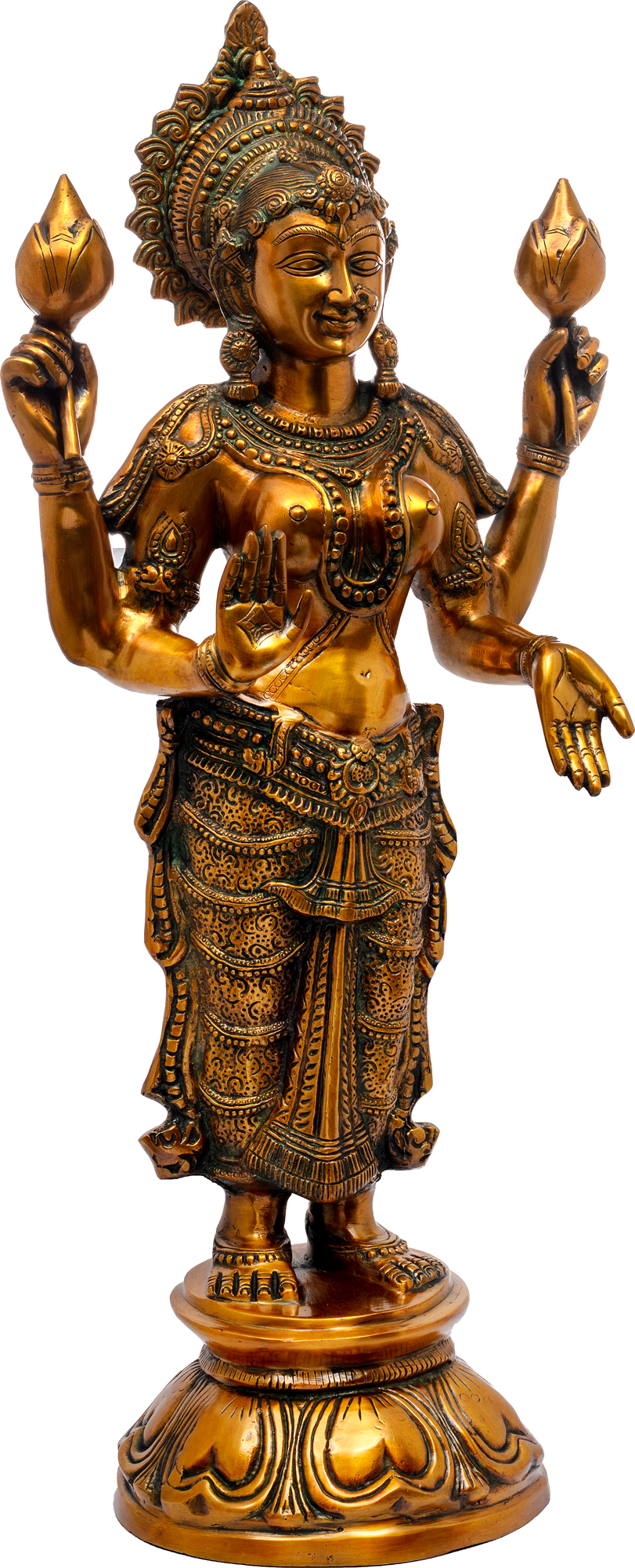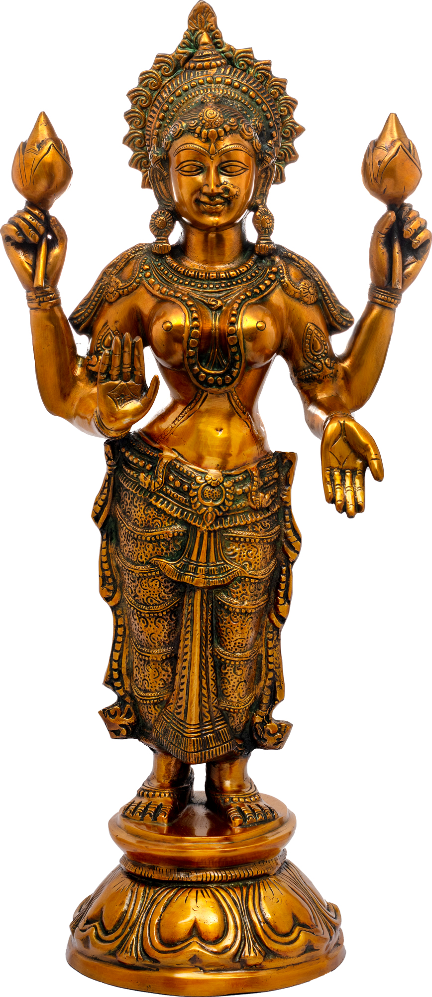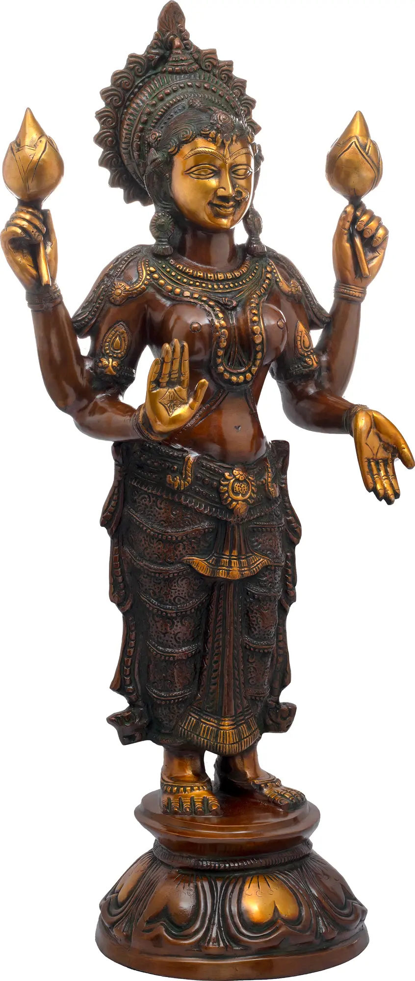 Invoke the blessings of abundance and good fortune with this magnificent brass idol, meticulously handcrafted in India. Standing at an impressive 32 inches tall, this statue captures the divine essence of Goddess Lakshmi, the beloved Hindu deity of wealth, prosperity, and auspiciousness. Her serene expression, adorned with intricate traditional jewelry, radiates a sense of peace and benevolence. The dual-toned patina accentuates the fine details, from the delicate facial features to the flowing garments and the exquisite ornamentation.