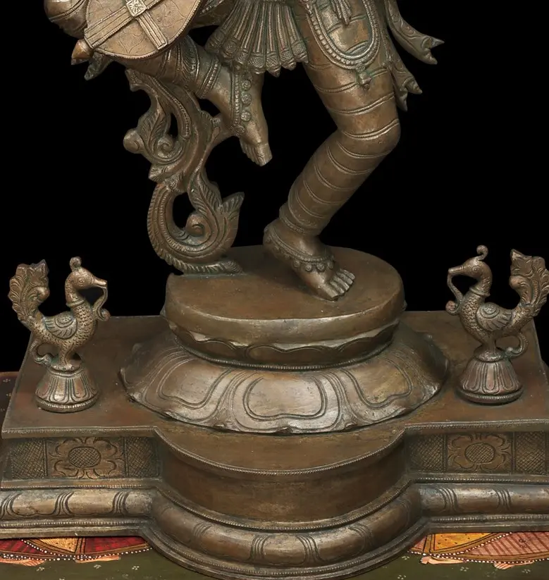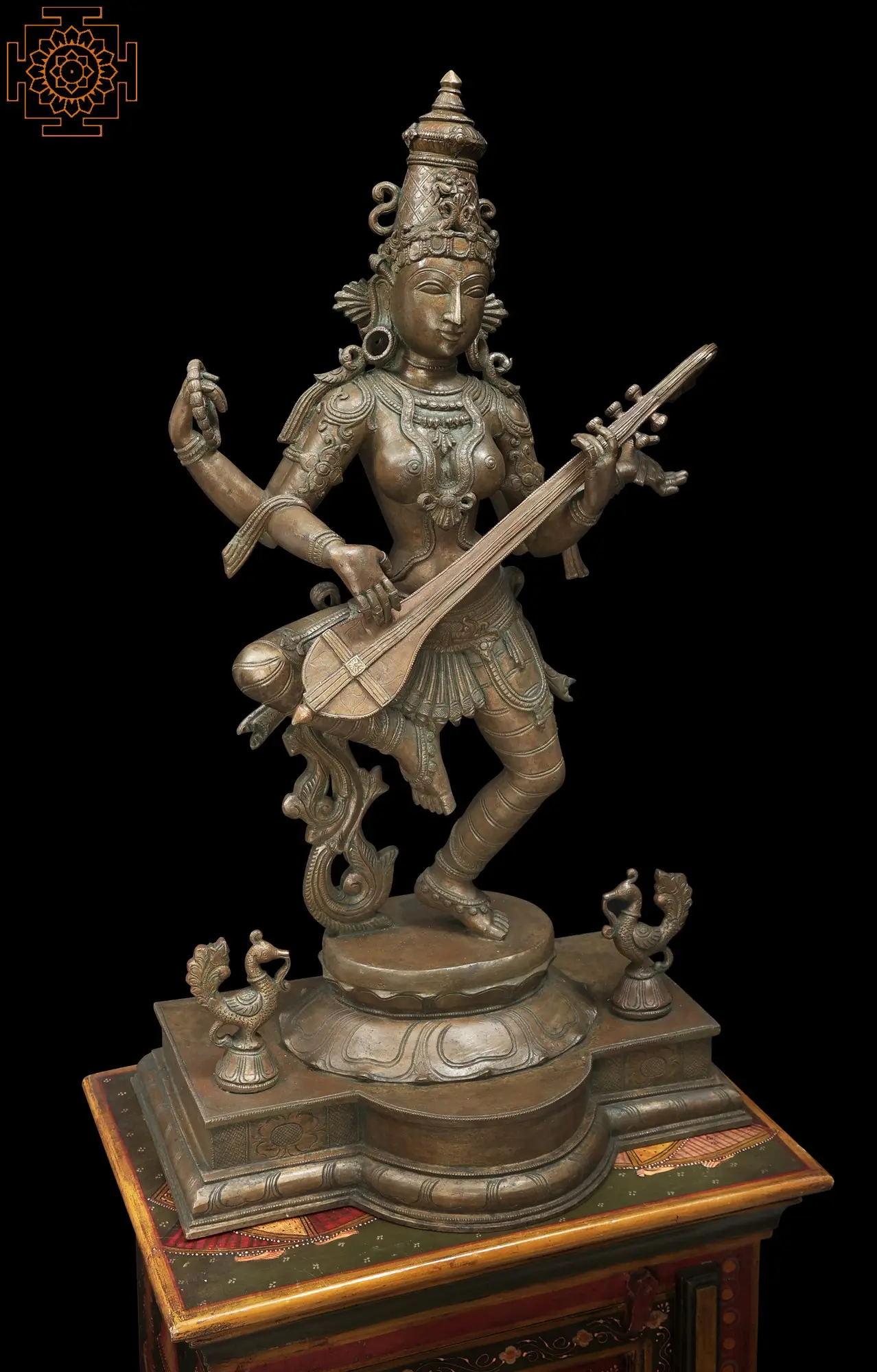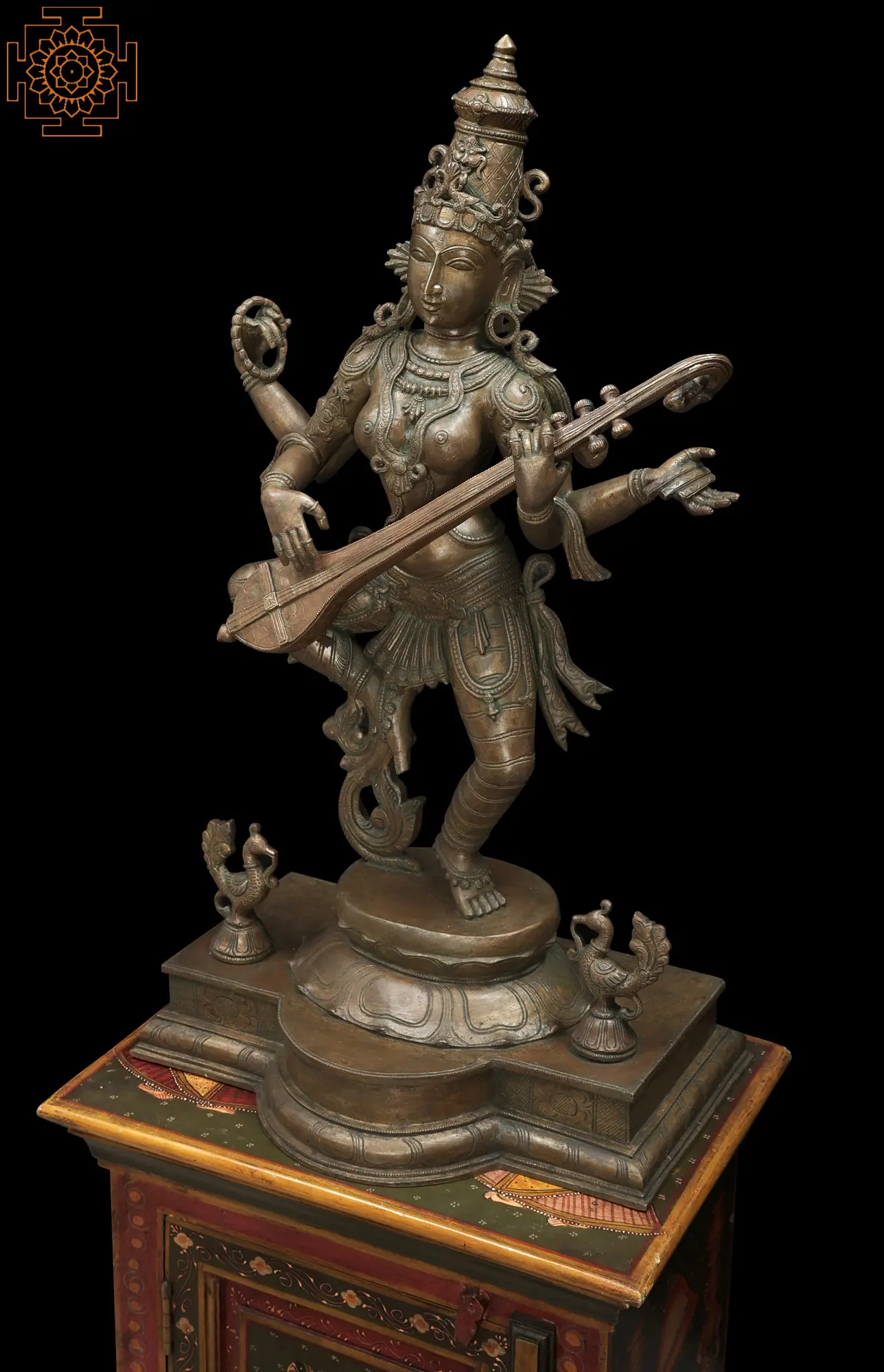 The lotus is flanked by a pair of miniscule peacocks showing off their plumage as they are perched on their own lotus-shaped plinths. The peacock is often associated with Devi Sarasvati as Her vahana (divine mount) for their beauty. Zoom in on the crown of the Devi, as tall and slender as the rest of Her. The sharp, expressive features of Her face, flanked by statement karnakundalas and another pair of miniscule peacocks resting on the curve of Her shoulders. The exquisite adornments of gold, seemingly embossed on Her peaches-and-cream skin. Sculpted from bronze, the finesse of the medium gives Her a complexion of molten gold.
