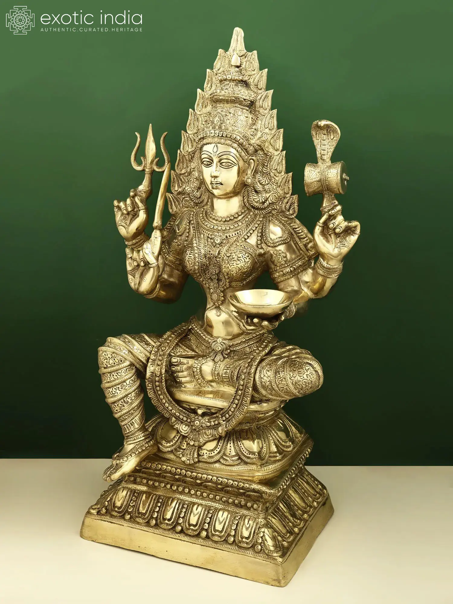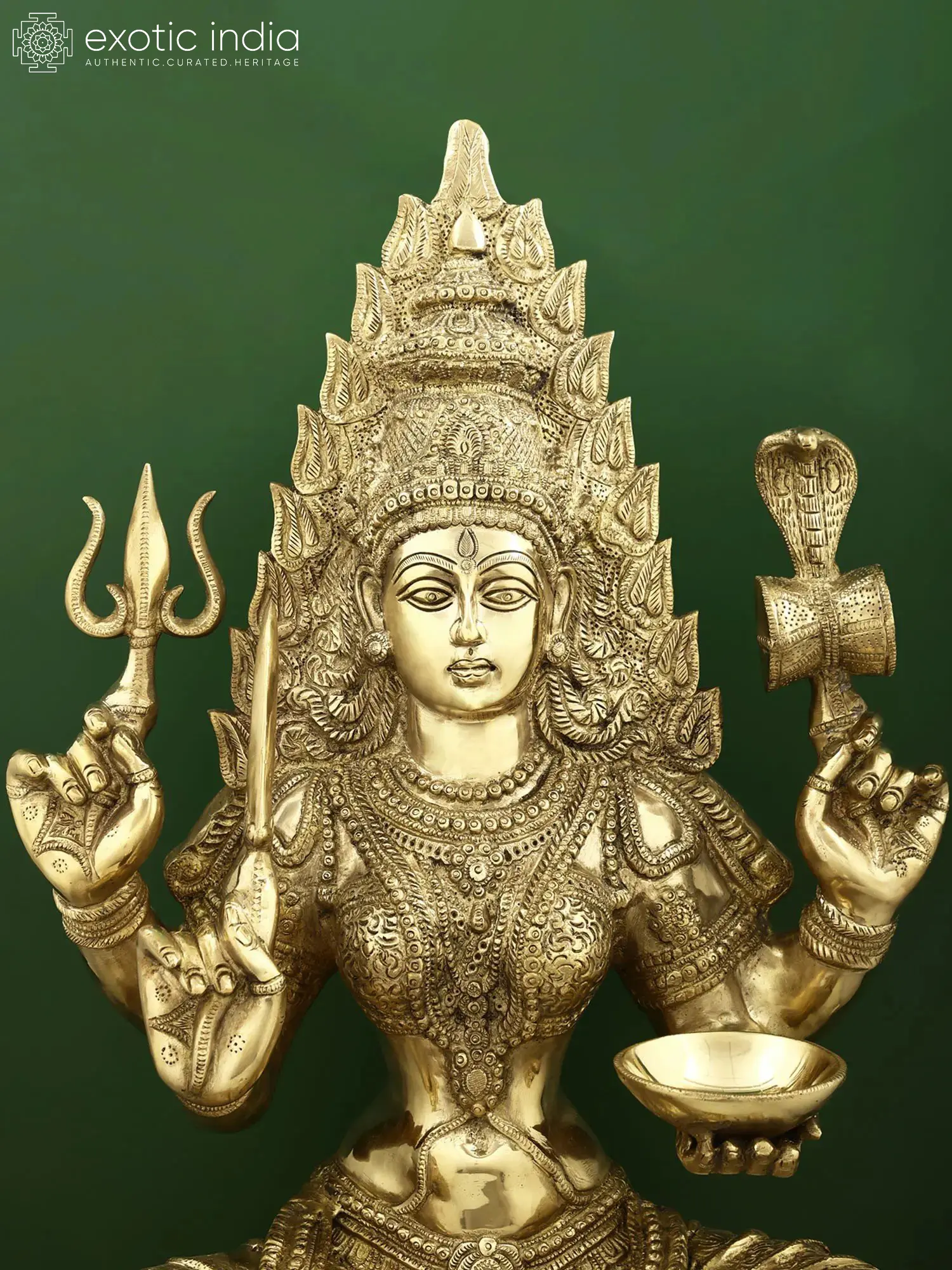 This magnificent image cast in brass represents Durga, combining some of the features of the iconography of Kali and Lakshmi, a typical South Indian idiom of representing her. Such form of the goddess is usually known and worshipped in the South as Mari Amma or Mari Amman. This four-armed form of the goddess combines two sets of Shaivite attributes, one consisting of a third eye mark on the forehead and the trident, ‘damaru’ – small double drum, and serpent twisting around the ‘damaru’, carried in two upper hands, and the other, a chopper and a bowl, symbolic of skull-bowl, carried in her normal two hands, besides the flames of fire emitting halo-like from behind her head.