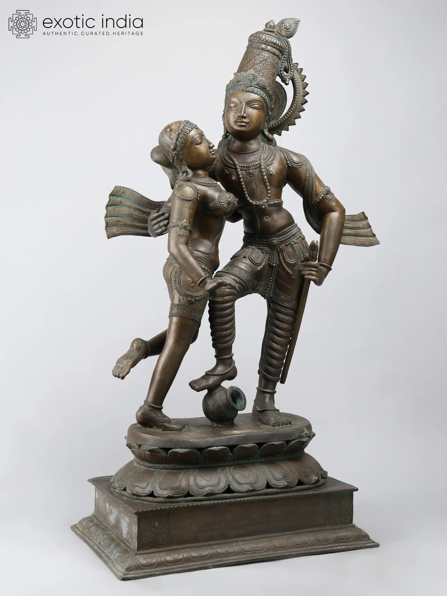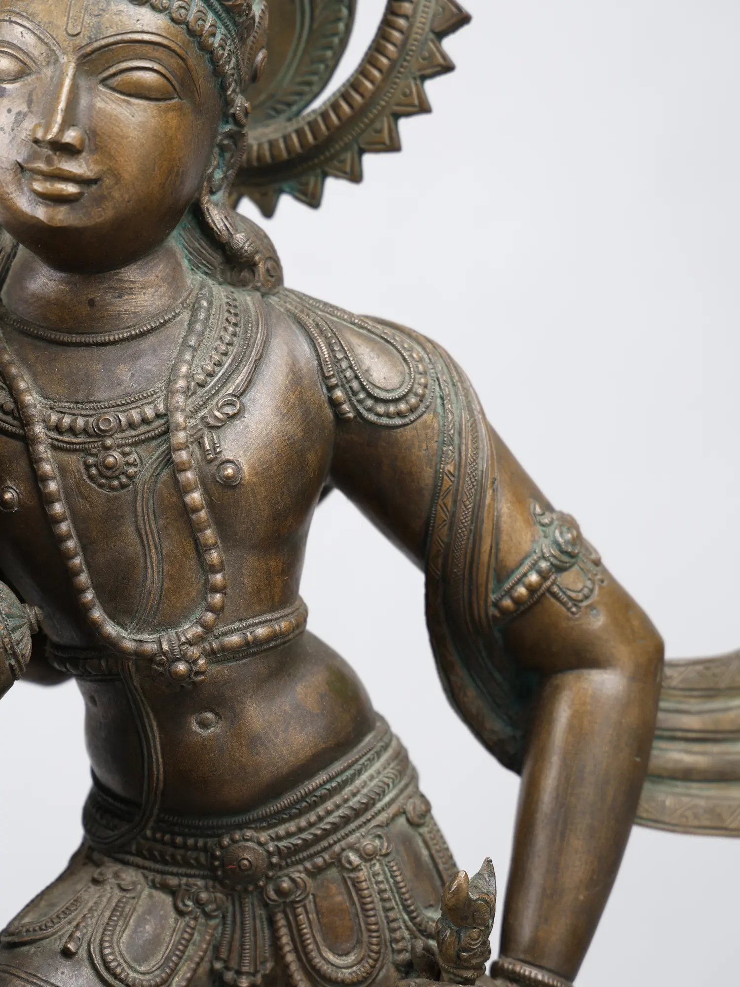 The harmony of Radha-Krishna’s togetherness, in the performing arts idiom. A dynamic sculpture in panchaloha, a special kind of bronze made from a blend of five (‘pancha’) different iron-based (‘loha’) alloys, it is a fine example of the traditional workmanship of South India. A handpicked, one-of-a-kind Radha-Krishna composition such as this one would be a valuable addition to the home of the modern-day devotee.