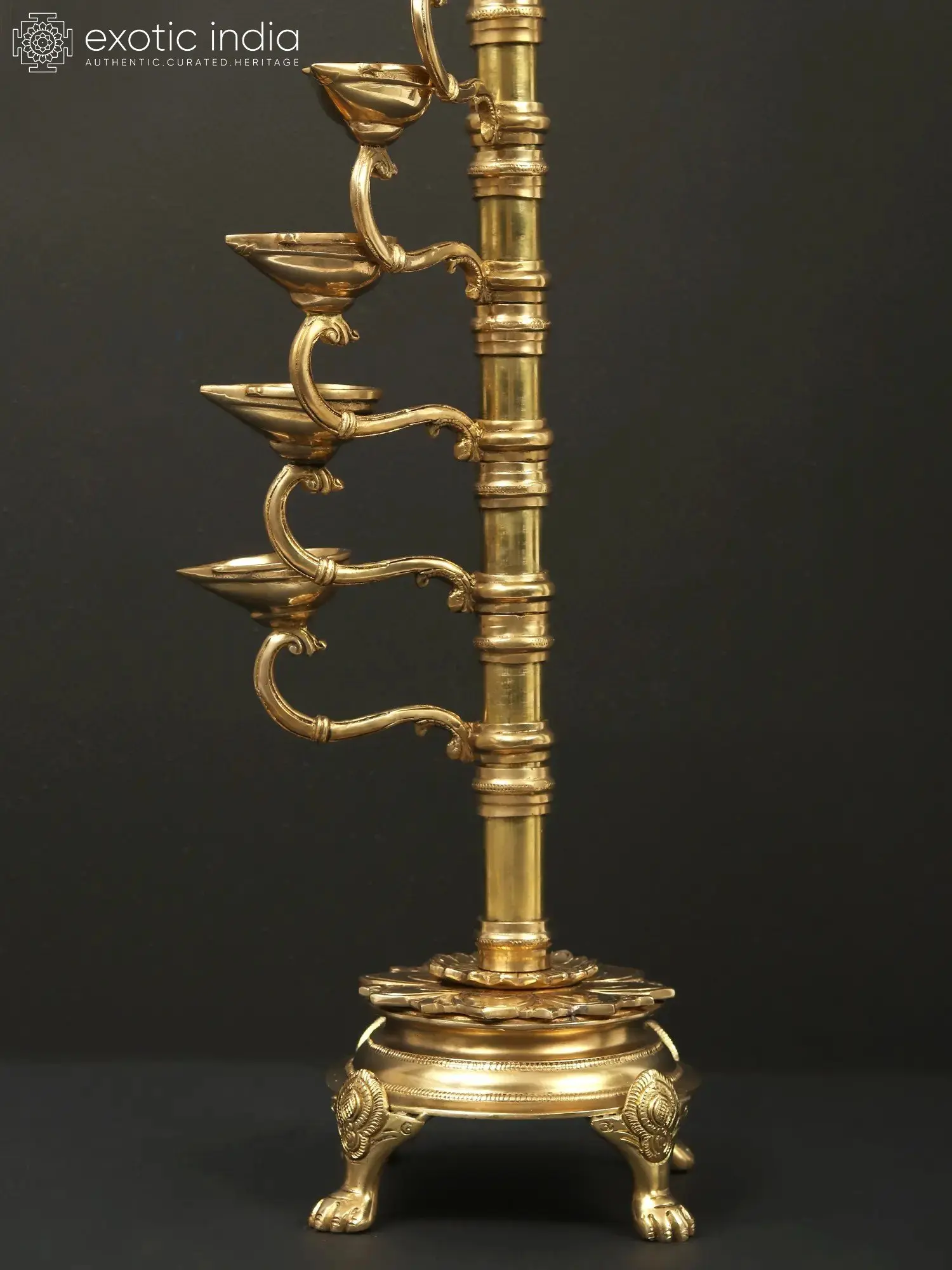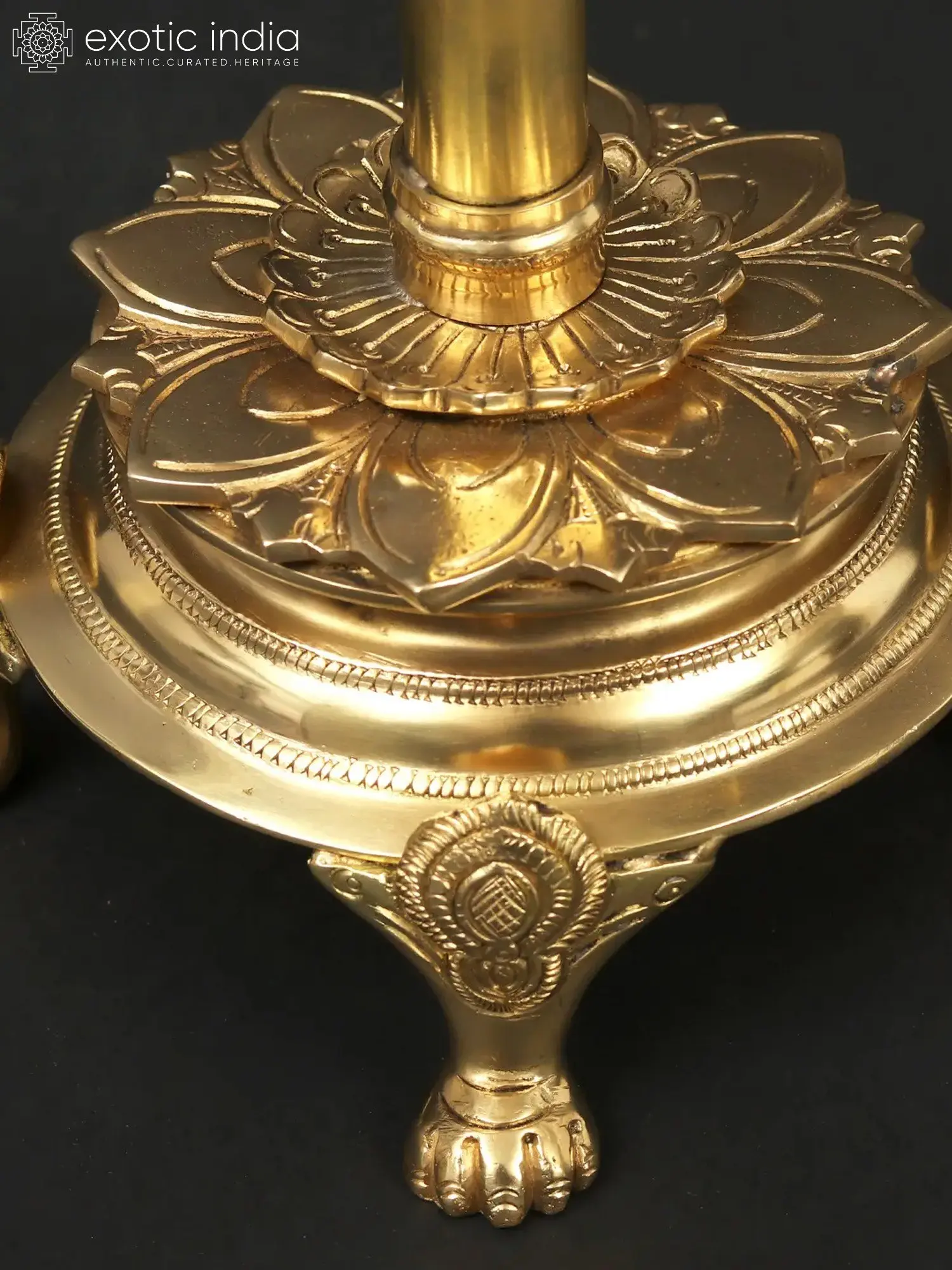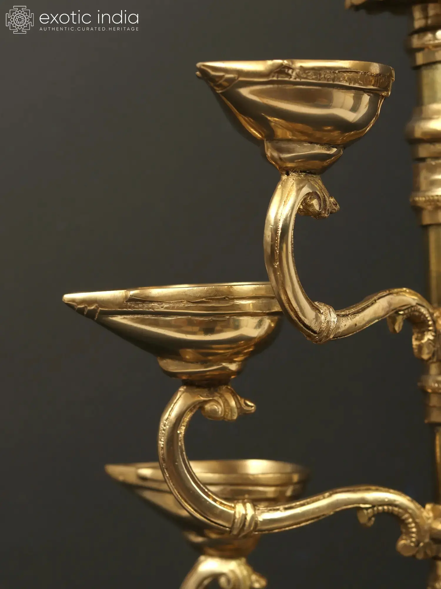 This eight-wick standing lamp known as a Nila Vilakku has the auspiciousness of eight lights and a focal picture of a spear. An ornate stand holds the lamp. The lighting is set in the shape of a coiled stairwell. The lamp's crown is inspired by the vines found in the embellishments of Hoysala-style temples. When lighted, the lamps will resemble a delicate necklace of lights that shine in a coiling pattern. This lamp will be a lovely addition to your home's decor.