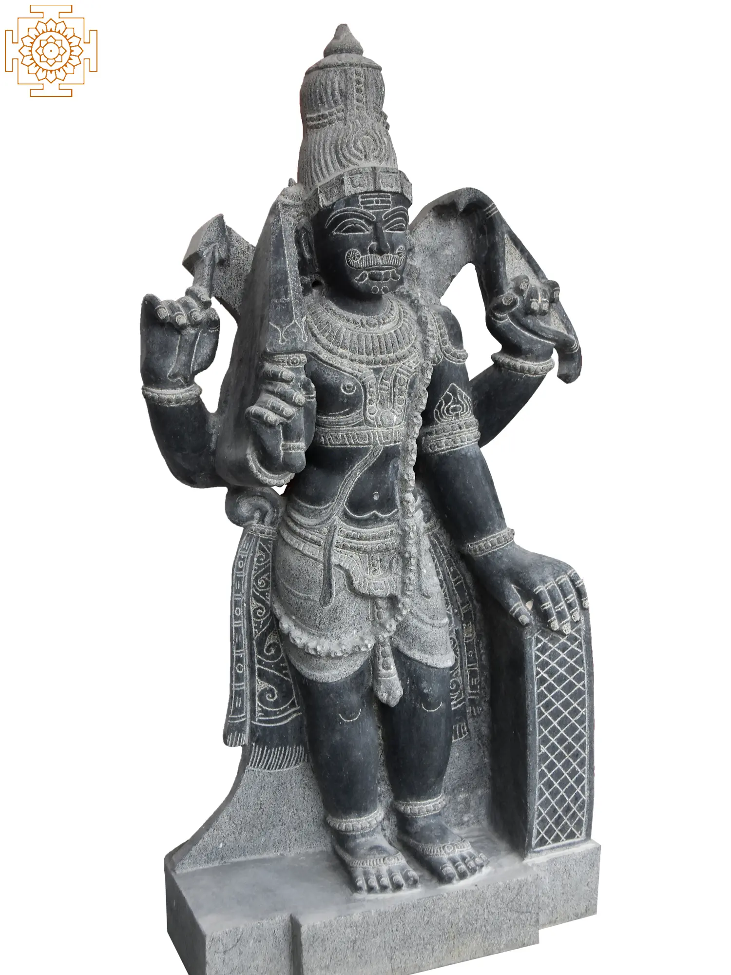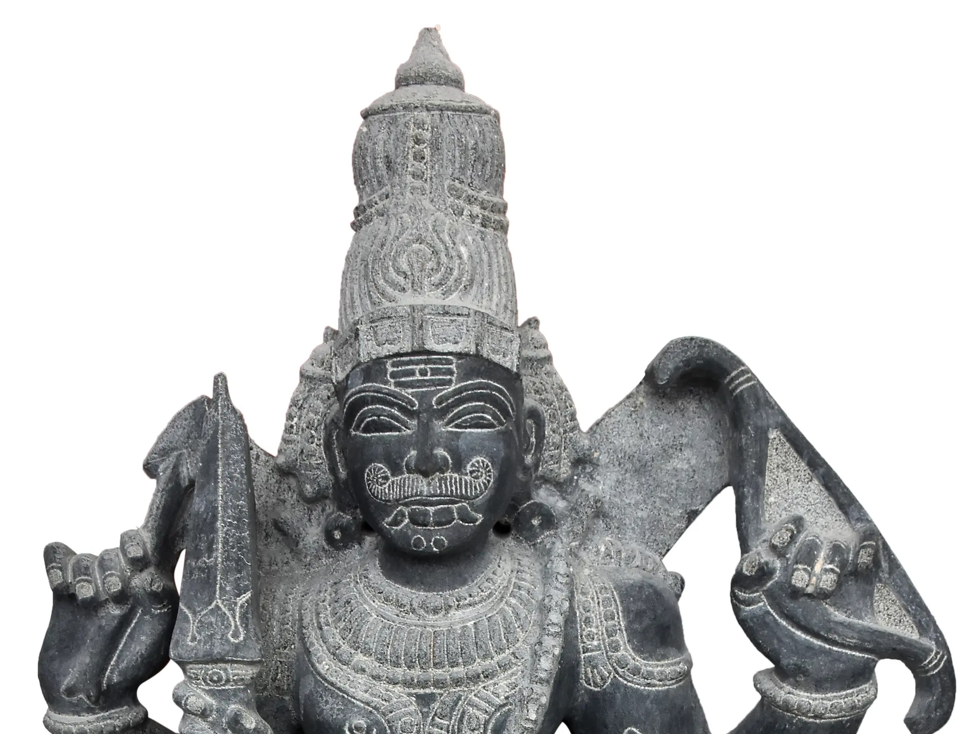 This two-feet granite statue represents the valor and virtue of Veerabhadra by depicting him as a four-armed warrior, with a Jatamukuta (crown of tresses), Tripunda on forehead ornaments and a short dhoti associating him with Shiva.