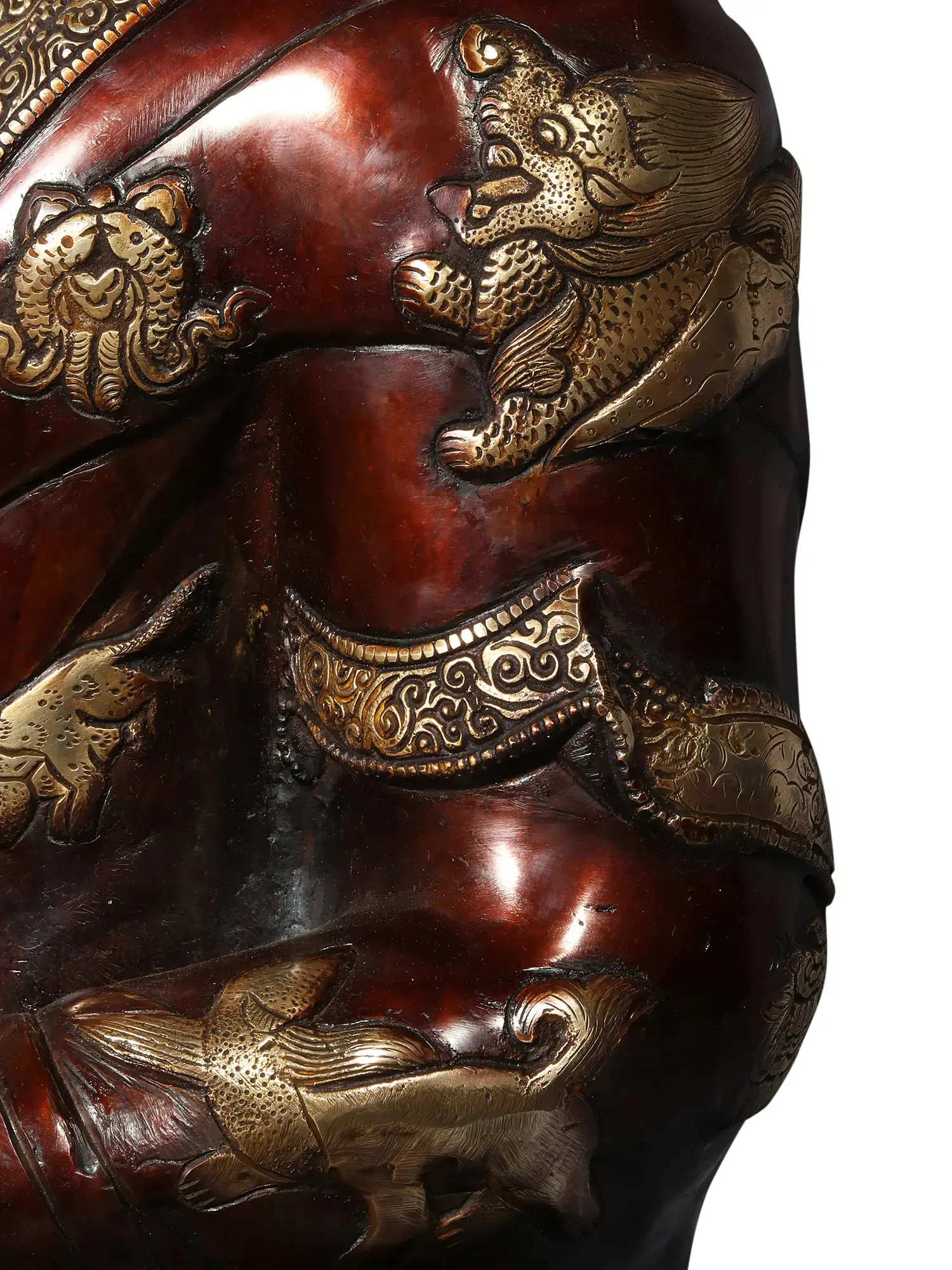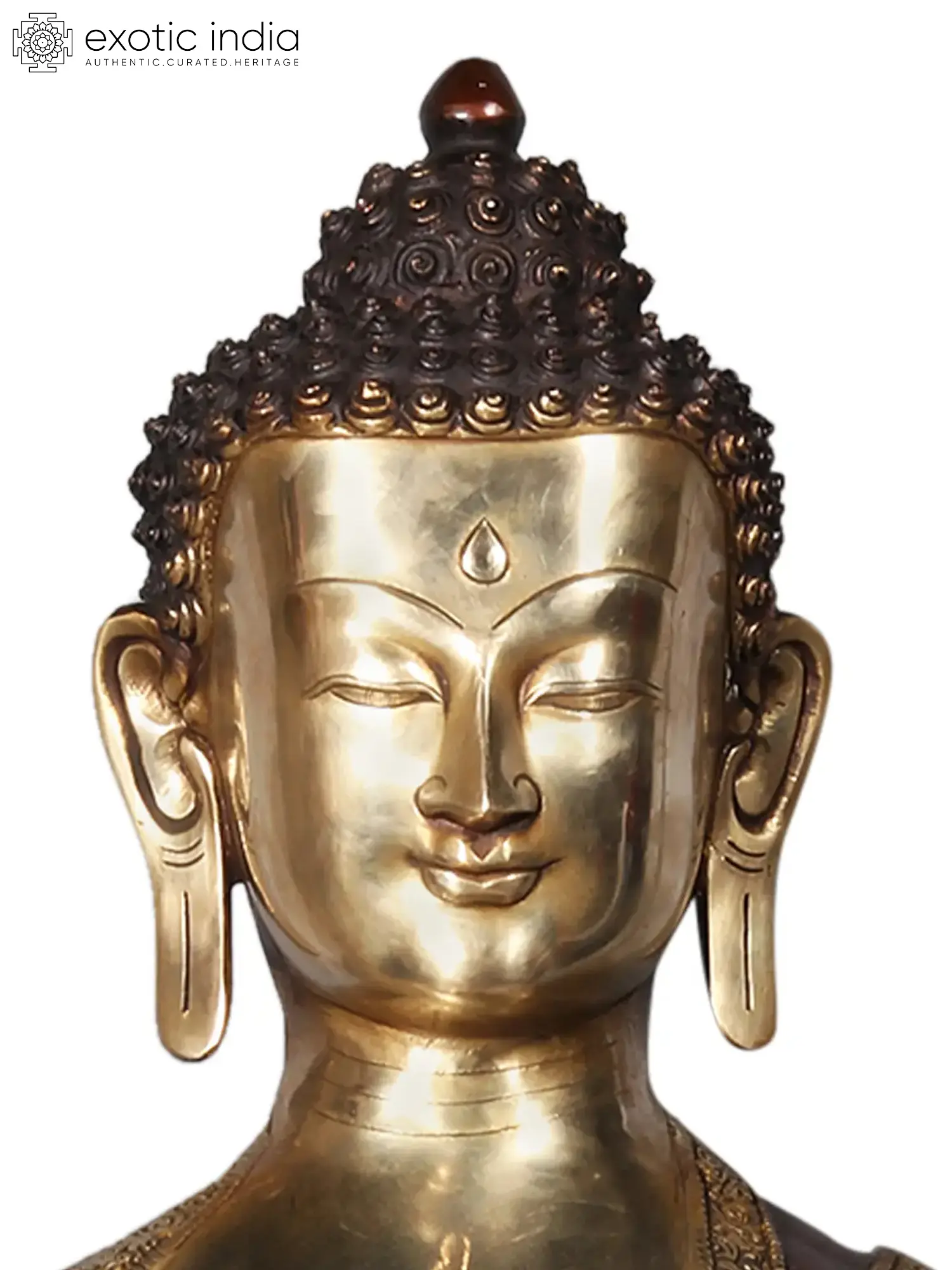 This seated Buddha sculpture of substantial proportions has been carved from pure brass. It features a solemn colour palette of pale golden and deep brown. Symbols of Buddhistic importance are embossed on the robe of the Buddha. The almsbowl in His left hand and the lotus-petal throne beneath Him are crucial elements of the Buddha iconography.