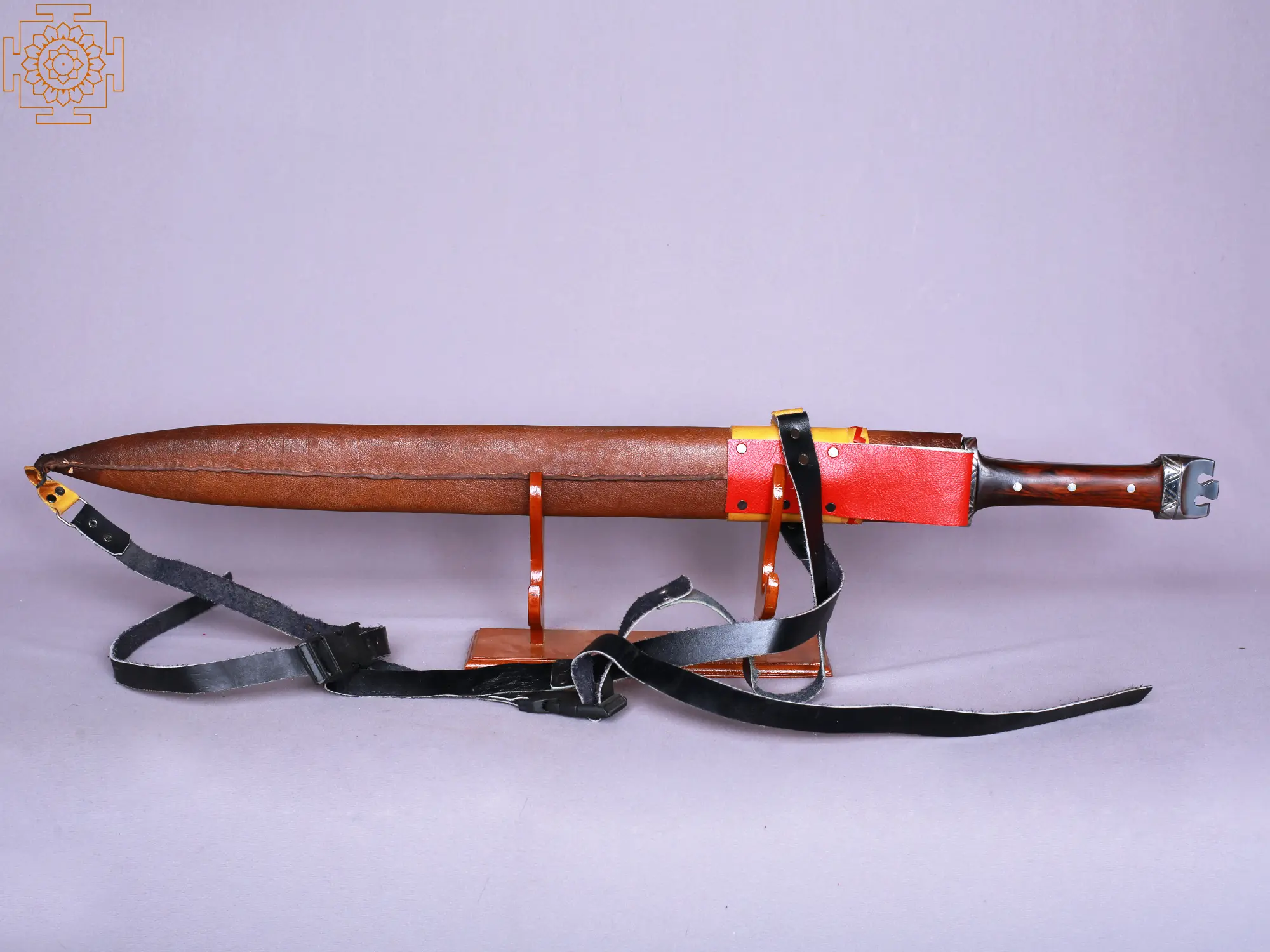 The handle, crafted from rich dark wood, offers a comfortable and secure grip, reflecting the practical design element crucial for skilled warriors in combat. The wood's natural grain and texture add a touch of rustic elegance to the sword's overall aesthetic. Protecting the blade is a meticulously crafted leather scabbard, rich brown and accented with light yellow, a classic leatherwork style. The leather is durable yet supple, ensuring the sword is protected from the elements, a vital consideration given the harsh climates in which Gurkha swords were once often carried. The sheath itself is an integral part of the overall design and demonstrates the craftsmanship and attention to detail given to the entirety of the piece.