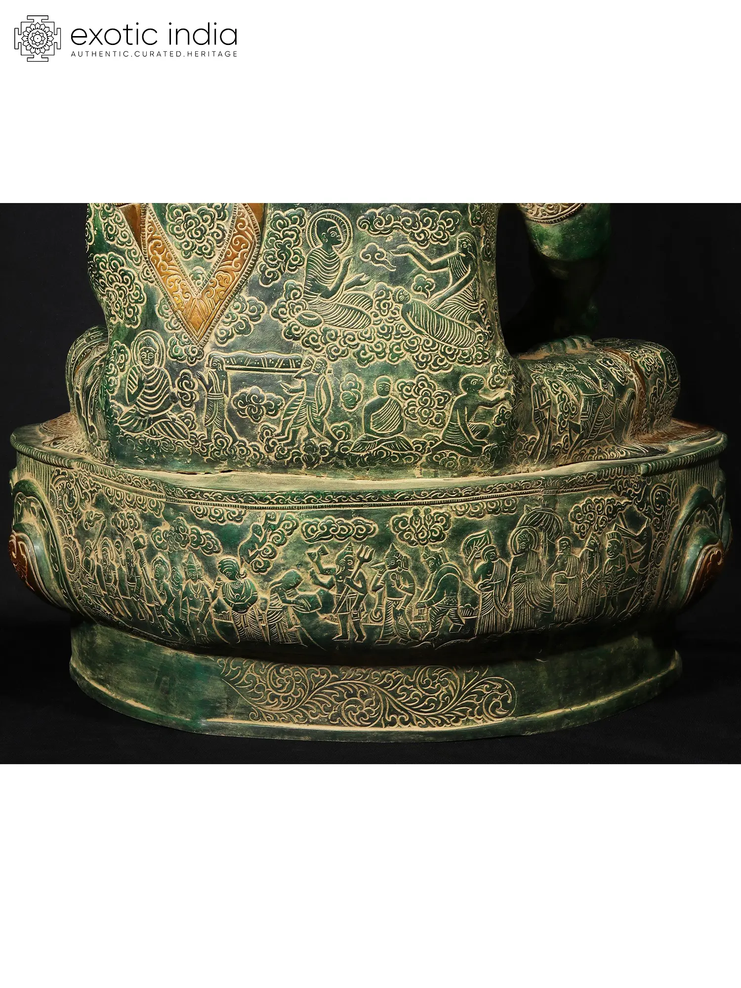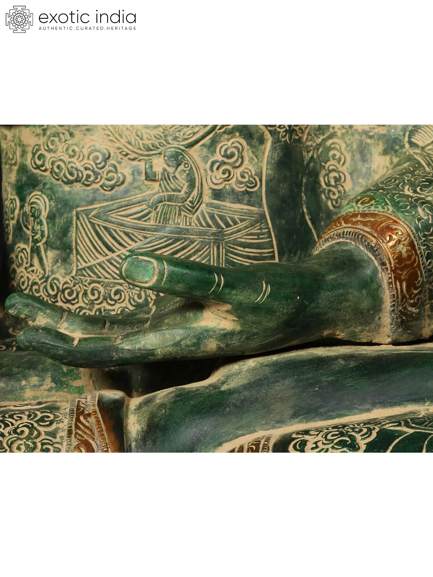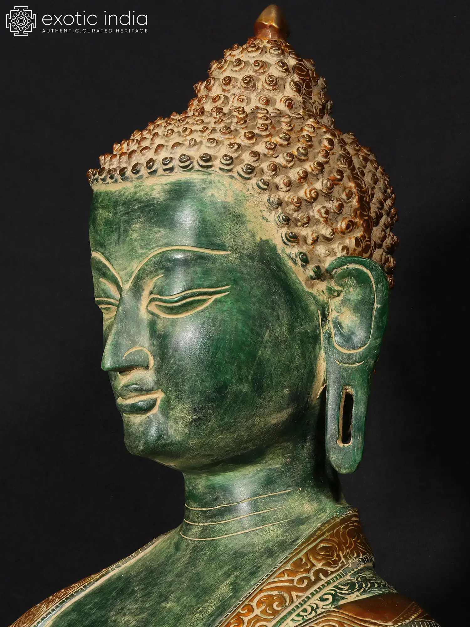 The sculpture that you see on this page is made of pure brass. The bitone colour palette features the aforementioned earthy green hue and gold in varying extents of sheen. For example, the hems of the Buddha’s unstitched robe have an unmistakable metallic shimmer, while the engravings on its surface area have more to do with visual detail than shimmer.