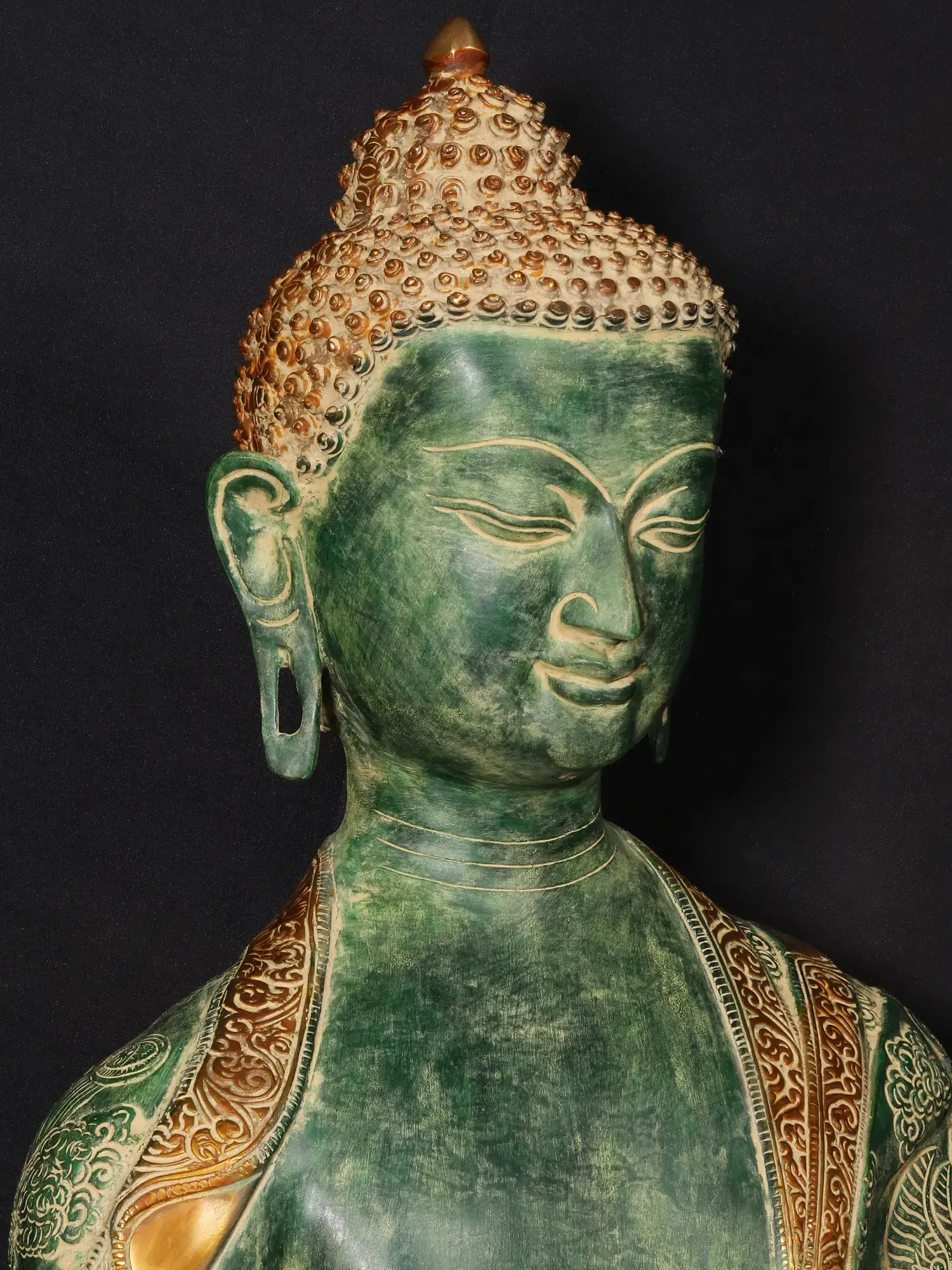 A seated Buddha murti of substantial proportions. A perfectly symmetrical padmasana, a sublime composure of countenance. The complexion of the erstwhile Shakyamuni, a richly textured green. Set off by hints of natural gold on the hair and robe and etchings of feature.