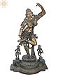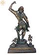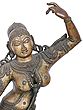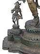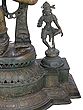 The Devangana dances atop a platform she shares with two other female figures, who are much smaller in size when compared to her, signaling that their status is secondary to hers. And who could rival such beauty? Her tresses long and curly are set in a gorgeous bun, held together by a jeweled tiara and hair accessories. Her face is a pleasing sight to behold- eyebrows arched like the bow of warriors, whose hearts she pierced with her almond eyes' sharp gazes. Her perfect nose sits over lips that are no less than the petals of a freshly blossomed lotus. Her breasts are rounded, her waist curving, and her hips wide- she is the zenith of feminine beauty. With a form so dazzling, the celestial maiden needs no ornaments, but for the sake of convention, the sculptor of this brass icon has offered her some of the best pieces of jewelry you will ever see. Especially noteworthy is her heavy bejeweled girdle that forms a skirt around her bare lower body and the chain attached to her necklace that runs from the middle of her torso to her back, in a gorgeous bend. Thanks to the artistic precision, her legs- raised and steady, appear dynamic and life-like. Her arm- one raised in the air, while the other touching the sole of her foot are delicately designed, with each finger immaculately delineated.