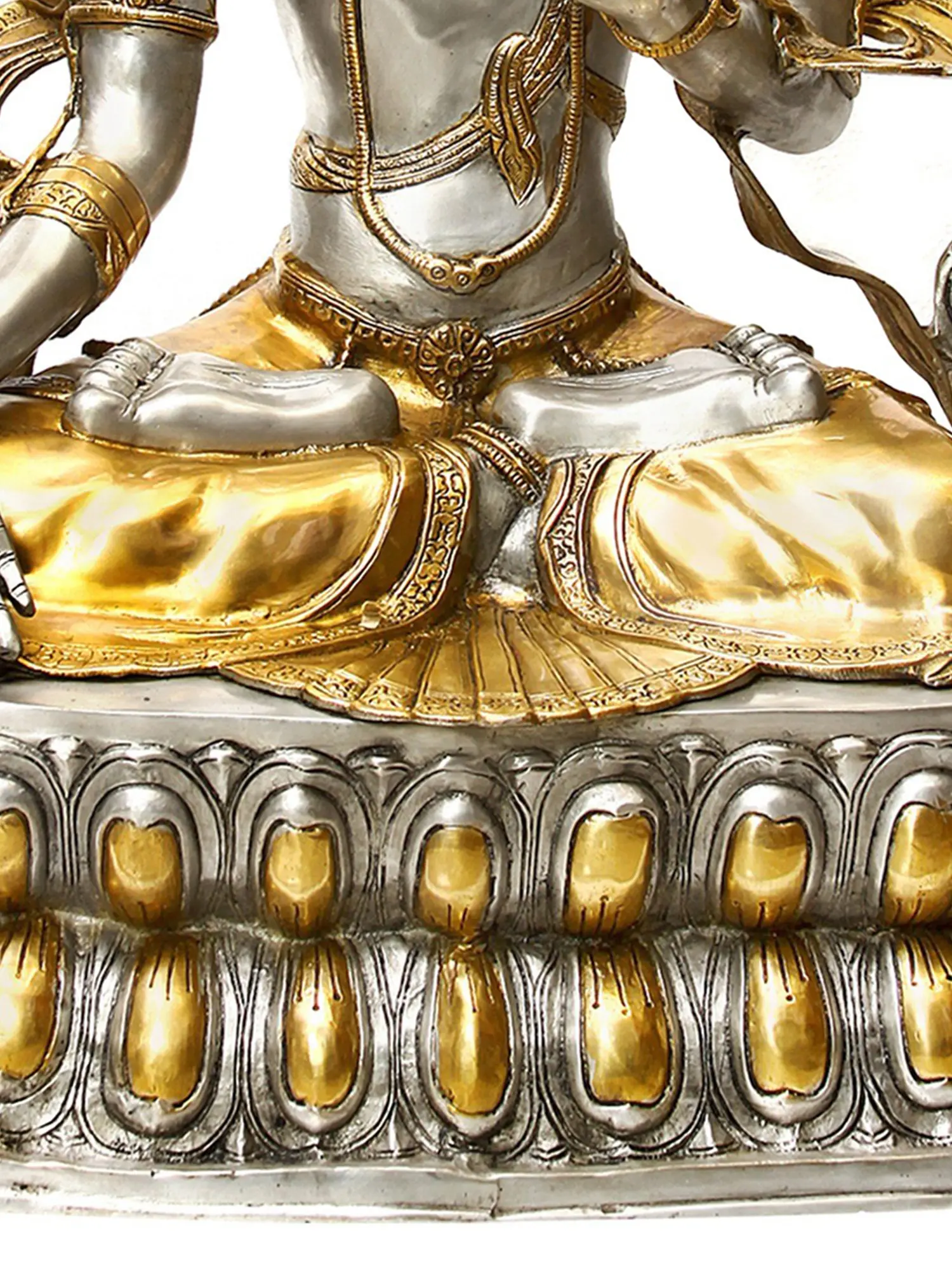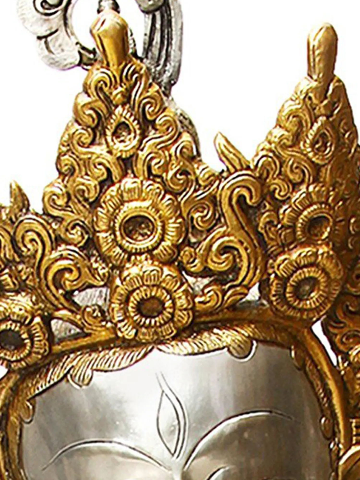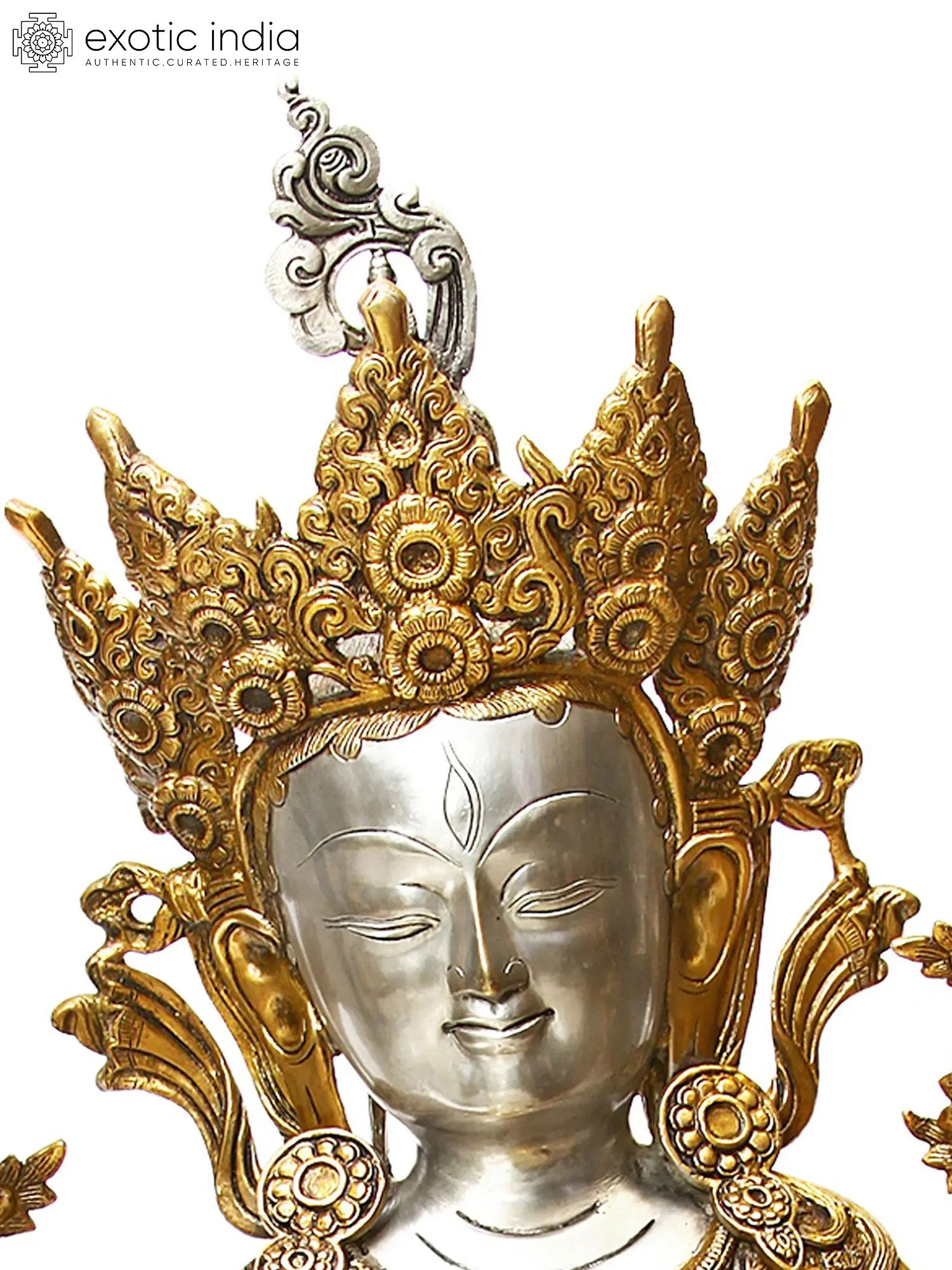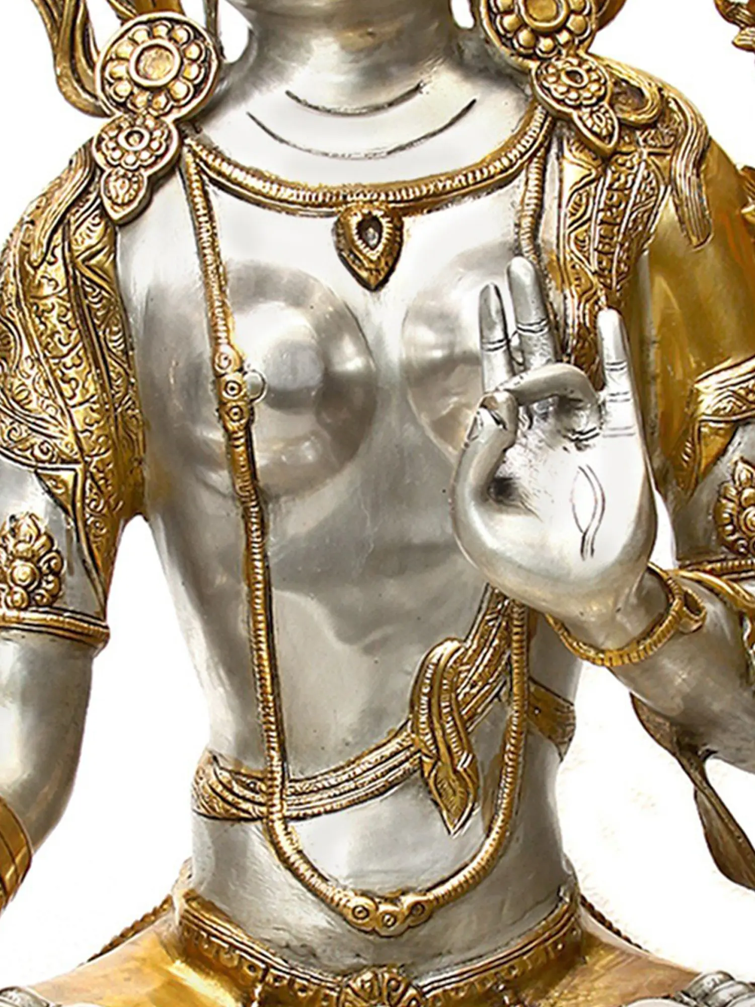 The bestower of longevity and protector of devotees of Buddha, goddess White Tara is one of the long-life deities in Vajrayana Buddhism. This divine brass statue presents her heavenly form in a beatific manner. White Tara is enthroned on a masterfully delineated lotus, on which her lithesome physique is gracefully postured and adorned with tasteful attire and ornaments. The balance of aesthetics in the golden and silver tones of the statue is brilliant, which amplifies the ethereal aura of White Tara, who smiles and fills the statue with a moving animation.