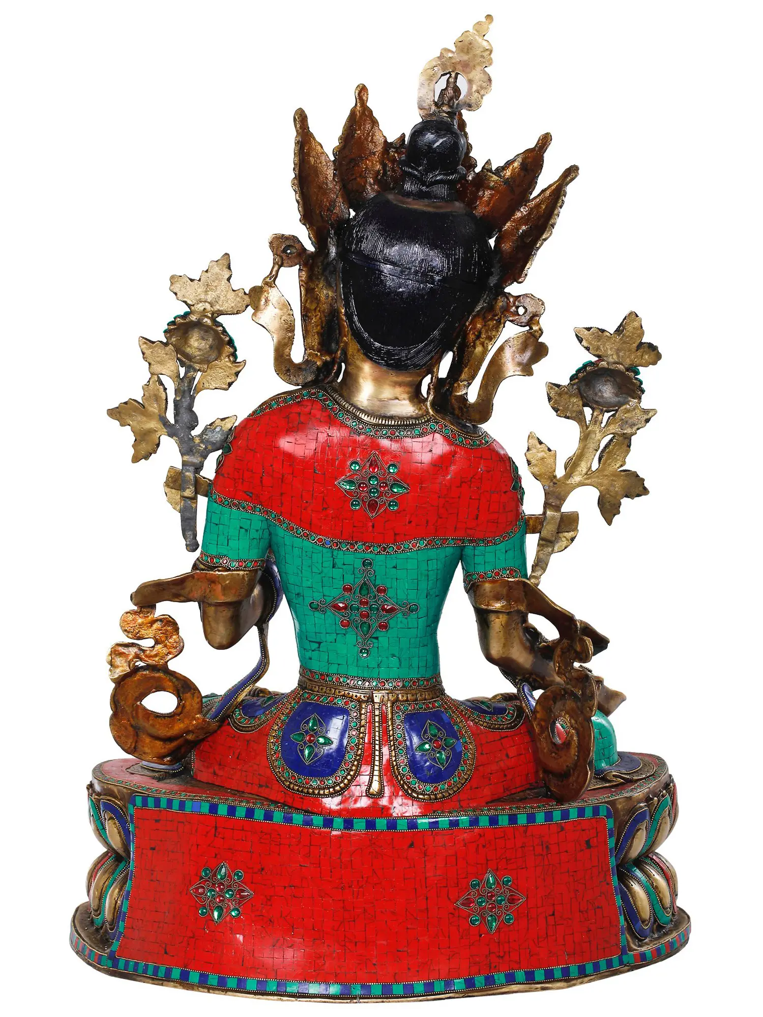This large-scale statue is more than just a decorative piece; it is a sacred object imbued with spiritual power and artistic brilliance. The skilled artisans have employed traditional techniques to bring this divine form to life, ensuring every curve and contour speaks of devotion. The use of high-quality brass provides a durable and lustrous foundation, while the meticulous inlay work adds depth, richness, and vibrant color. The lotus throne upon which she sits is elaborately decorated, symbolizing the foundation of her enlightened wisdom and the blooming of spiritual potential within all. The presence of such a statue in a home or meditation space can serve as a constant reminder of the qualities of compassion, wisdom, and swift action that White Tara represents. She is invoked to overcome obstacles, dispel fear, and grant long life. This remarkable sculpture is an invitation to connect with these profound energies and to cultivate a deeper sense of peace and spiritual fulfillment in your life. It stands as a testament to the enduring legacy of Tibetan Buddhist art and the timeless appeal of its sacred iconography.