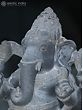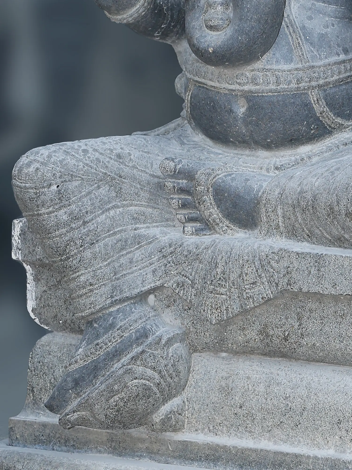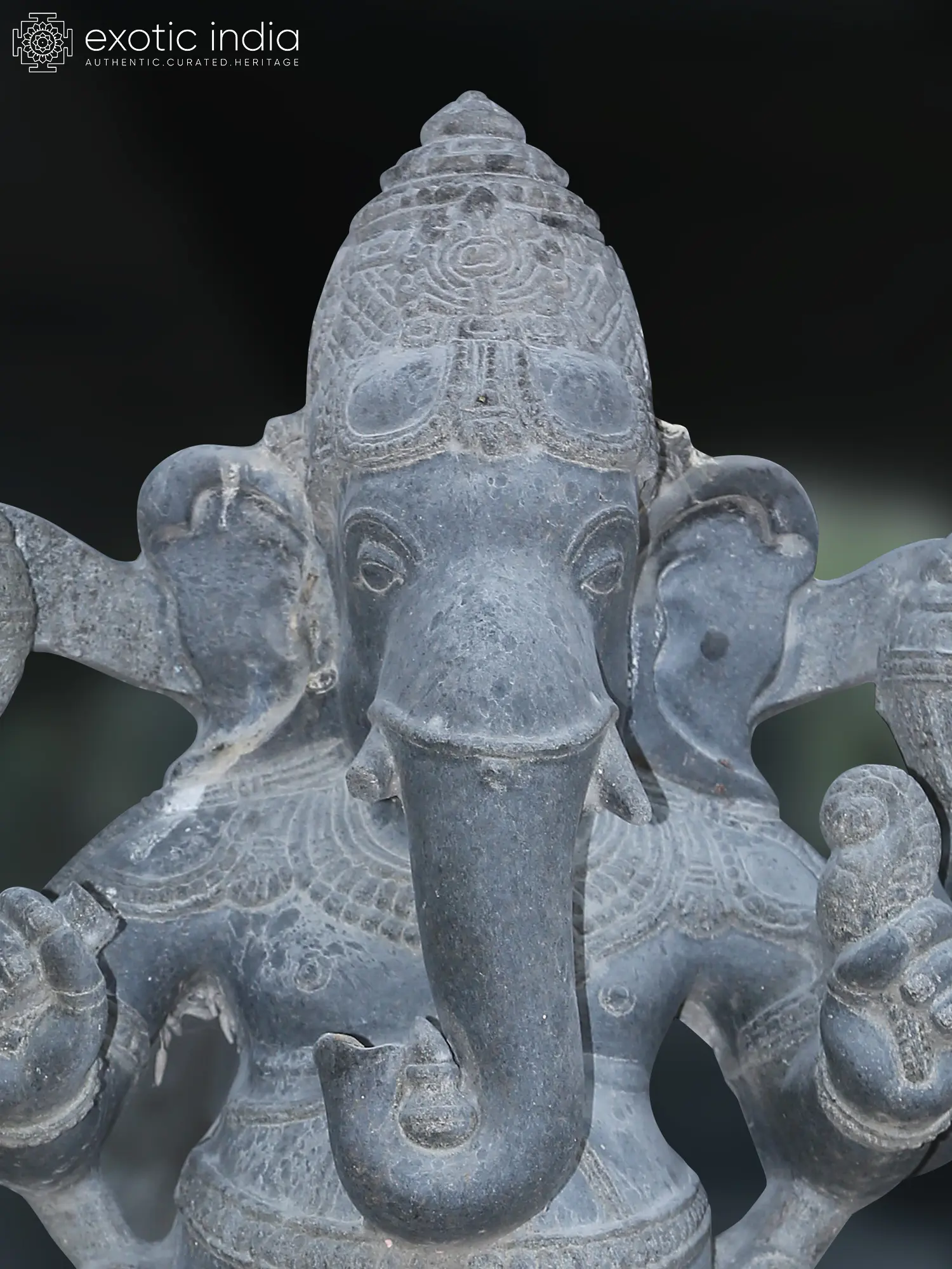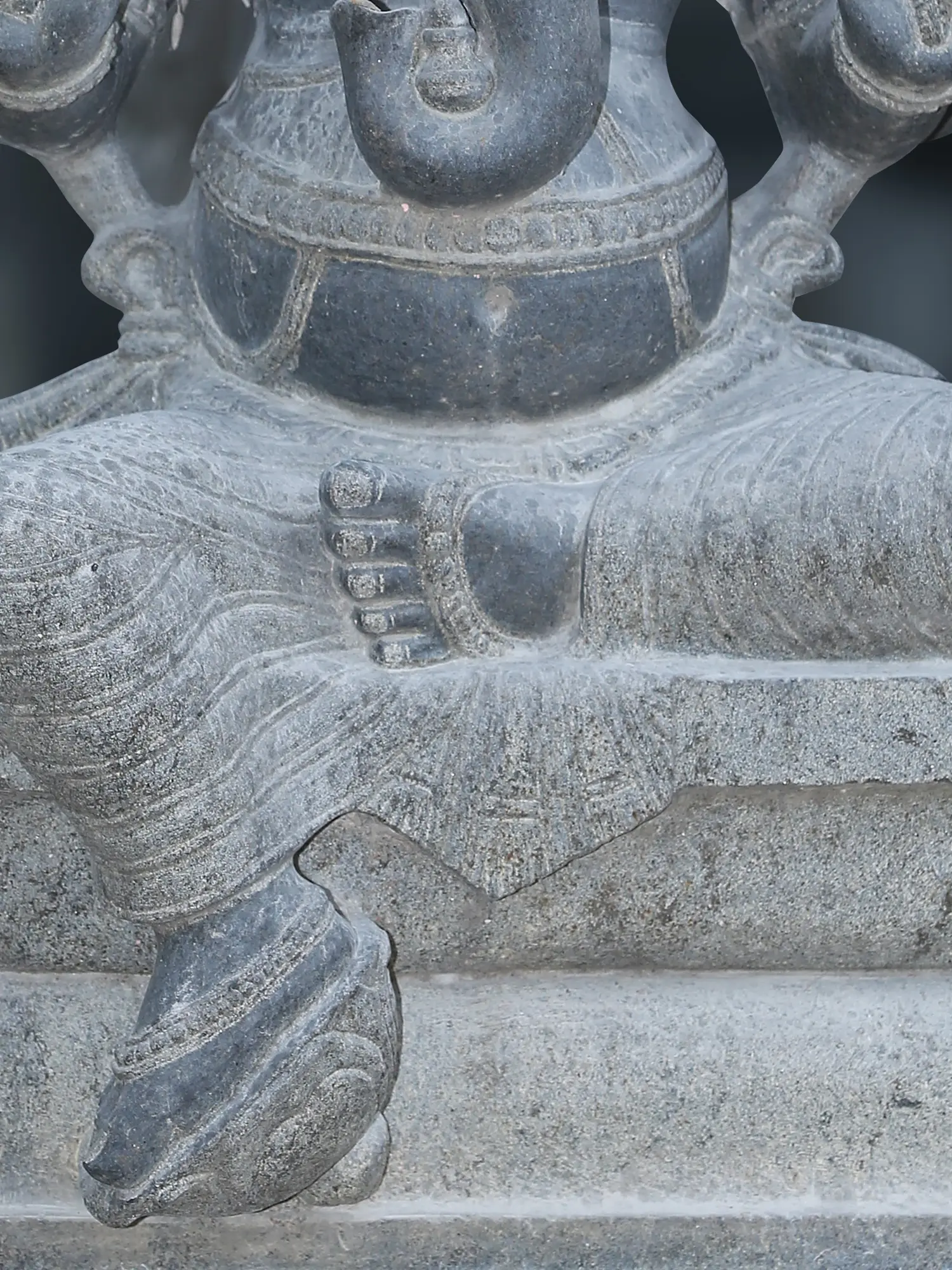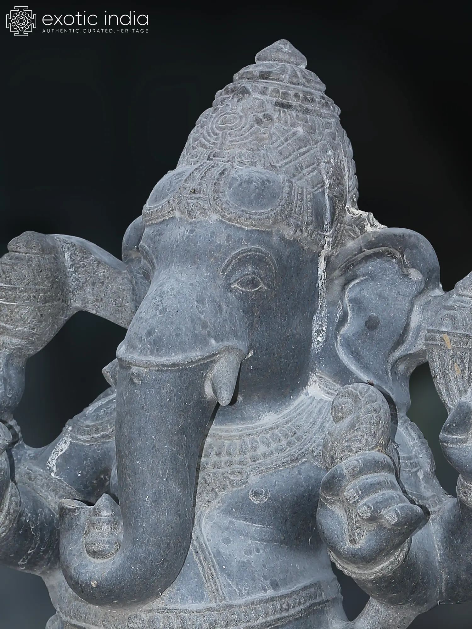 Vinayaka- the Lord of all beings, Sri Ganesha is presented in this regal granite sculpture as a king, enthroned on a two-tiered platform, and placed on another lotus pedestal, giving the statue an iconic presence.
