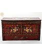 Dominating the forefront of the chest are two powerful Snow Lions, rendered in striking gold and green against the fiery red background. In Tibetan mythology, the Snow Lion is a sacred animal, one of the "Four Dignities" that represents fearlessness, unwavering joy, and the ability to overcome obstacles. These magnificent beasts are often depicted guarding the Dharma, protecting sacred texts, and symbolizing the enlightened mind. Their fierce yet noble presence on this chest suggests it is a guardian for the precious items it holds, be they devotional objects, important documents, or personal treasures. The swirling, cloud-like patterns surrounding the lions further enhance their celestial and protective aura.