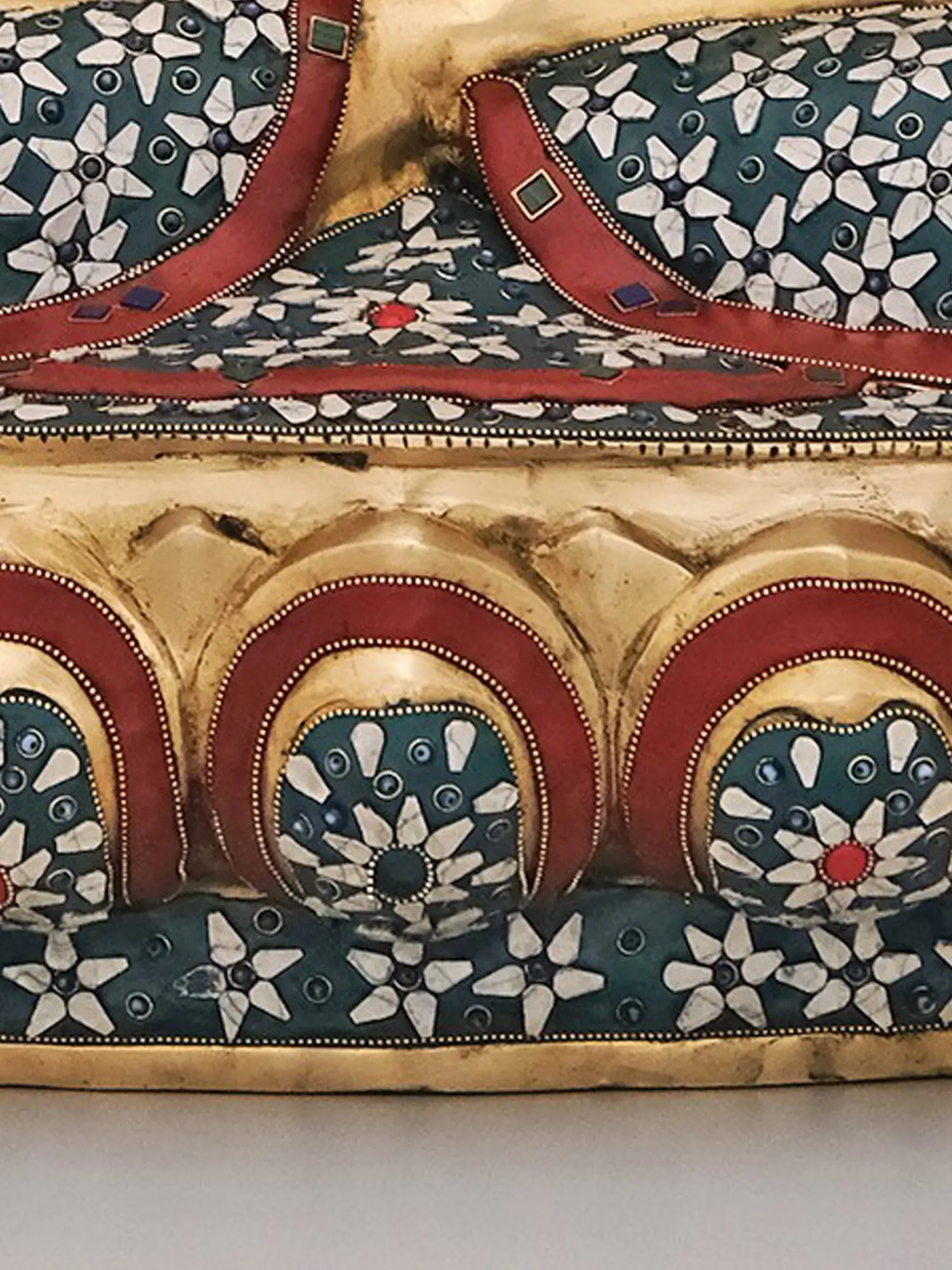 Crafted from high-quality brass, this statue is not merely a representation but a testament to the intricate artistry passed down through generations. The gleaming brass forms the perfectly sculpted figure of the Medicine Buddha, seated in a posture of profound peace. What truly elevates this piece is the stunning inlay work adorning his monastic robes and the lotus throne. Delicate patterns of vibrant colors and precious materials are meticulously set into the brass, creating a rich tapestry of visual splendor. The intricate floral motifs and contrasting hues speak of skilled craftsmanship, where every detail is thoughtfully placed to enhance the spiritual aura of the deity. ––––––––––––––––––