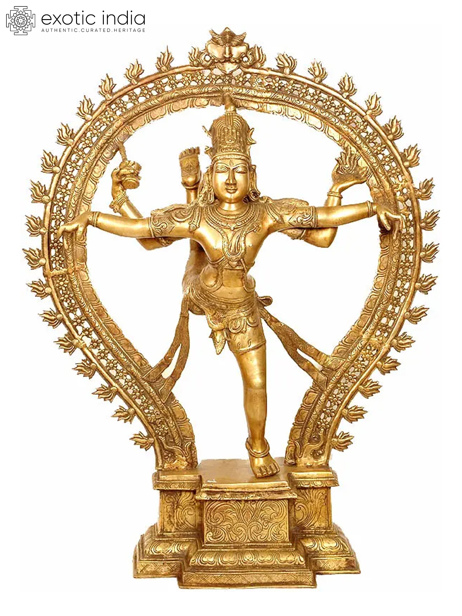 This powerful image of Lord Shiva, passionately engaged in a dance with his left leg fixed on the pedestal, not on the figure of Apasamarapurusha, a subordinate icon symbolising inertia or forgetfulness usually appearing in Nataraja iconography, and the right, turned backward, almost to hundred eighty degrees, has been installed inside a fire-arch rising from a pedestal consisting of moulded base and is topped by a Shri-mukha motif representing good and auspiciousness.