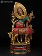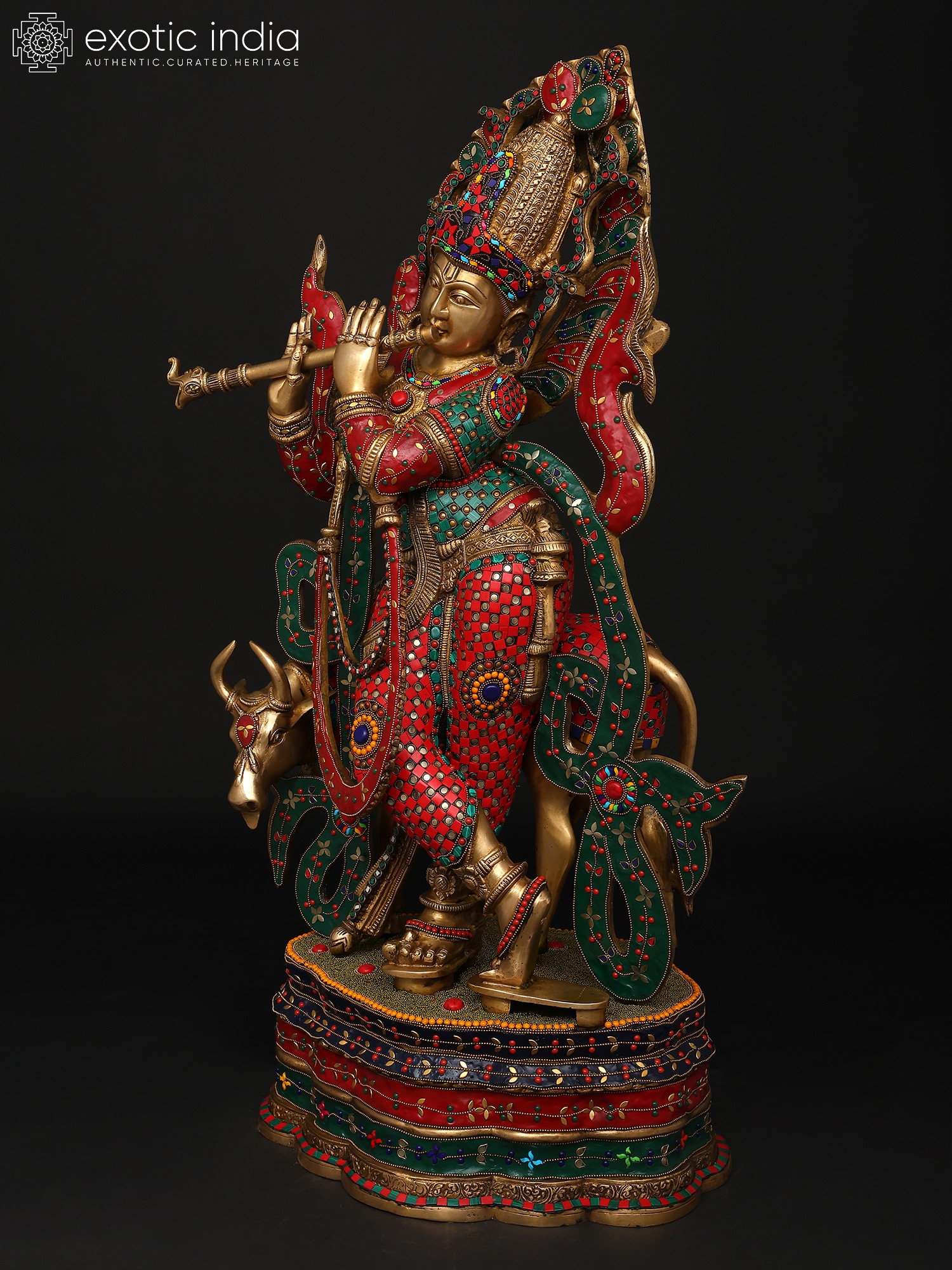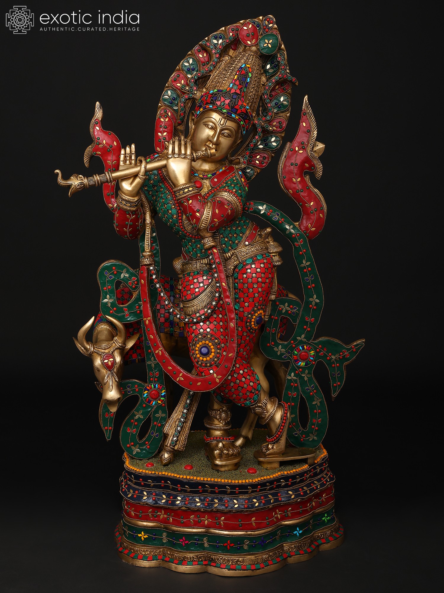 Behold a vision of divine serenity and vibrant artistry, brought to life through the skilled hands of master artisans. This striking statue captures a beloved moment from the life of Krishna, the eighth incarnation of Vishnu and one of the most revered deities in the Hindu pantheon. Depicted here is Venugopal, Krishna as the protector of cows, playing his enchanting flute. Krishna, whose very name evokes "the all-attractive," is celebrated for his wisdom, his playful nature, and his profound love for all beings. His stories resonate throughout Indian culture, from the epic Mahabharata, where he guides Arjuna on the battlefield, to the pastoral scenes of Vrindavan, where he charms the gopis (milkmaids) with his divine music.