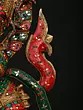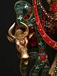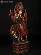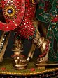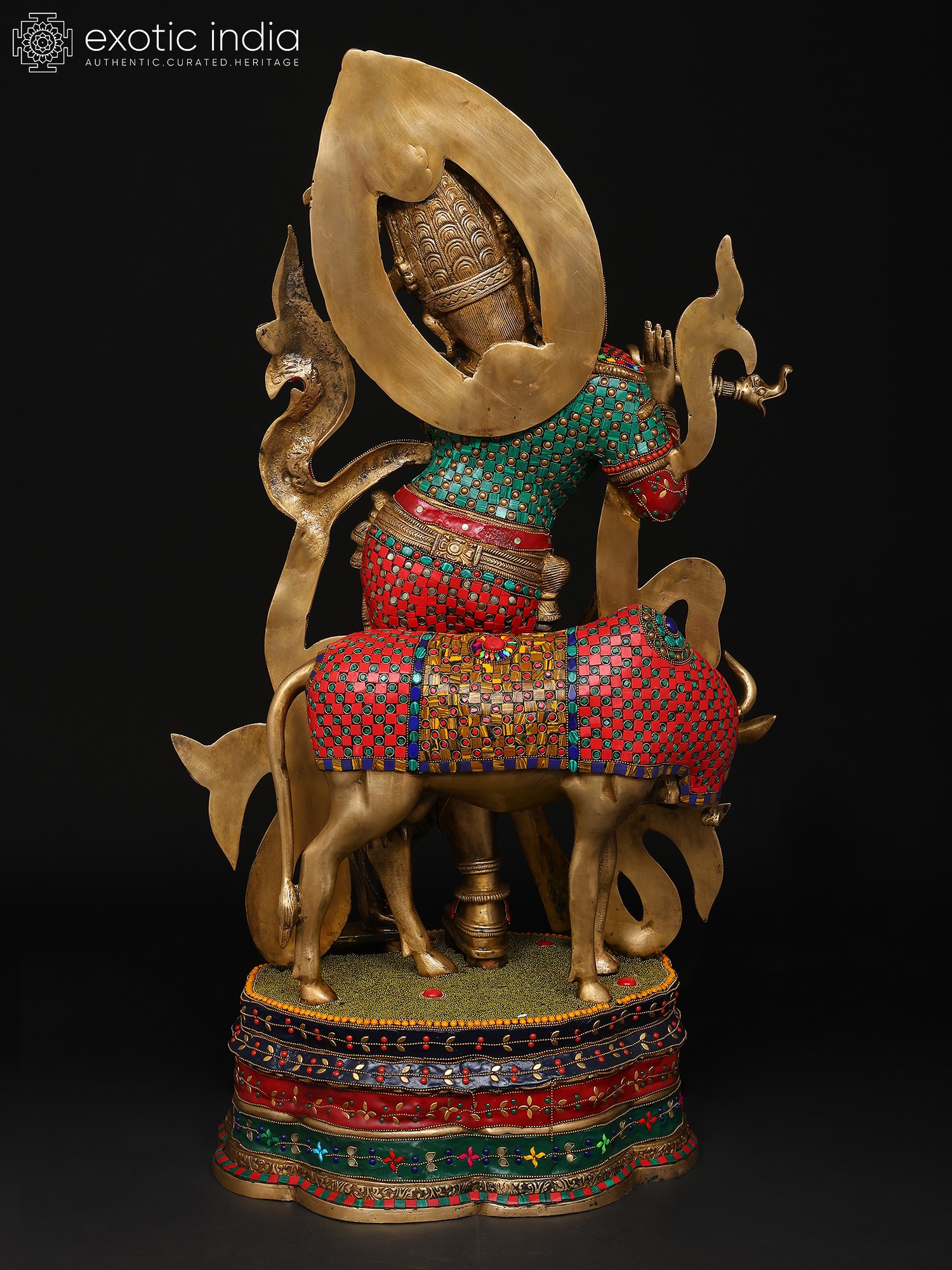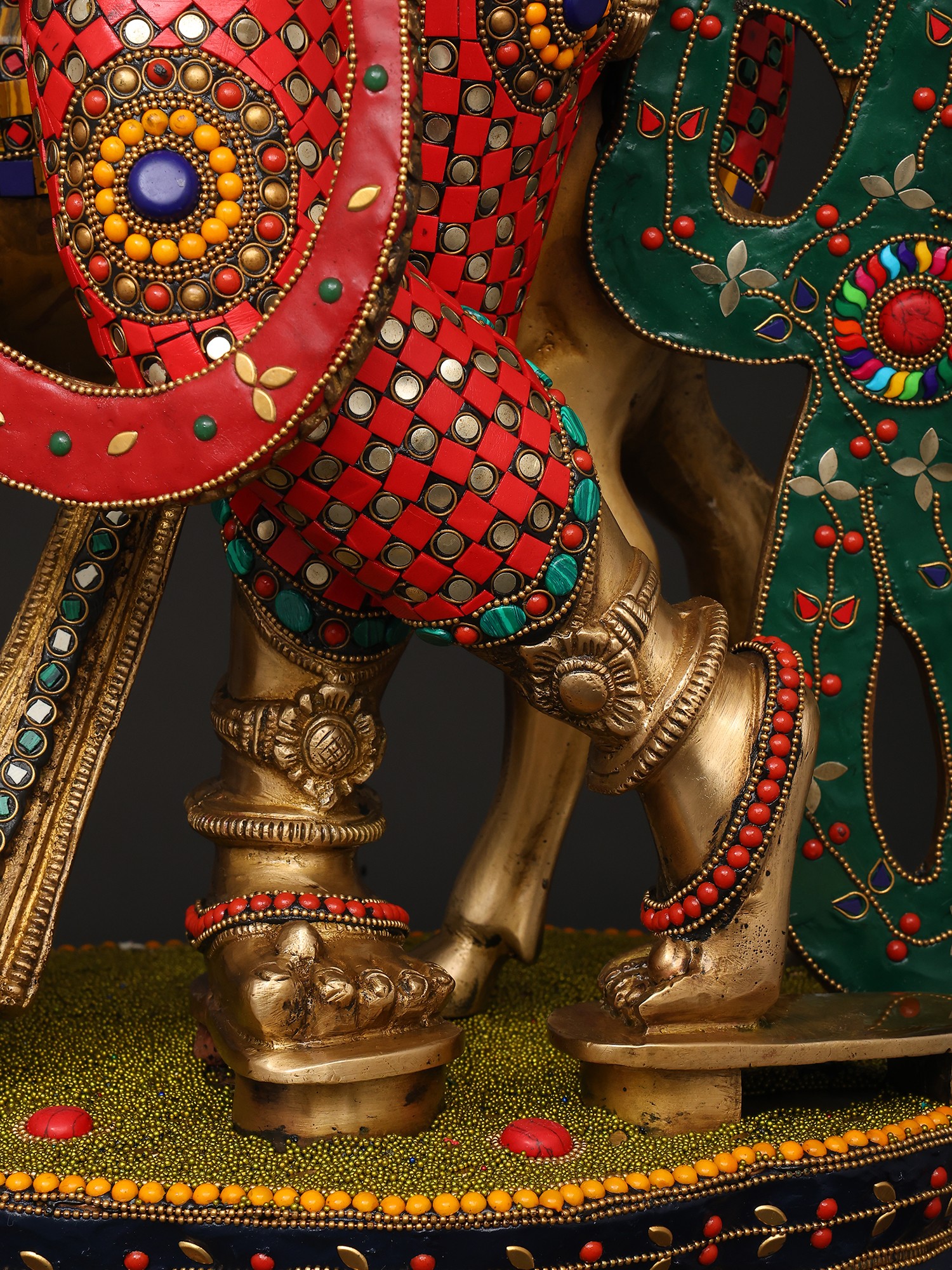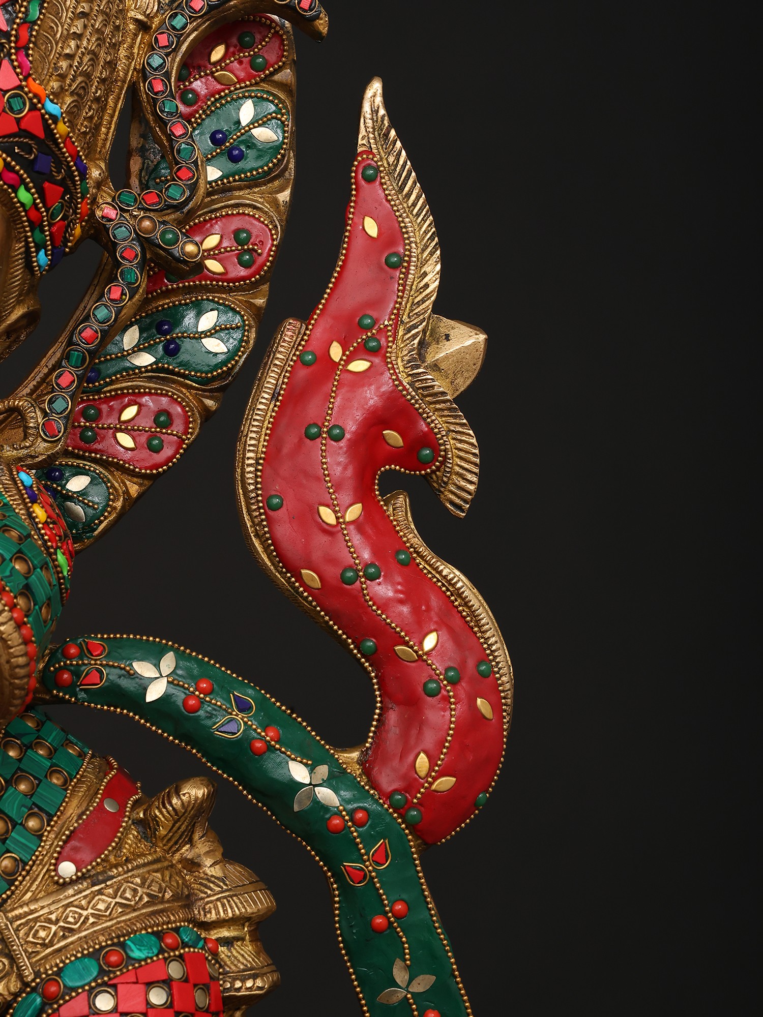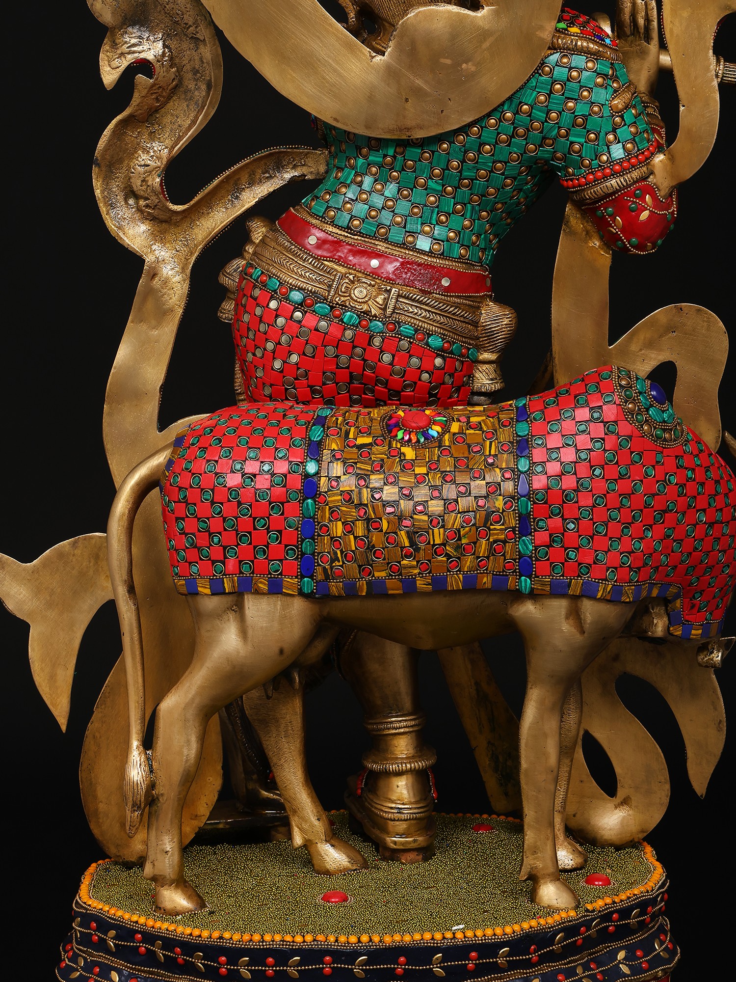 Crafted from brass, this statue is a testament to the enduring legacy of Indian metalworking. The intricate inlay work is a distinguishing feature, adding depth, color, and texture to the sculpture. Each gemstone is meticulously placed, creating a dazzling mosaic of colors that enhance the beauty of the piece. The vibrant hues of red and green create a visual symphony, adding to the regal and playful nature of the sculpture. This piece is an exquisite representation of devotion and artistic mastery, a work of art meant to inspire and uplift.