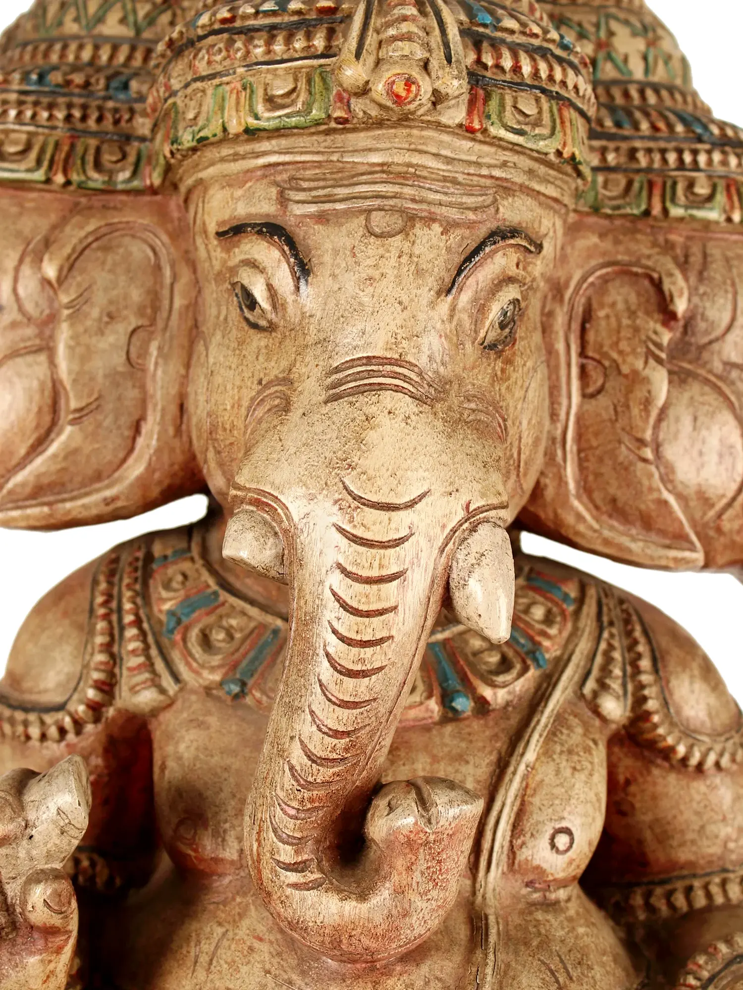 34" Large Wooden Sitting Three Heads Lord Ganesha