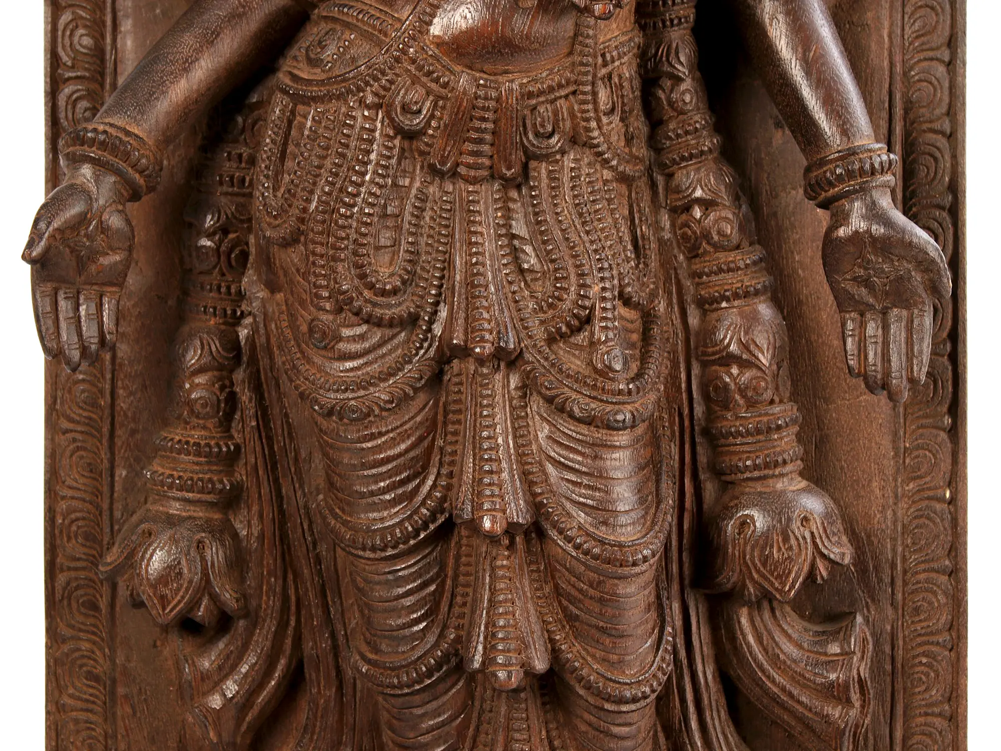 Immerse your space in the divine presence of Lakshmi, the revered goddess of wealth, fortune, and prosperity, through this magnificent wooden wall panel. Exquisitely carved from a single piece of wood, this sizable artwork stands as a testament to the skilled craftsmanship and deep spiritual traditions of India. The goddess is depicted in her serene and benevolent form, radiating an aura of abundance and well-being. Her multiple arms, a common representation of her omnipotence and ability to bestow blessings from all directions, are adorned with intricate jewelry, each detail meticulously rendered by the artisan's hands.