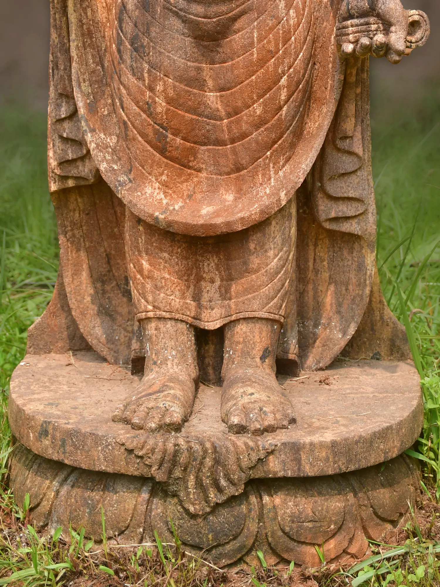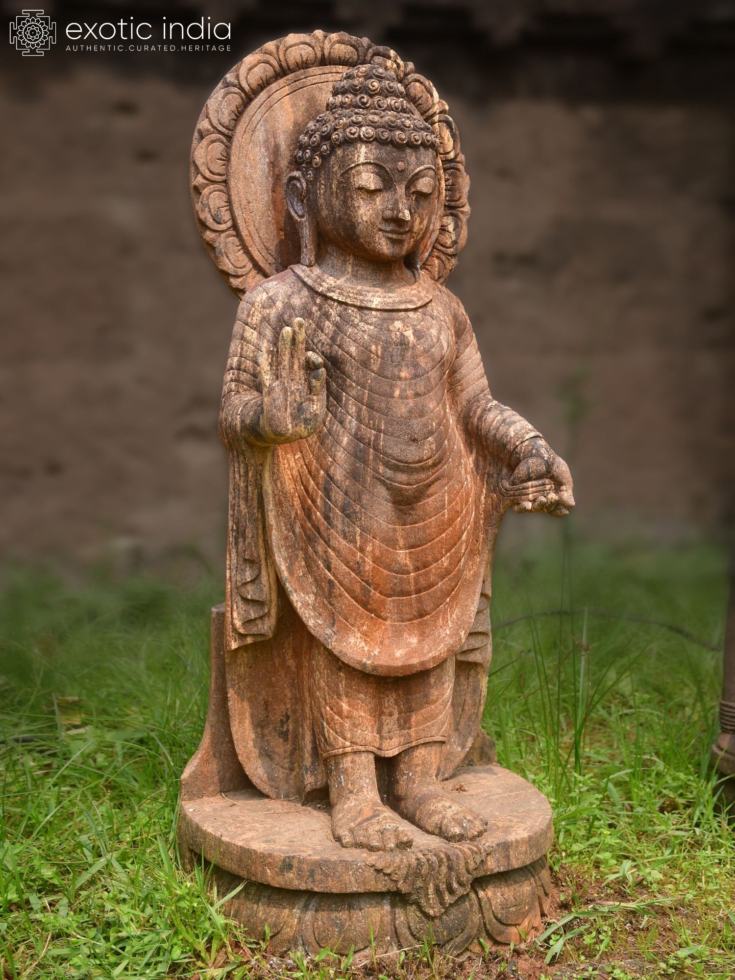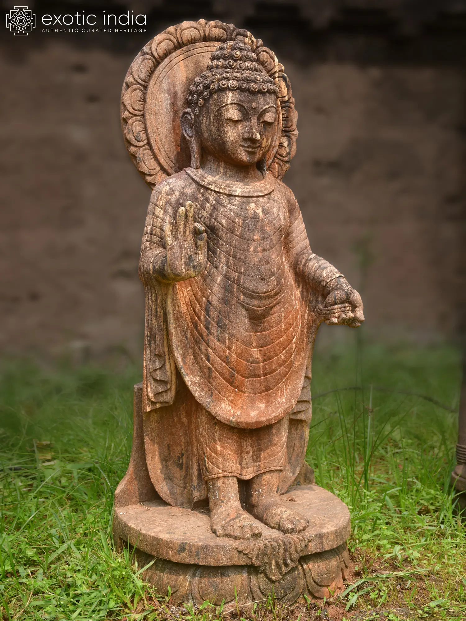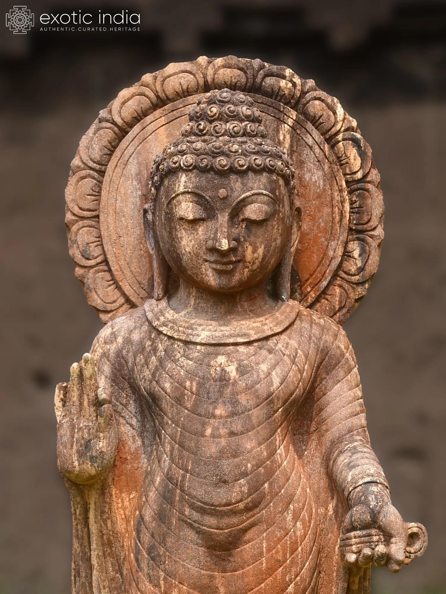 Standing at an impressive 35 inches tall, this piece possesses a substantial yet graceful presence. The subtle variations in the natural sandstone create a rich tapestry of texture and tone, inviting you to explore its surface. The sculpted halo, adorned with intricate patterns, frames a visage of unparalleled peacefulness, drawing the eye and commanding admiration. The gentle gesture of blessing, with one hand raised and the other holding an object of significance, conveys a message of profound wisdom and compassion.