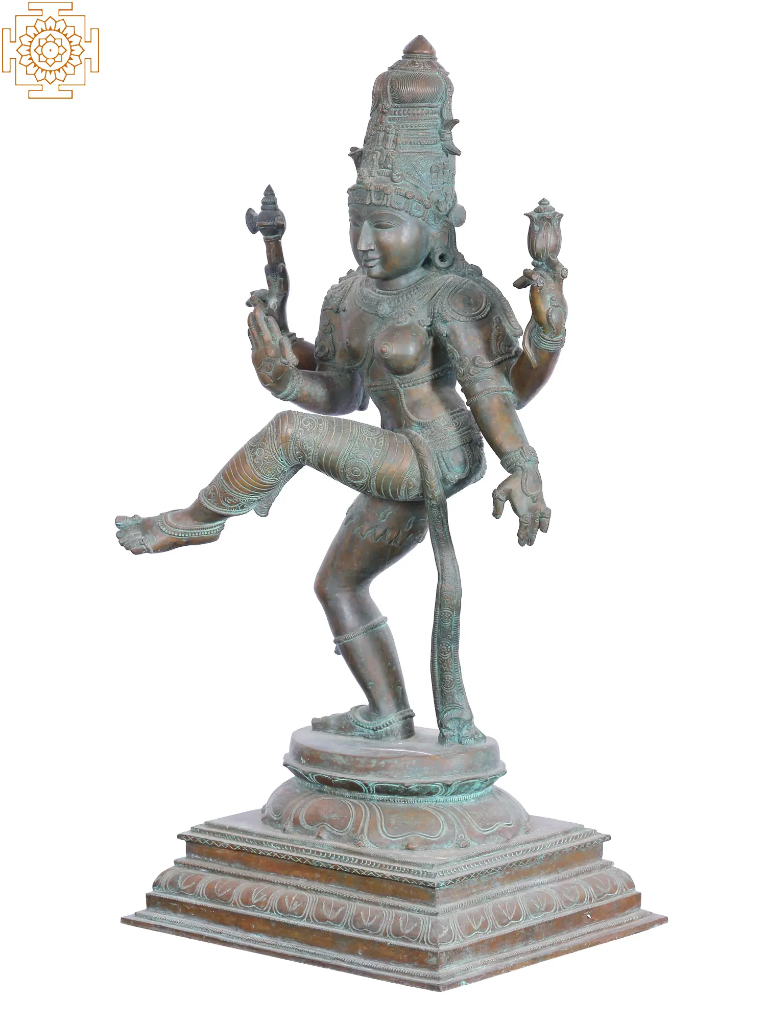 Crafted from Panchaloha, a sacred alloy comprising five metals—gold, silver, copper, zinc, and tin—this bronze statue possesses a unique luster and inherent spiritual significance. Panchaloha is traditionally believed to have auspicious properties, and its use in deity forms is considered highly meritorious. The bronzes from Swamimalai, a village in Tamil Nadu, India, are globally acclaimed for their exceptional artistry, fidelity to scriptural descriptions, and the timeless beauty of their Patina. This tradition dates back centuries, with artisans drawing inspiration from the classical Chola bronzes, which are celebrated for their fluidity and divine grace. The dynamic posture of Ardhanarishvara, with one leg raised in a graceful dance and the other firmly planted, conveys a sense of eternal movement and cosmic rhythm. The deity's multiple arms are adorned with symbolic implements, further enriching the narrative of this divine form. The left side, representing the feminine aspect of Parvati, is depicted with delicate ornamentation and softer features, while the right side, embodying the masculine power of Shiva, exhibits a more robust form. This masterful rendition in Panchaloha bronze, executed with the lost-wax technique, makes this Ardhanarishvara a truly awe-inspiring and spiritually resonant piece, fit to grace any sacred space or discerning collection. The inherent Patina developed over time adds to its antique charm and perceived antiquity.