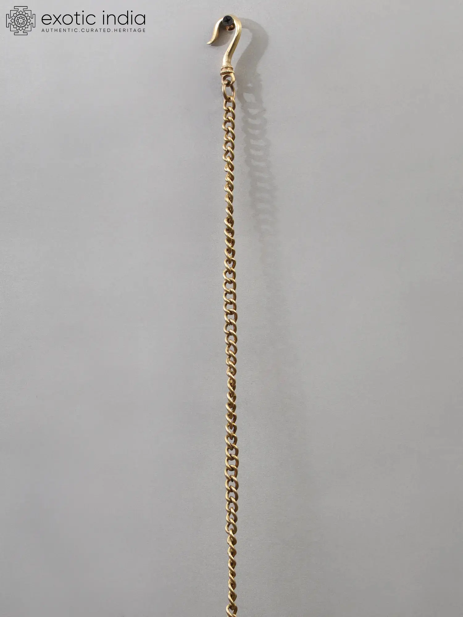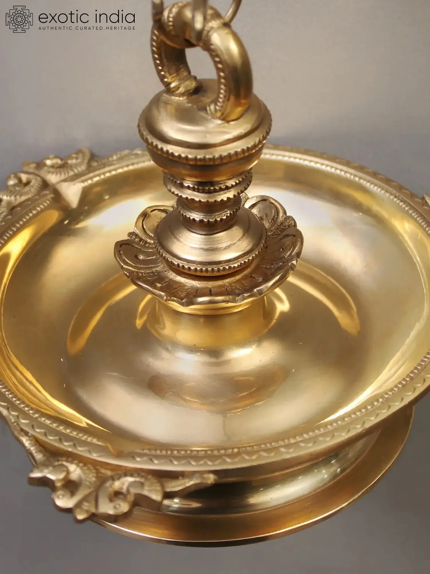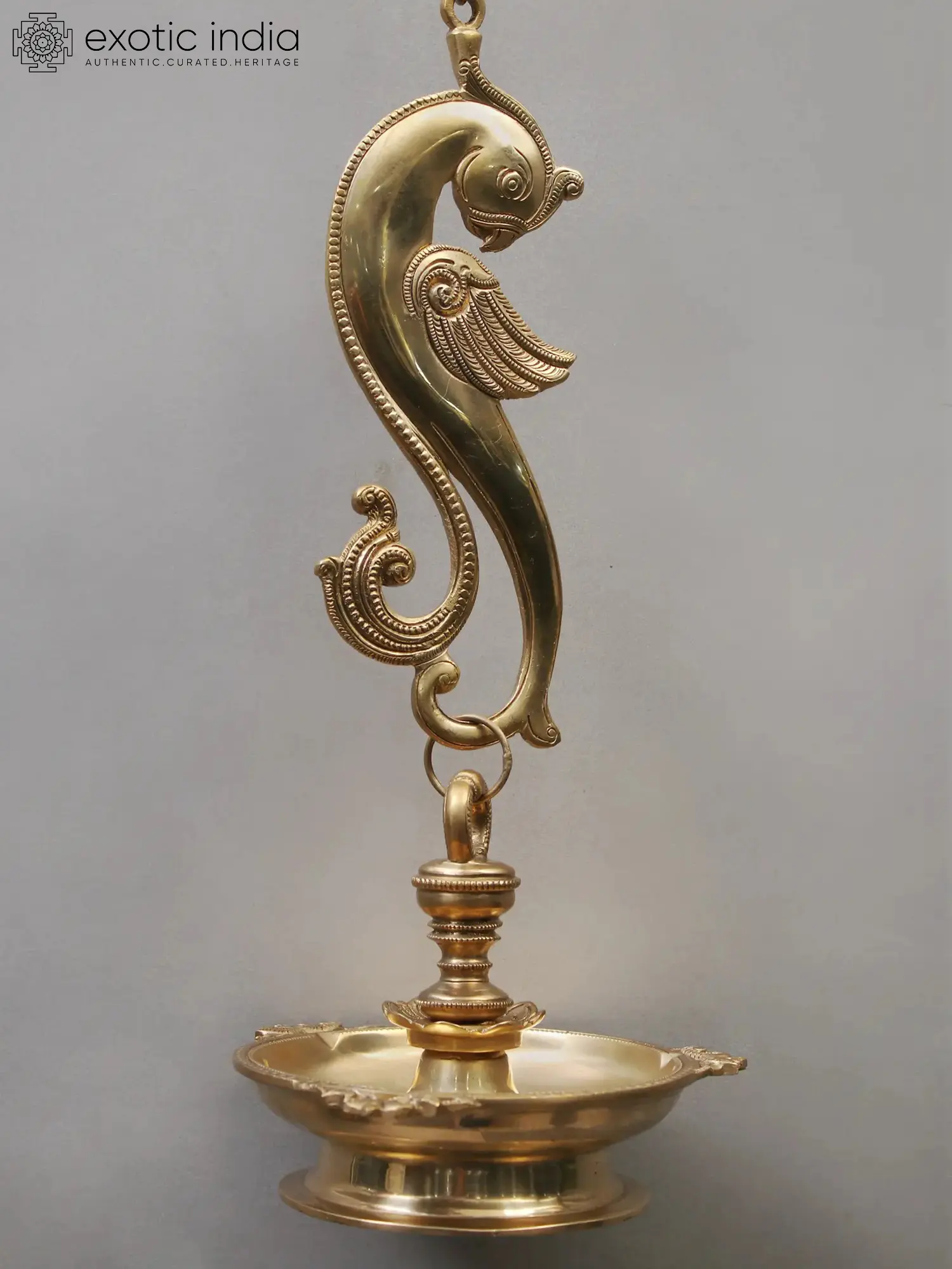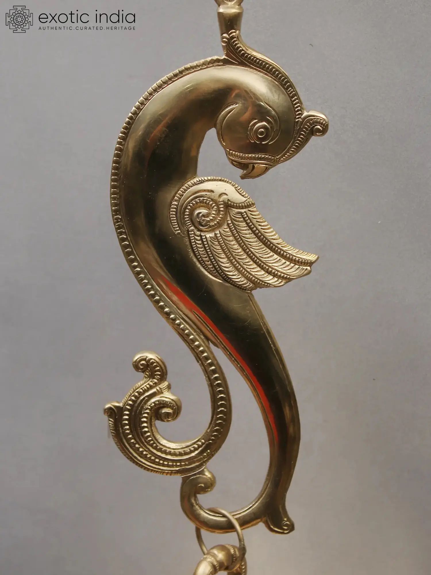 As a Vahana of Kamadev, the parrot is a symbol of Love in Indian tradition. The parrot is held by Goddess Kamakshi of Kanchipuram in her right hand. Courtship, love, and passion are all connected with the parrot theme. This three-wick designer brass lamp with a stylized parrot emblem on top has a round oil bowl. A handful of parrots are also depicted as embellishments on the wicks. It is a hanging light with a strong chain for the same purpose. It has a delicate matt gold hue and looks exquisite. Lighting this lamp or utilizing it as a decorative object would undoubtedly bring the almighty's blessings.