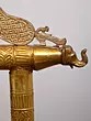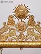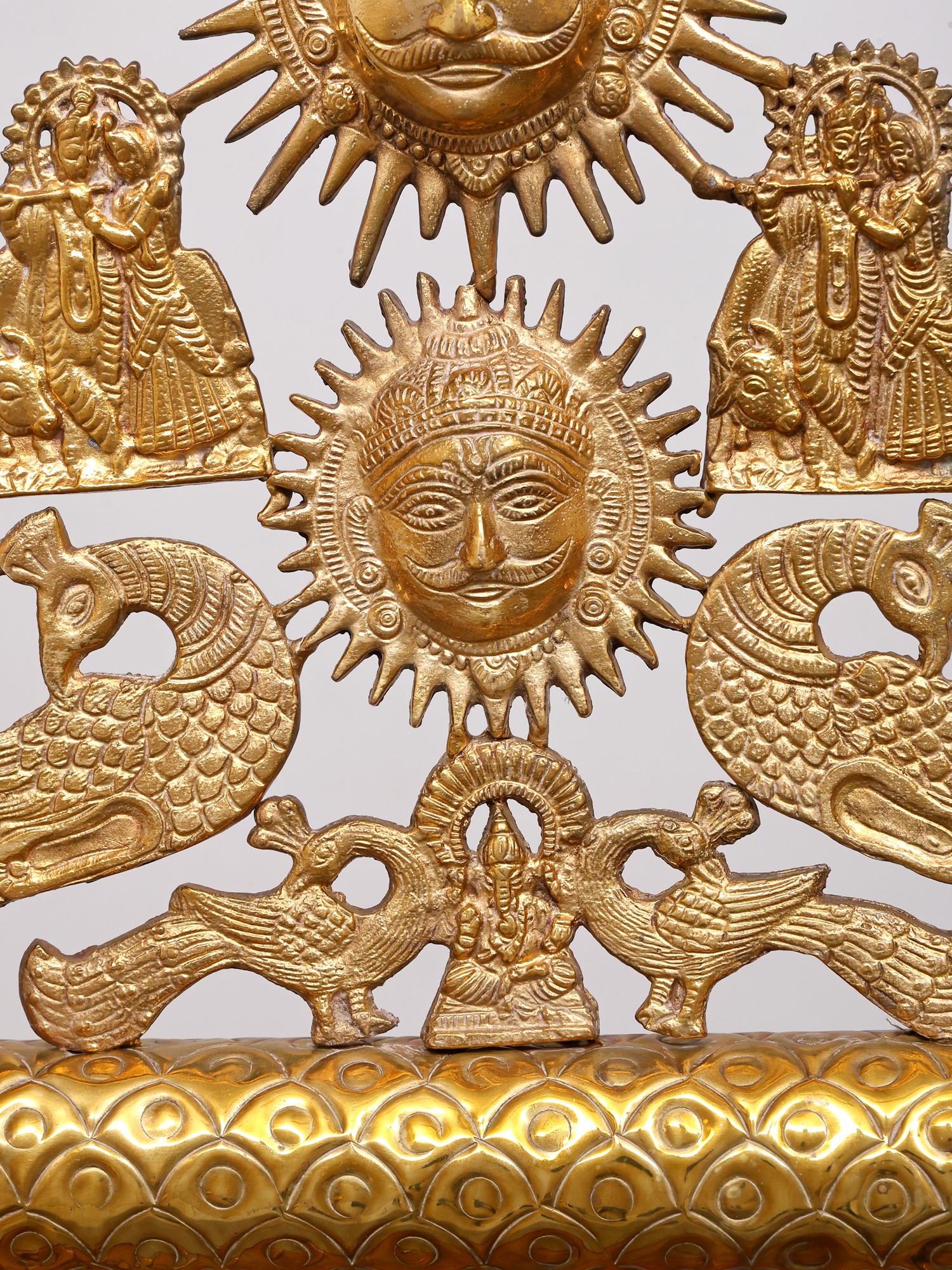 Dominating the apex, the radiant Sun God Surya, flanked by celestial attendants and graceful peacocks, imbues the structure with cosmic energy and auspiciousness. The sun's benevolent gaze and the peacocks, symbols of beauty and immortality, create a harmonious visual narrative. The gently curved seat, designed for regal comfort, is further embellished with a diamond-shaped motif, adding a subtle yet sophisticated textural dimension. The overall structure stands at an impressive 36 inches, commanding attention and reverence.