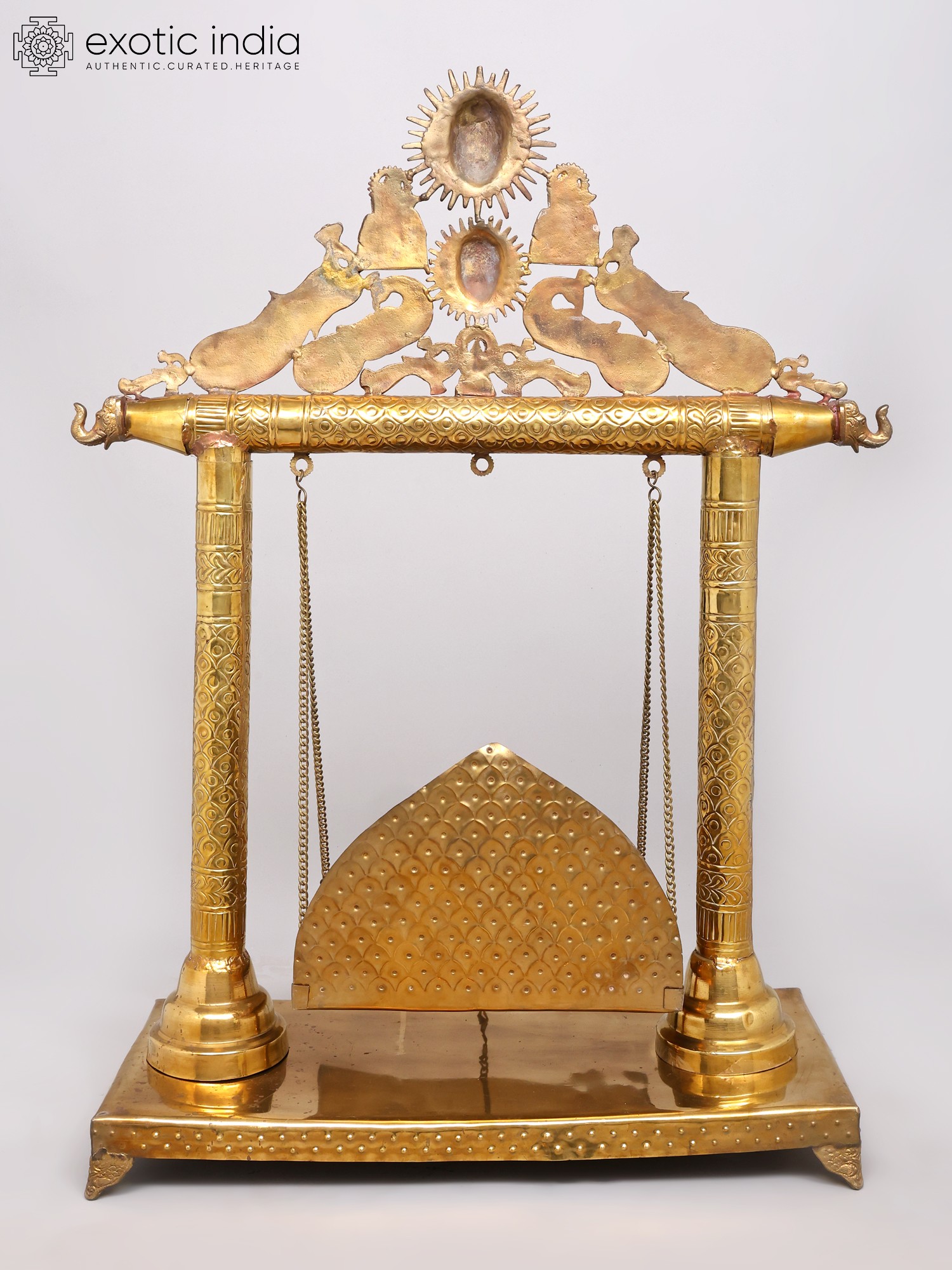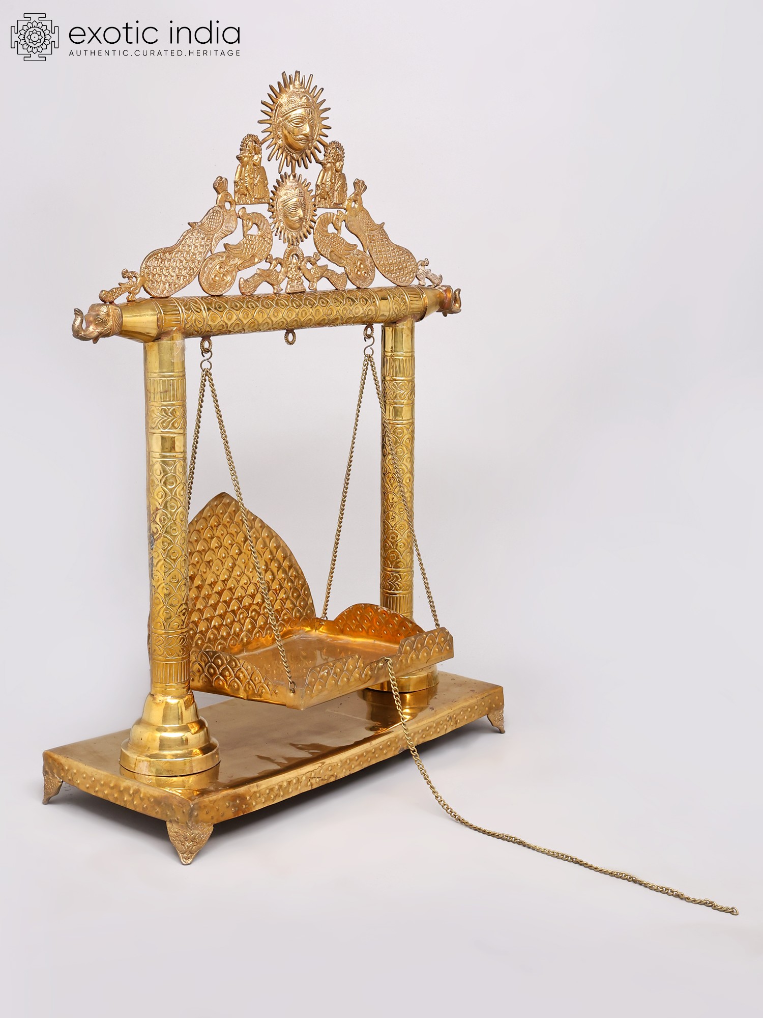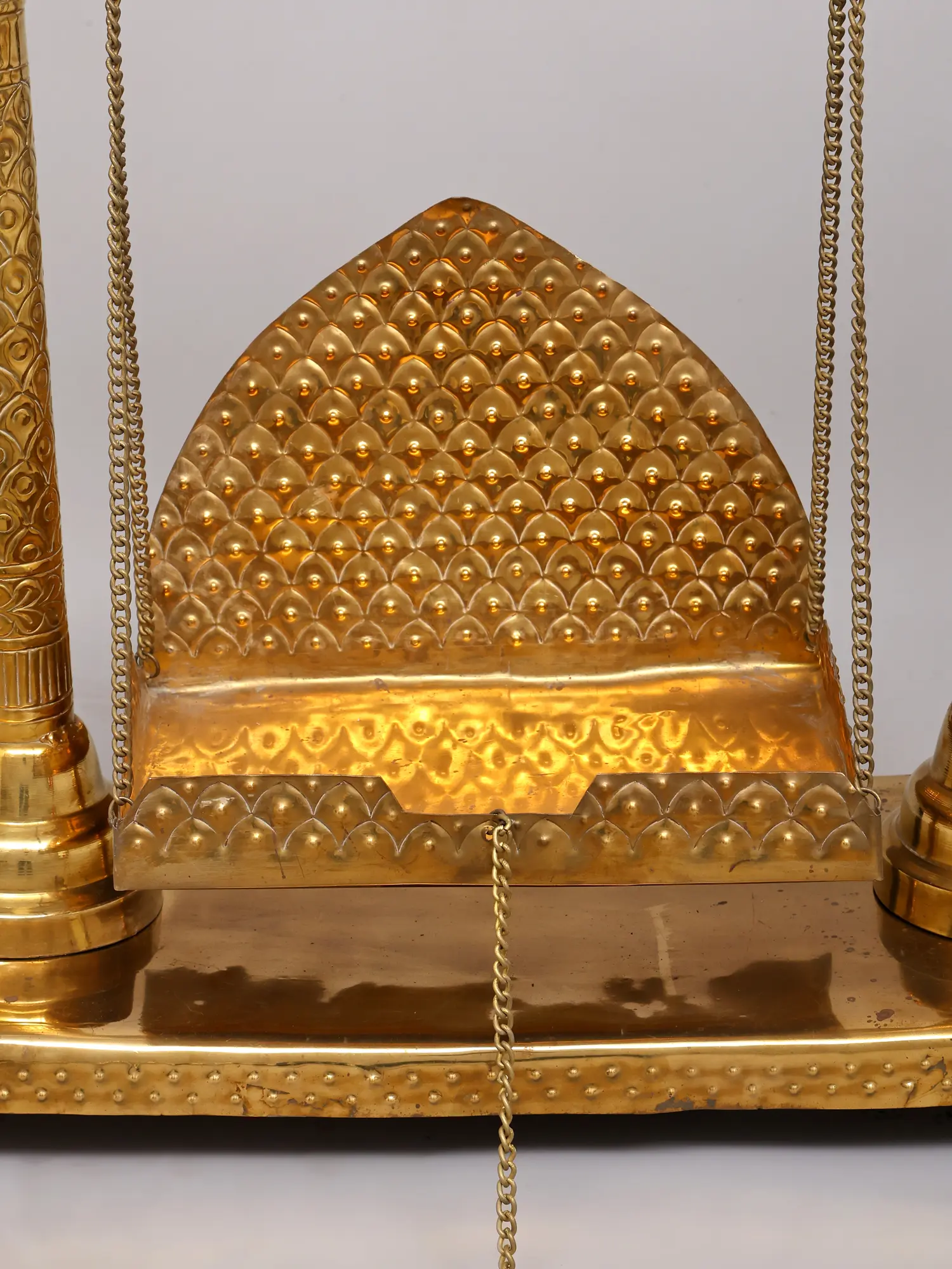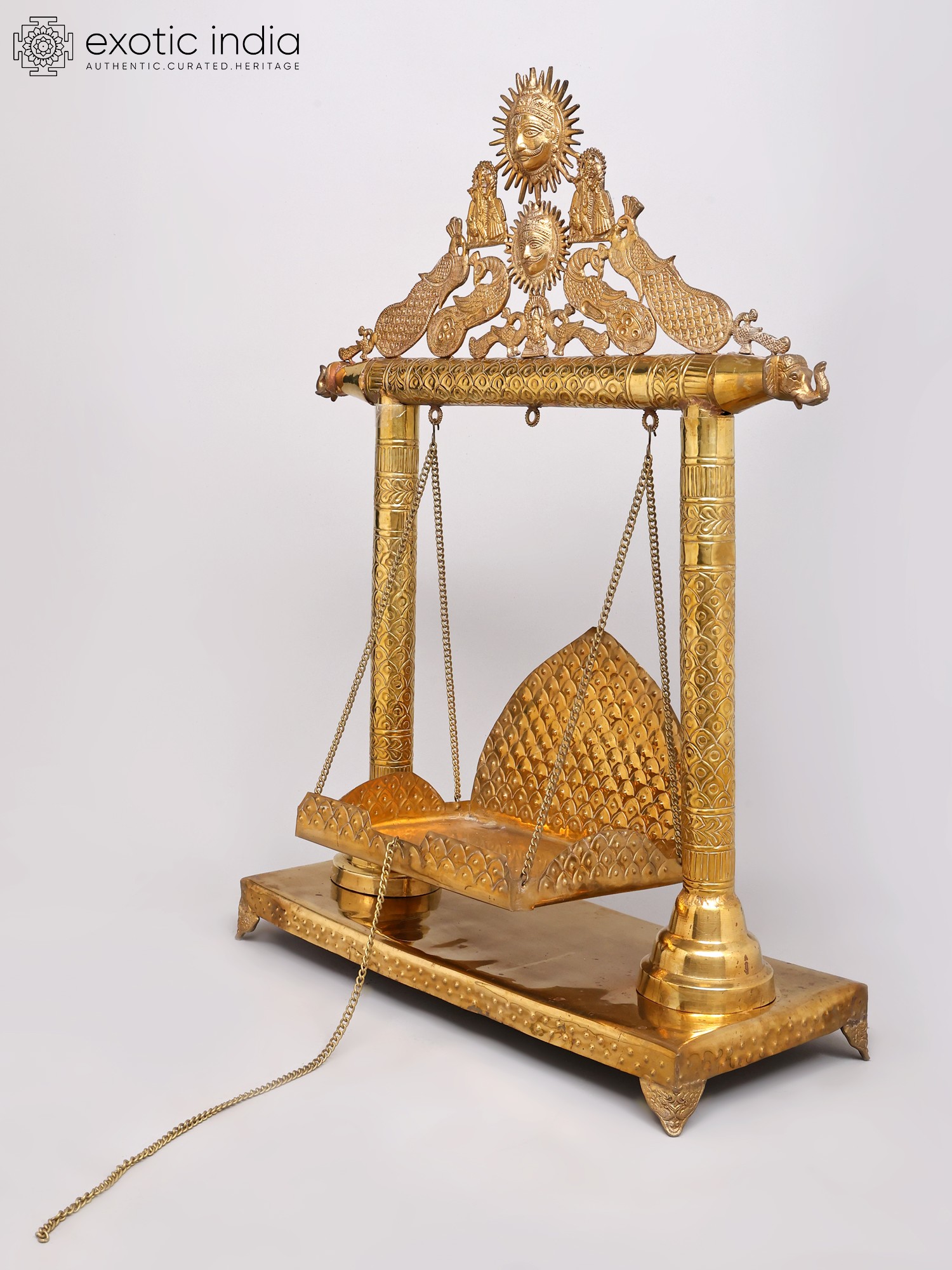 Each element of this magnificent swing is meticulously handcrafted by master artisans, their skill honed over generations. Fashioned from solid brass, a material revered for its purity and longevity, it possesses a weight and presence that speaks of its intrinsic value. The intricate detailing, from the embossed patterns on the pillars to the delicate filigree work adorning the canopy, reflects an unparalleled dedication to artistic excellence.