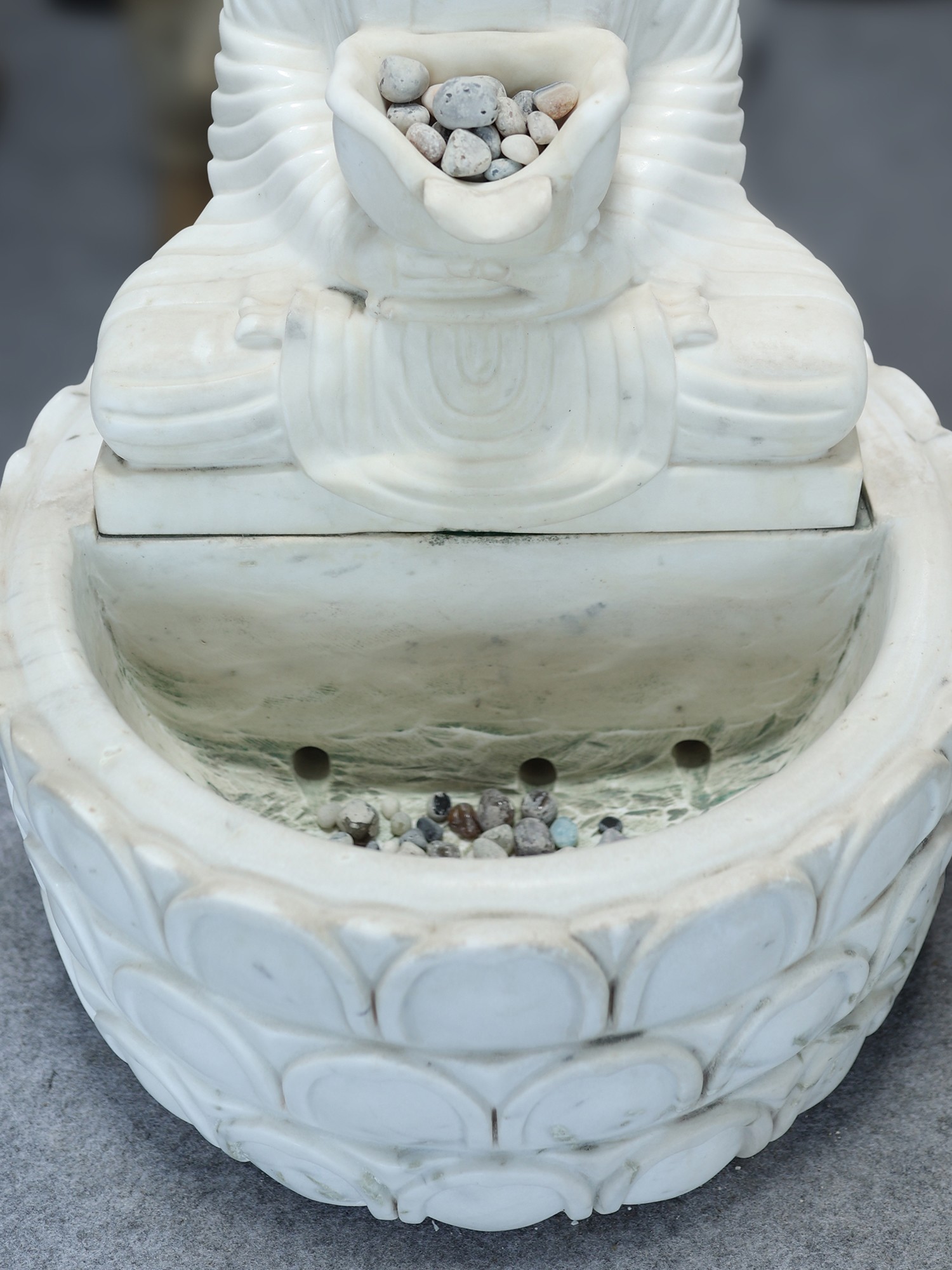 The serene depiction of the seated Buddha, rendered in lustrous marble, is breathtaking. Its significant height, reaching 36 inches, ensures it commands attention without overwhelming the senses. The integrated water feature, subtly flowing from the bowl held in the Buddha's hands into the intricately carved lotus base, creates a mesmerizing, tranquil soundscape. The overall dimensions of 23 inches in width and depth allow for an impressive yet balanced display.