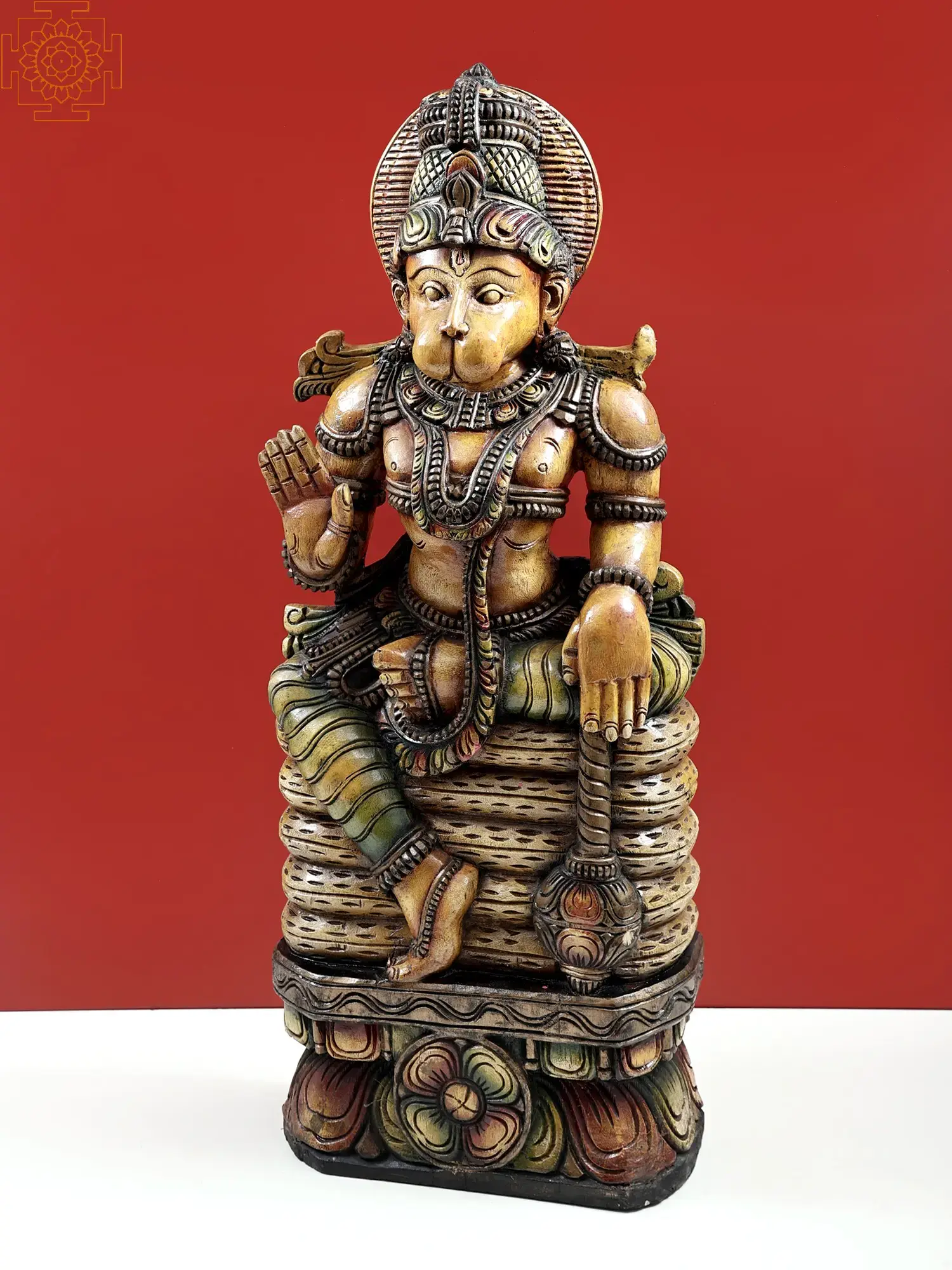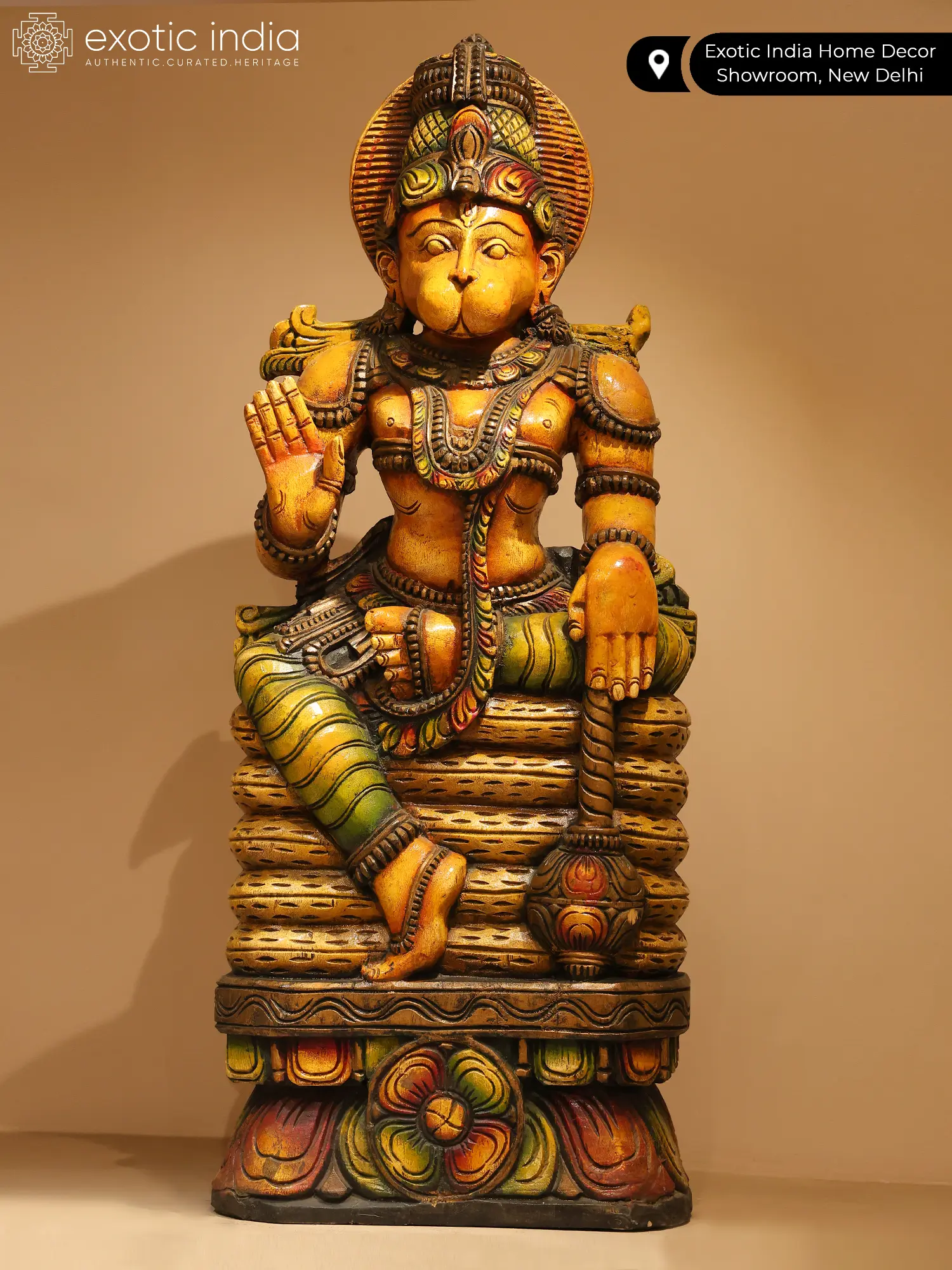This Hanuman murti is carved from Vengai wood. It is a type of wood that is endemic to South India and is believed to have mystical qualities. It is, after all, an organic medium and quite the challenge to breathe life into. As such, the artisan has poured a great degree of both skill and shraddha into this precisely formed, almost lifelike image of Hanuman.